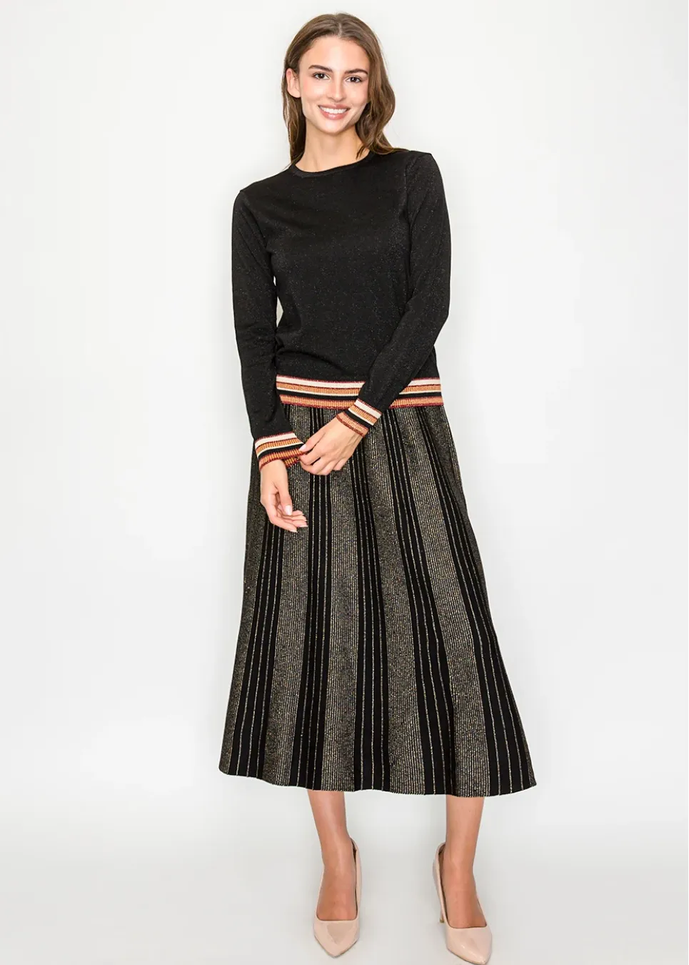 A subtle shimmer with a playful twist. This black sweater catches the light just right, while the striped cuffs and hem add a splash of color.