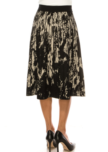 If you are looking for a skirt that combines comfort and style, look no further than this black pleated midi skirt with abstract accents. The pleated design adds movement and texture to your outfit, while the midi length ensures appropriate coverage. Add a touch of abstract art to your wardrobe with this fashionable and comfortable skirt.