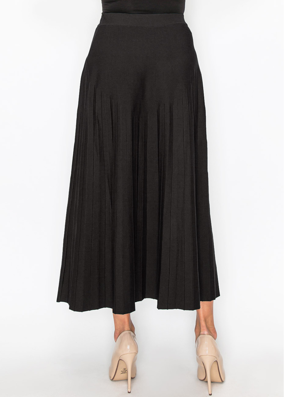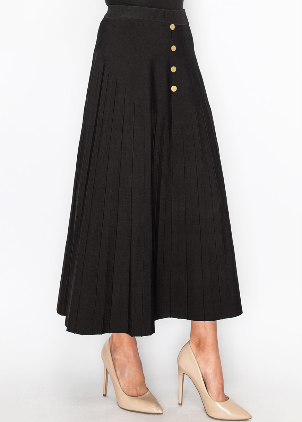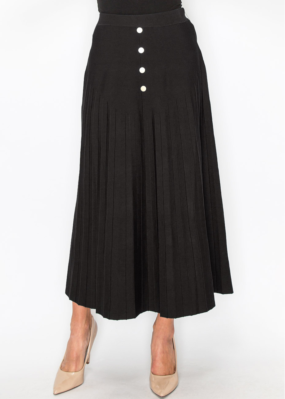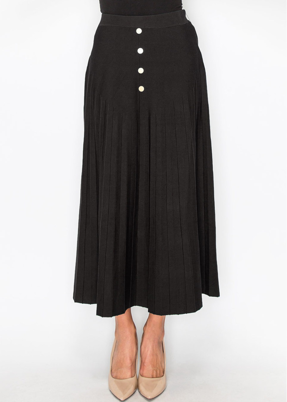 This black pleated skirt combines classic style with modern touches, featuring gold button accents for a refined look. The flowing pleats provide a graceful movement, making it a versatile piece for any modest wardrobe.