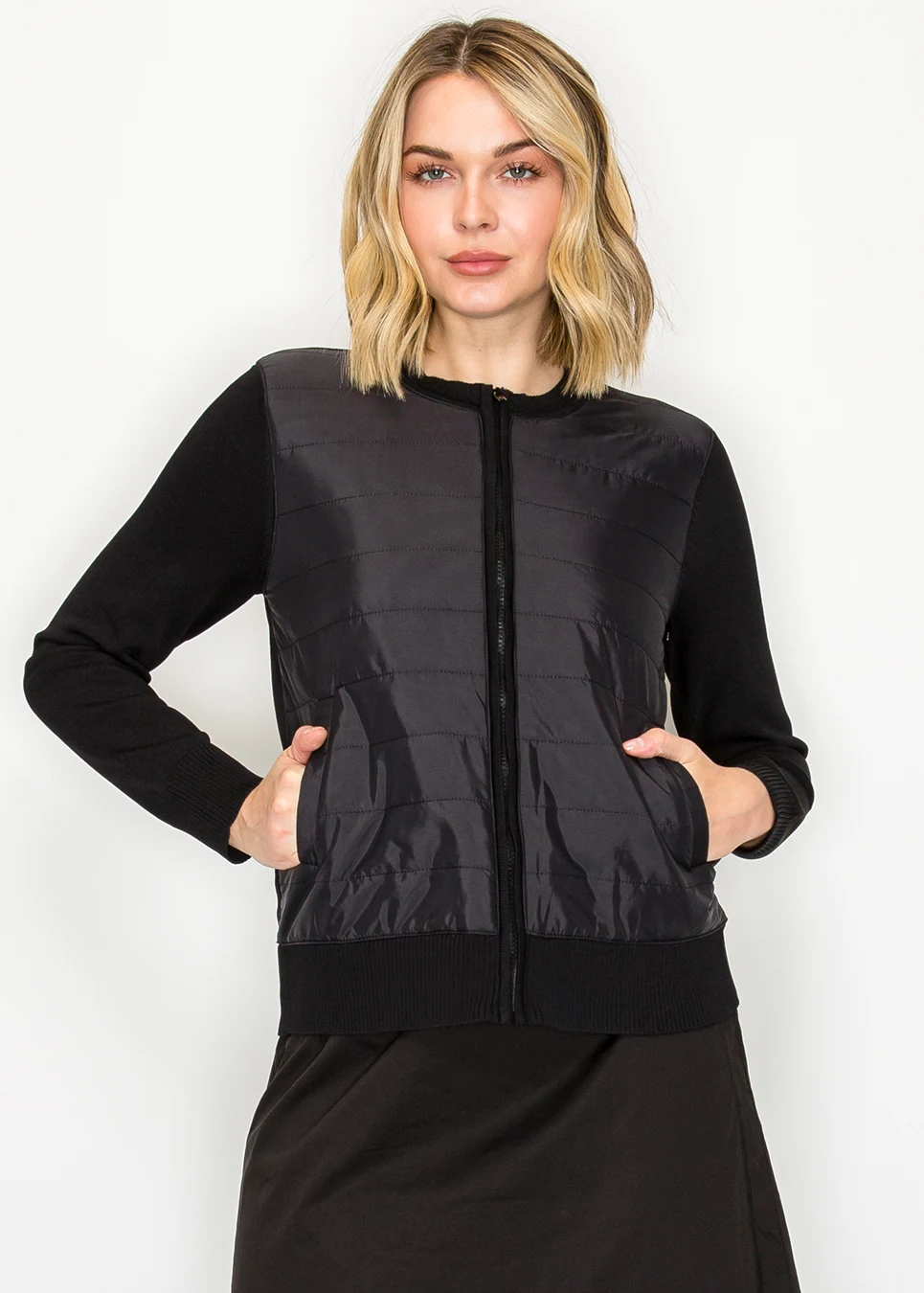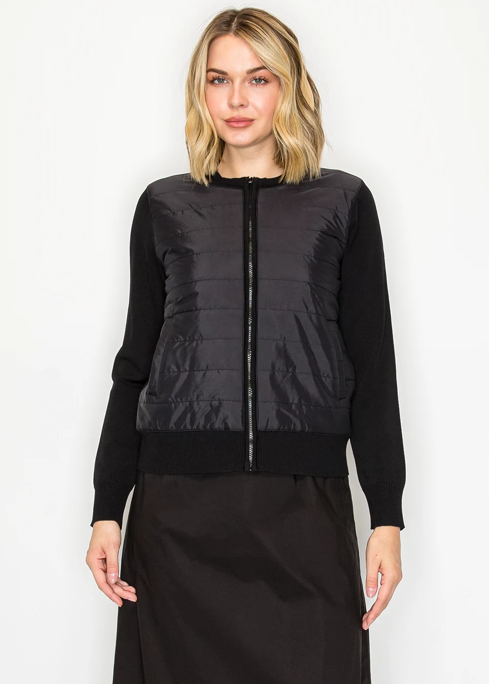 Black Quilted Front Zip Knit Cardigan