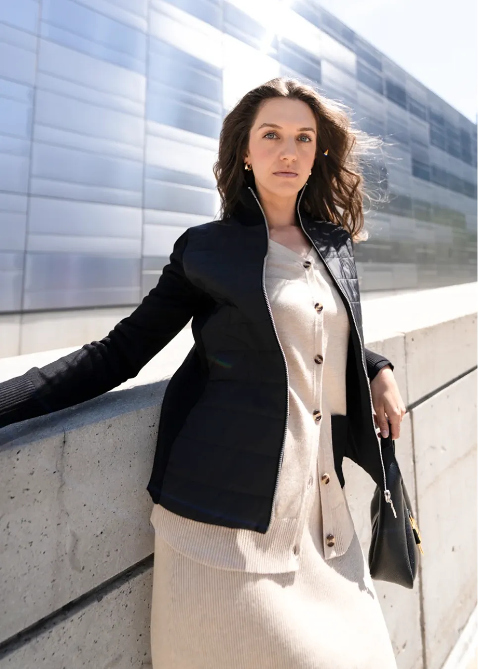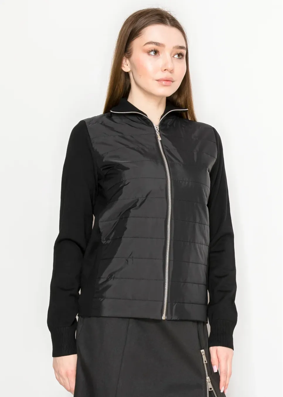 A refined take on casual outerwear, this jacket features a subtle sheen on its quilted panels and soft knit sleeves. The full-length zipper and tailored fit make it a versatile wardrobe staple.