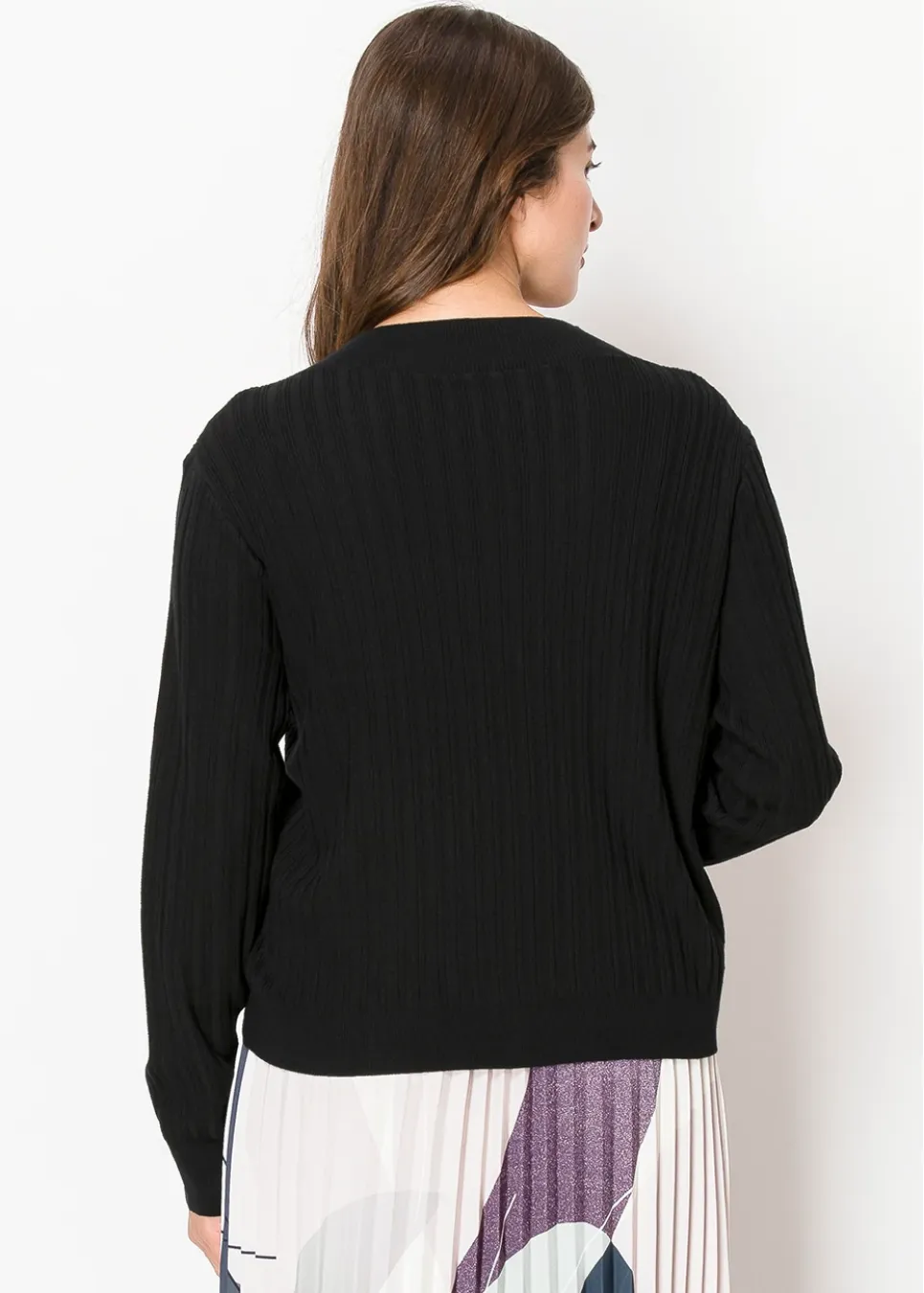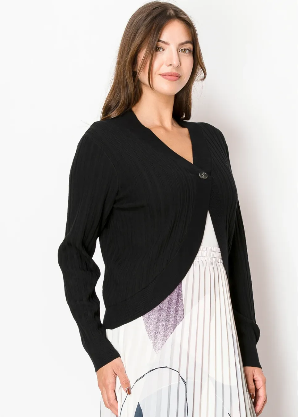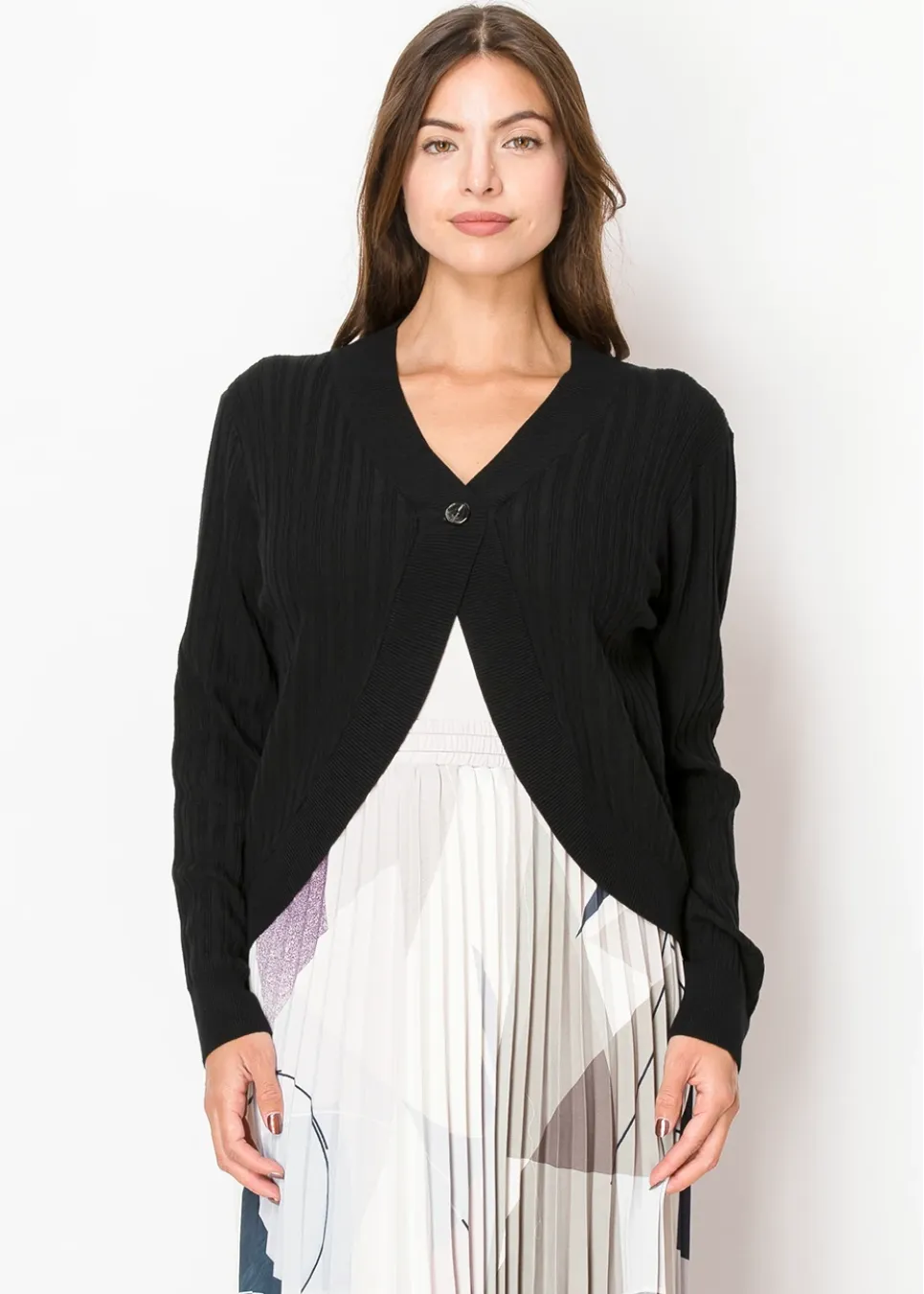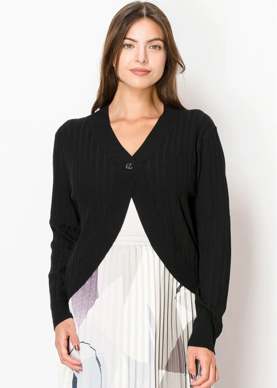 A fresh take on a classic black cardigan. The ribbed knit gives it structure, while the open-front design with a single-button closure makes it easy to wear over anything. Perfect for when you want a lightweight layer with just the right amount of detail.