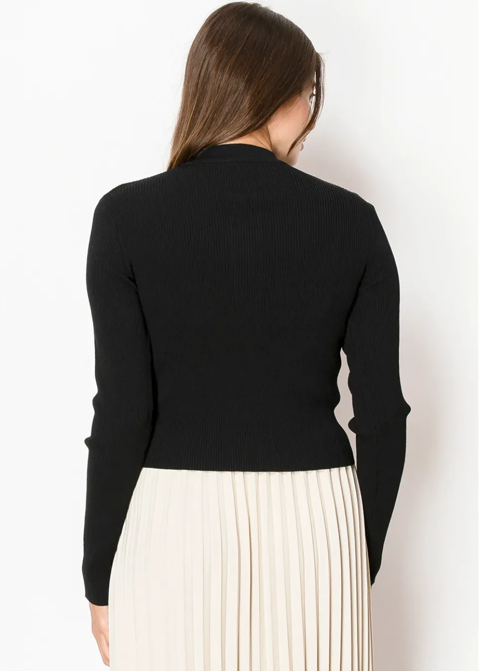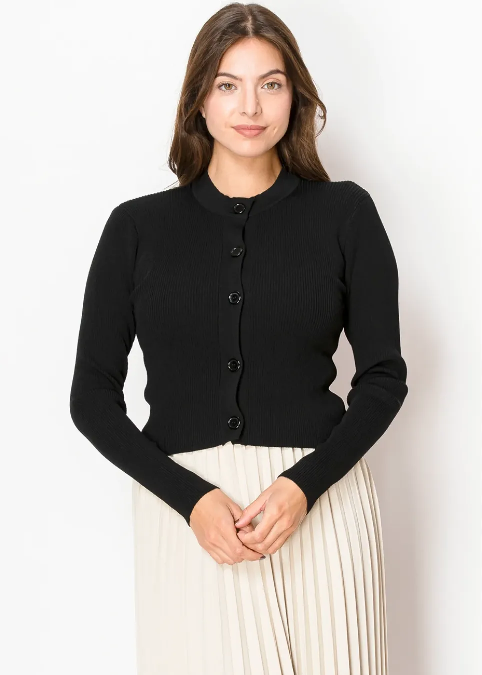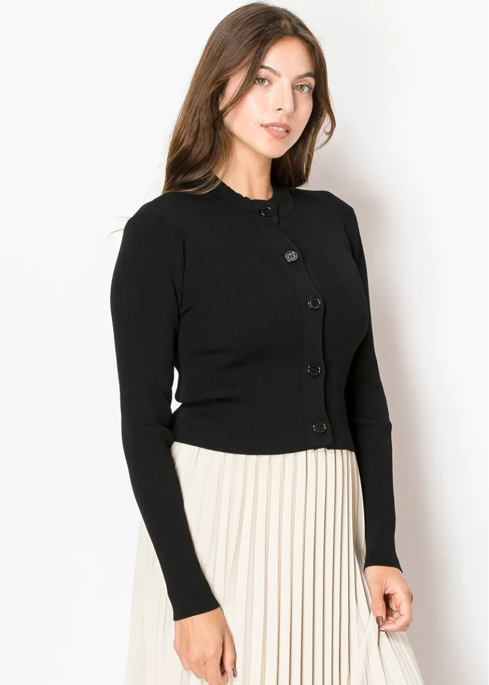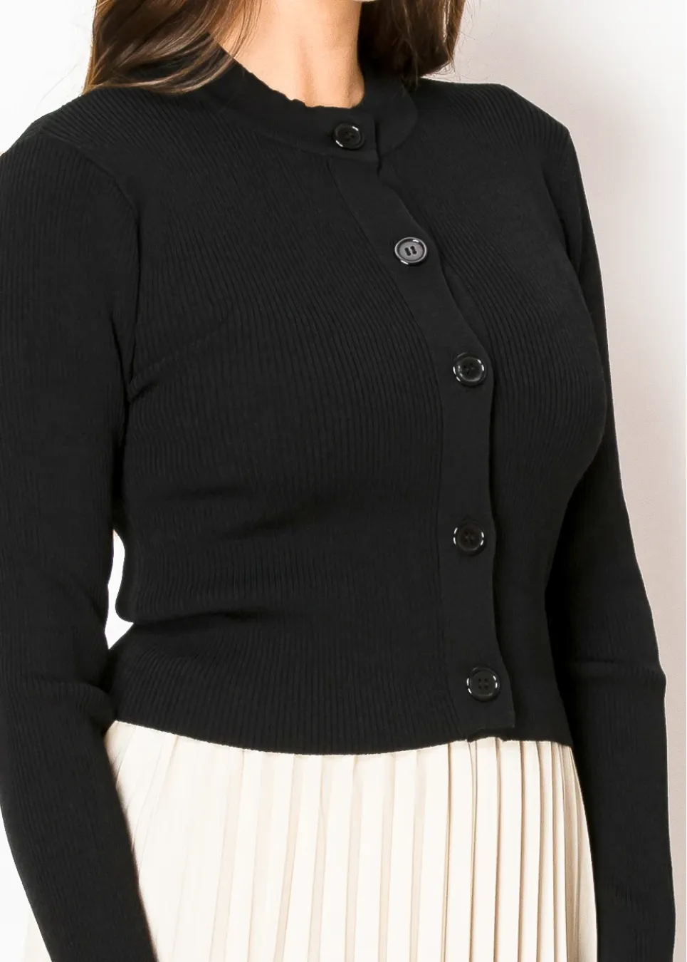 Timeless and effortless, this black ribbed cardigan features a fitted silhouette and sleek buttons down the front. The minimal design pairs perfectly with skirts or dresses, making it a staple piece for any wardrobe.