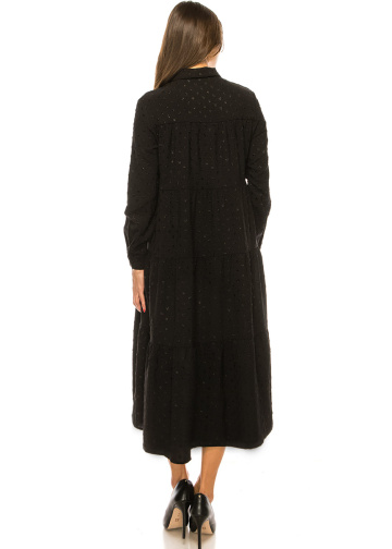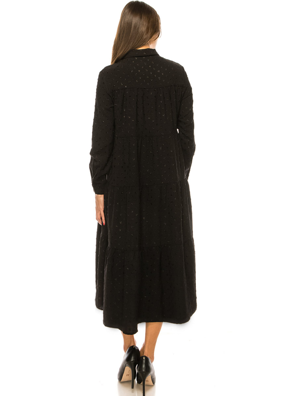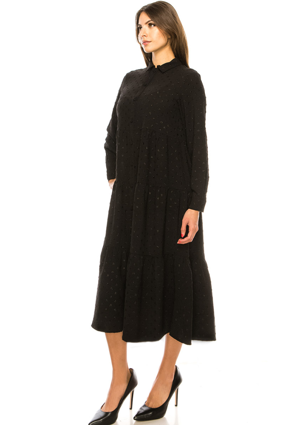 Achieve a perfect balance of modesty and style with this black shirt collar midi dress. The button-down front and long sleeves create a modest yet chic look, while the A-line silhouette flatters your figure with a touch of elegance. The tiered skirt adds a playful and feminine twist, making it perfect for any occasion. The lightweight fabric makes it perfect for any season, and the dress will keep you comfortable and stylish all day long.