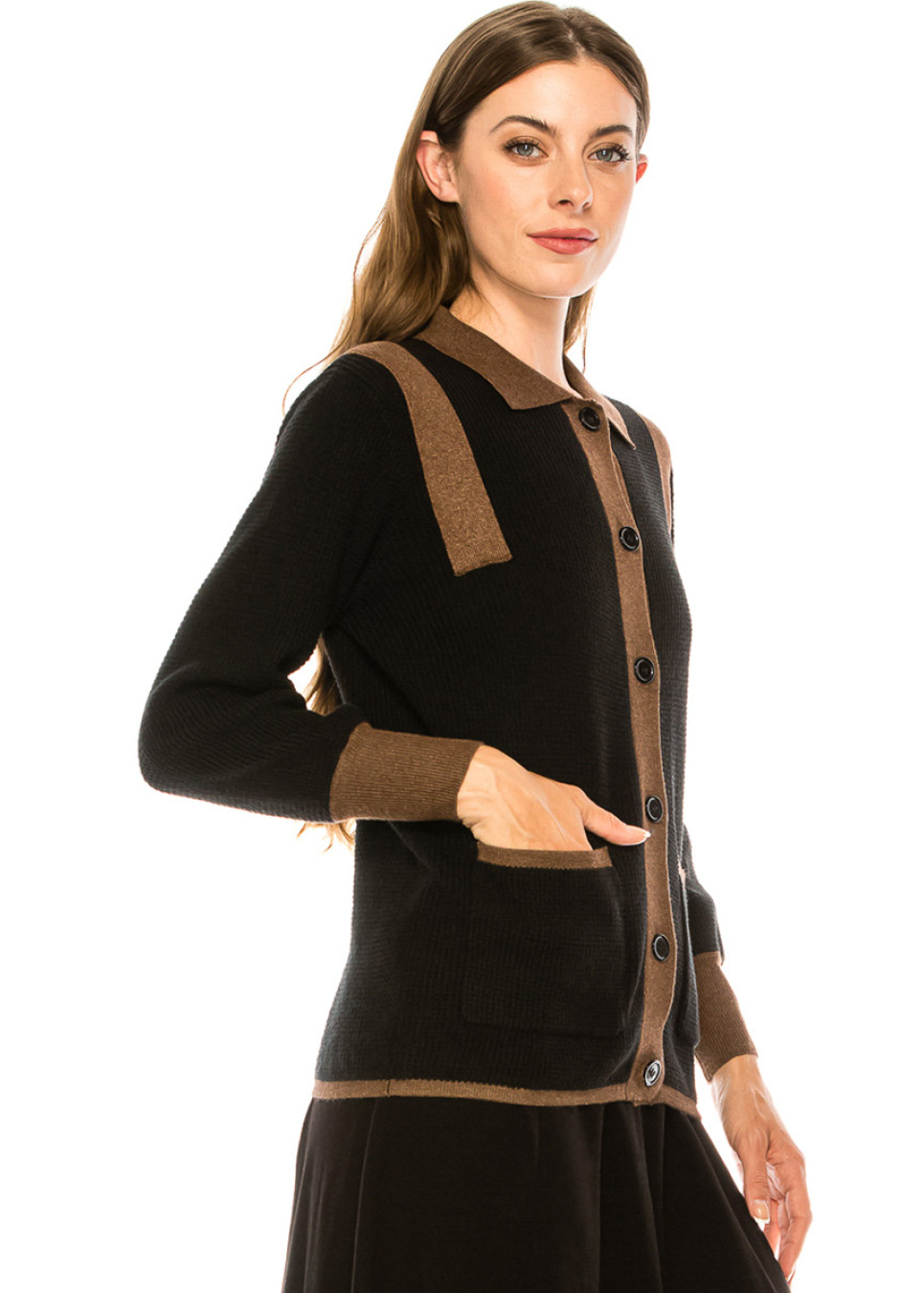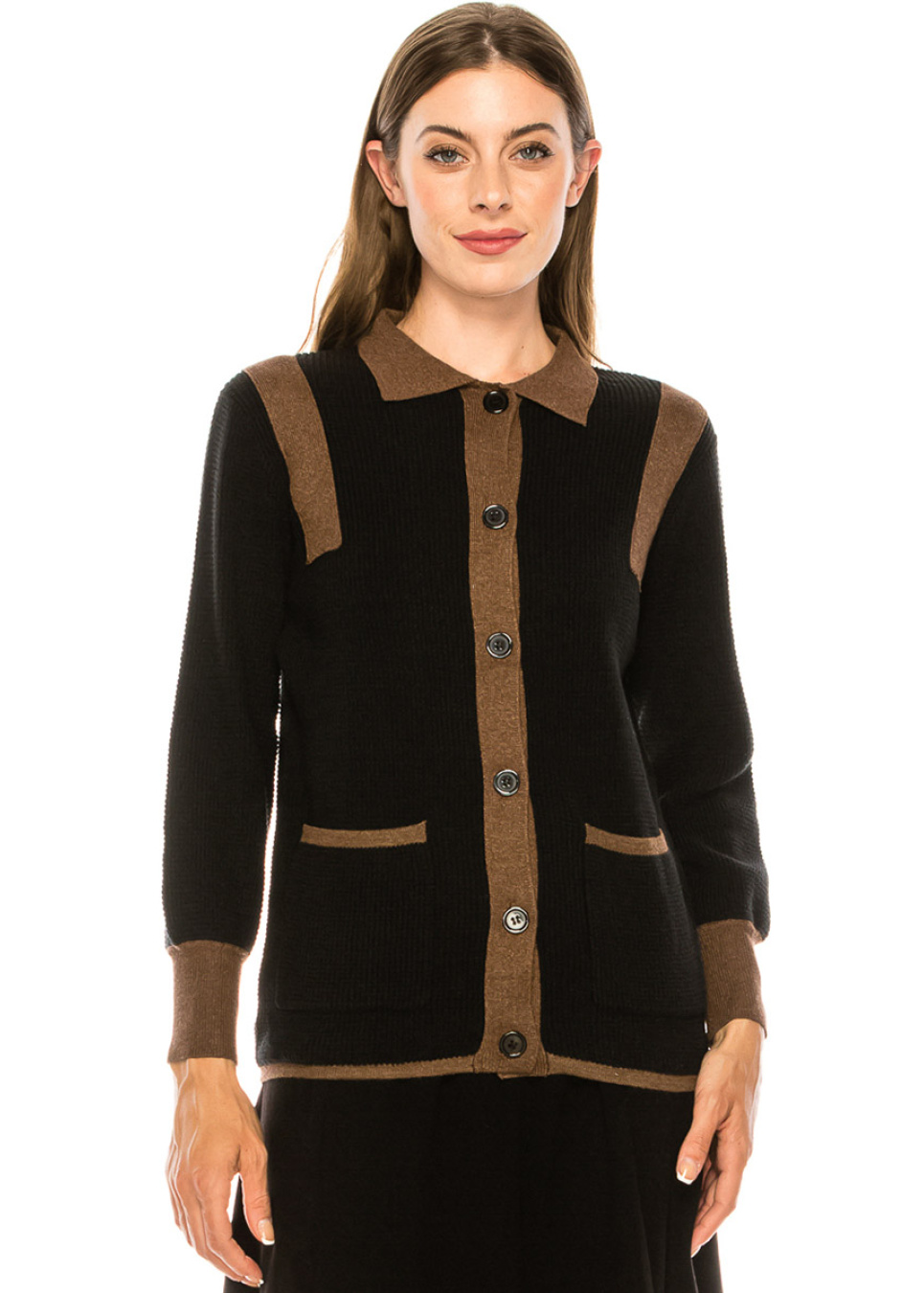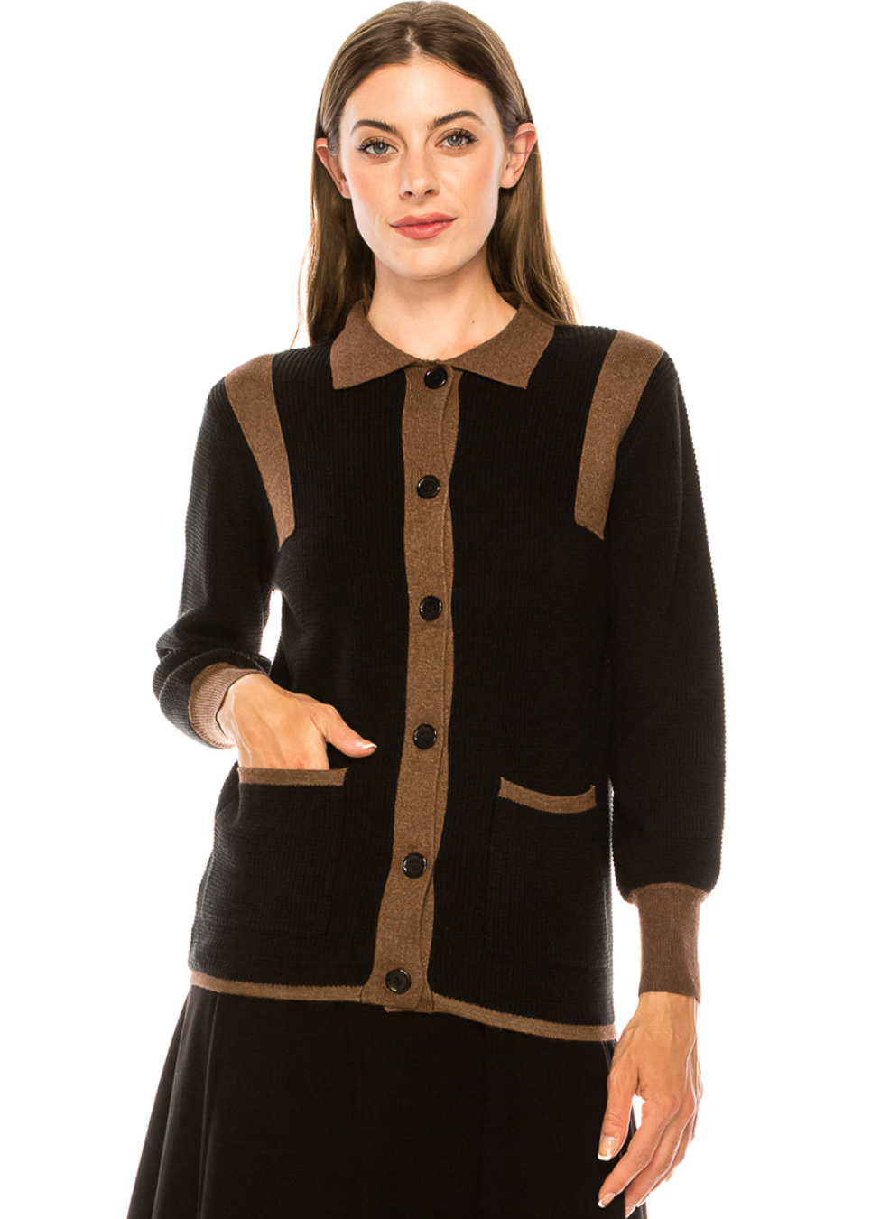The black cardigan looks unusual due to the accent stripes on the pockets, cuffs and at the base of the sleeves. The turn-off collar gives the cardigan a sports note. Wear it either alone or pair with blouses and T-shirts.