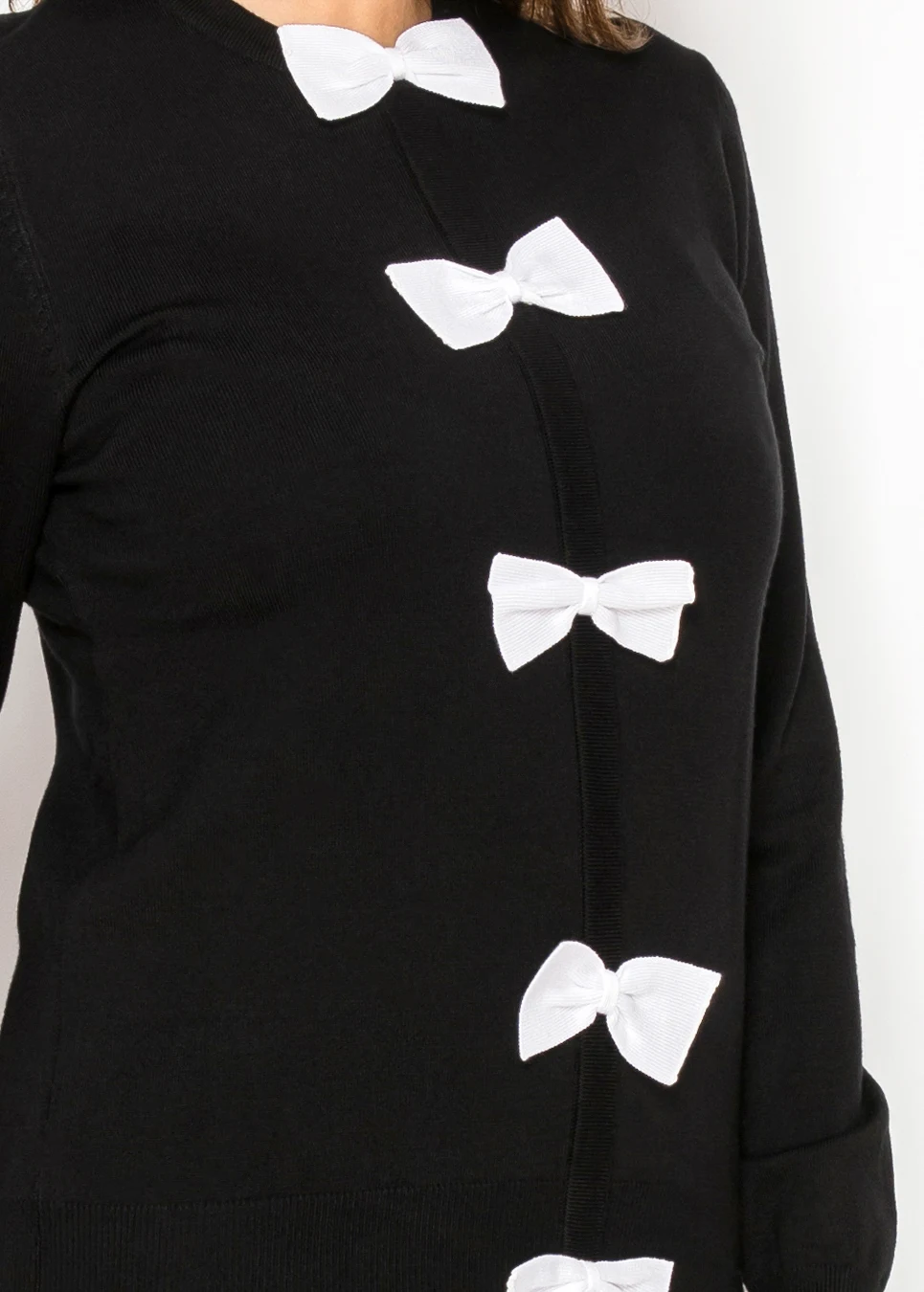 How many pieces in your closet actually get a reaction? This one does. Five white bows, evenly spaced down the center of a clean black knit. Smooth fabric, relaxed fit, ribbed cuffs. Understated everywhere except exactly where it counts.