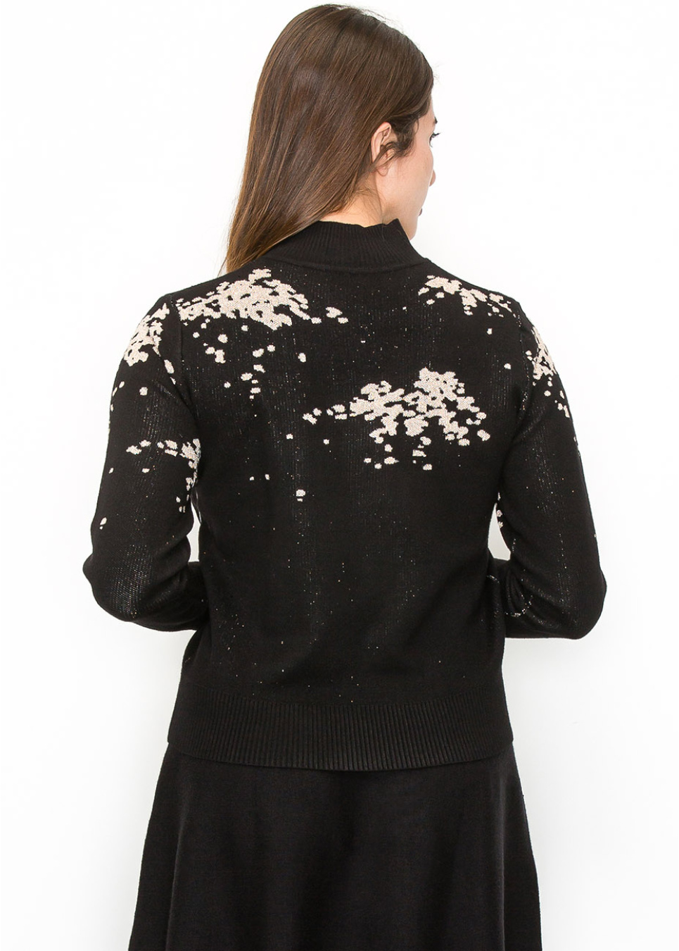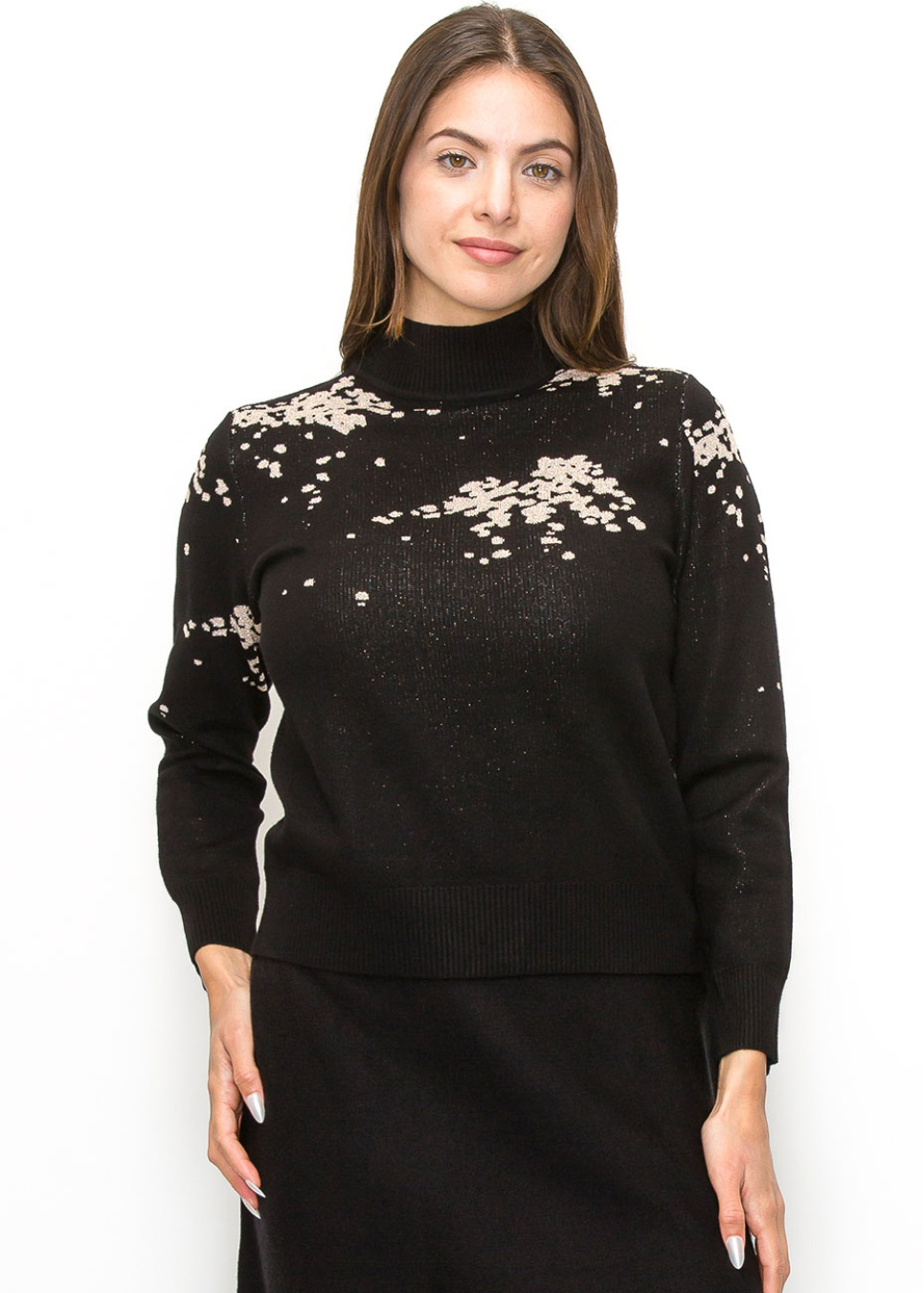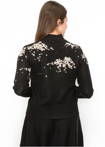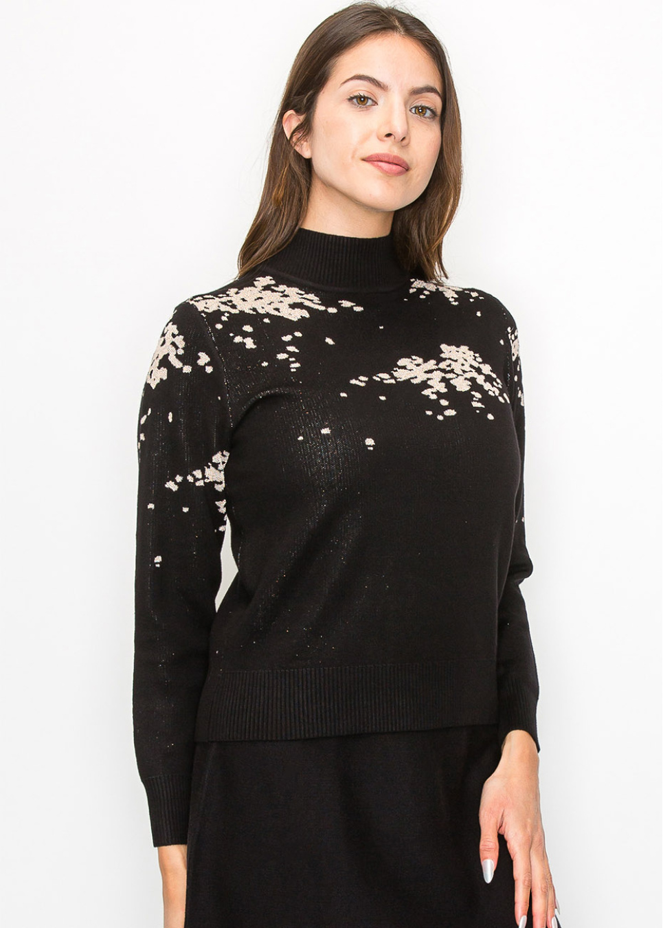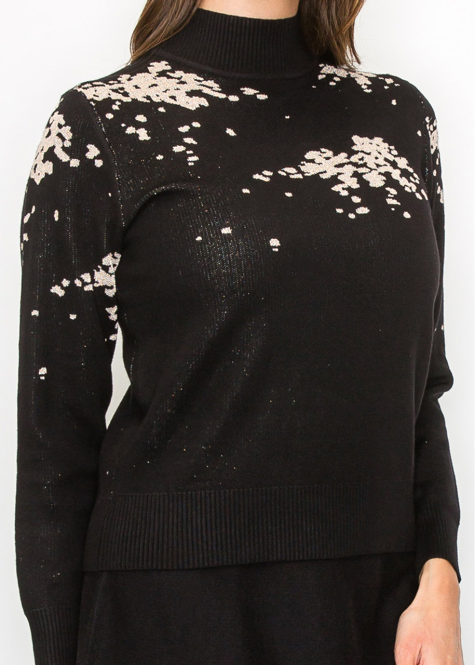A beautifully crafted black sweater featuring abstract cream accents, offering a fresh take on a classic look. The high neck and soft fabric provide warmth and comfort, making this sweater a versatile addition to any modest wardrobe.