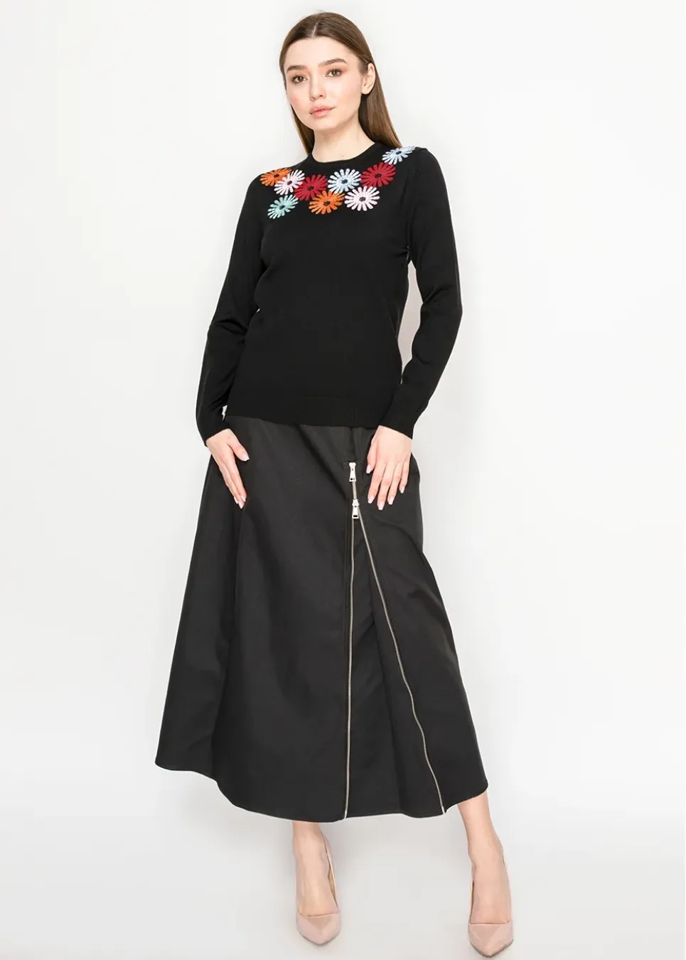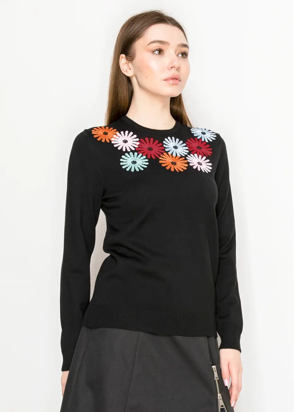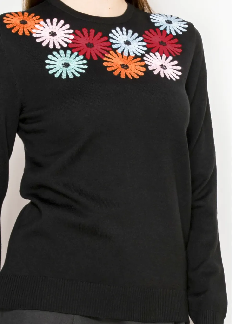 Brighten up your wardrobe with this classic black sweater, featuring vibrant embroidered flowers across the neckline. It’s soft, playful, and easy to style all season long.