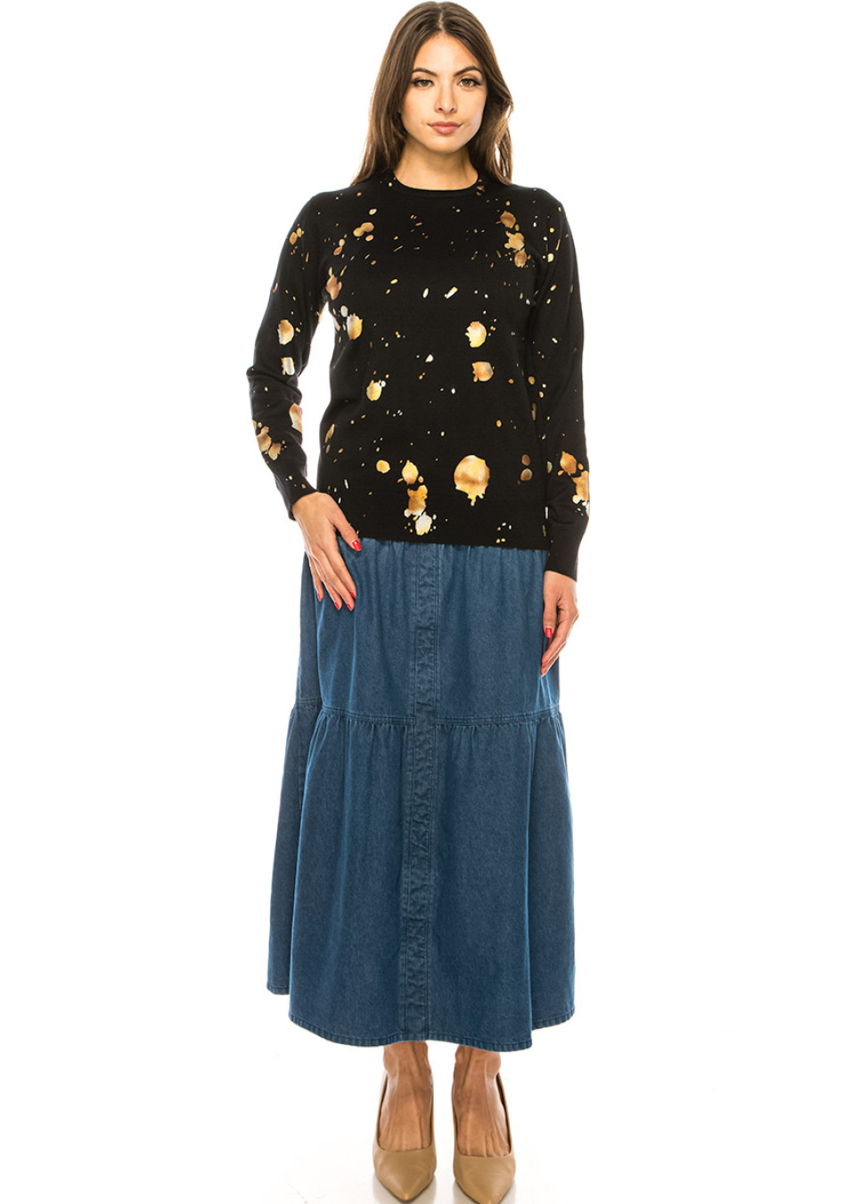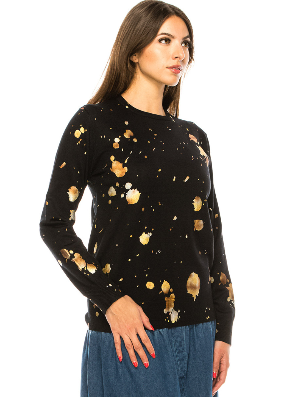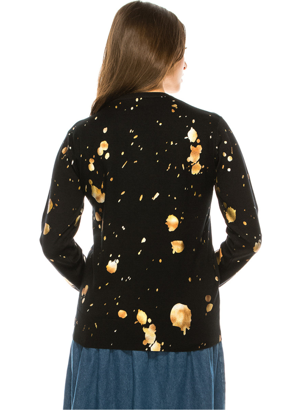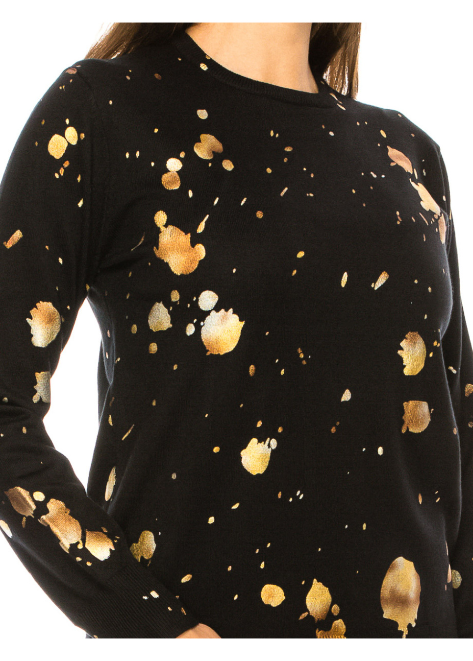 This season, elevate your wardrobe with our stunning black crew neck sweater, featuring eye-catching gold spots that add a touch of glamour to any outfit. The soft knit fabric will keep you warm and comfortable, while the modern design will make you stand out from the crowd.