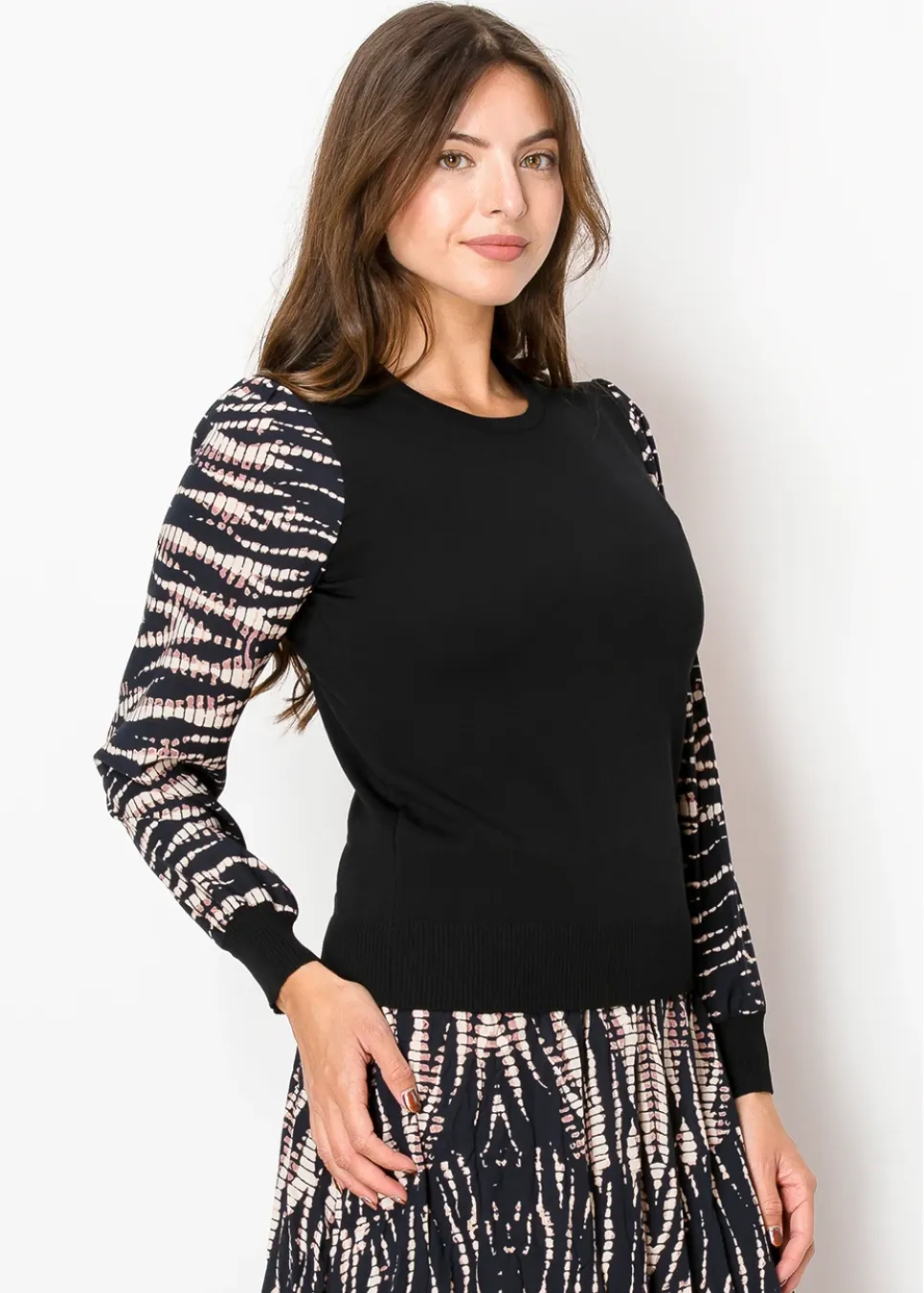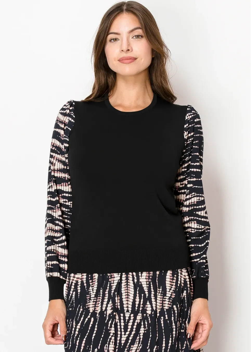 Classic with a twist—this sweater blends a sleek black knit body with statement sleeves. The lightweight woven fabric adds just the right touch of pattern, keeping it interesting yet effortless.
