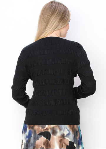 Featuring a textured knit and modest button closure, this black cardigan combines comfort with understated style. The soft fabric and ribbed pattern create a timeless look, perfect for layering over blouses or dresses.