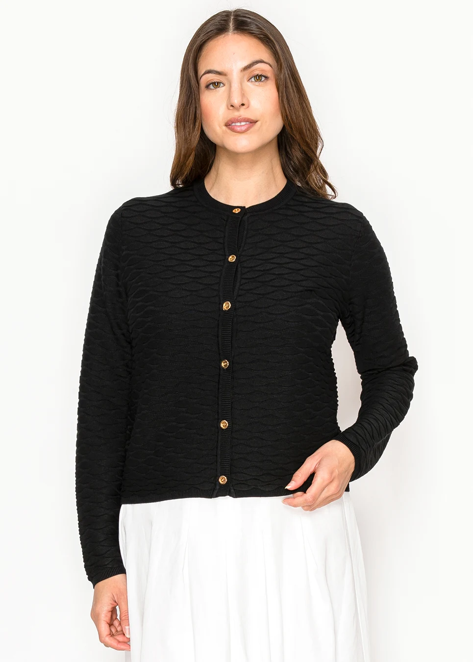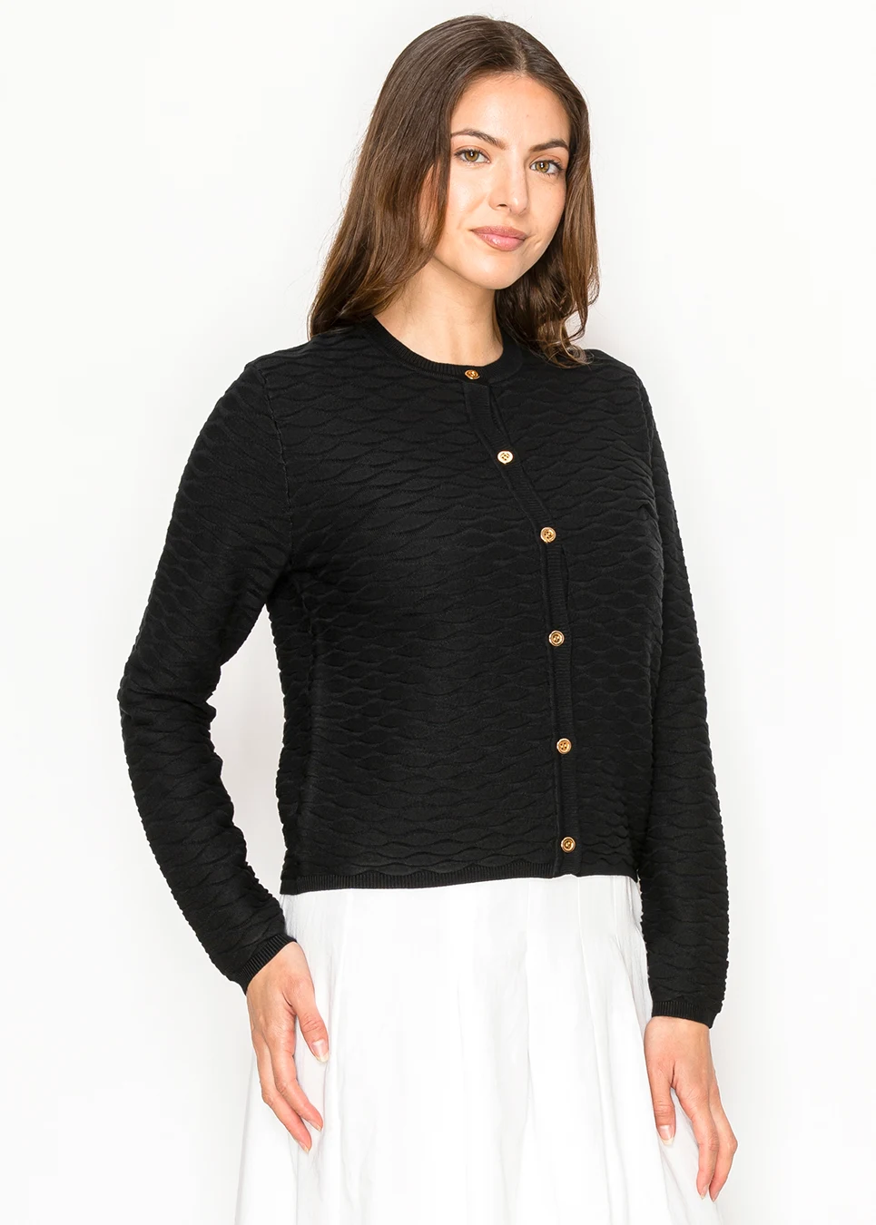 How many black cardigans do you have that you actually notice? This one earns a second look — the tonal wave texture is woven into the knit itself, giving the whole piece a surface quality that plain black can't match. Gold button front, crew neck, relaxed fit. Black, but better.