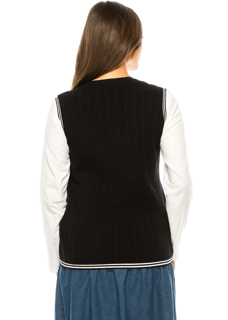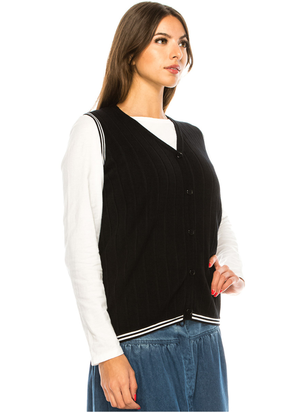 Stay stylish and snug in this lovely black ribbed vest. Its timeless button-front style and v-neckline offer a flattering and sophisticated silhouette that's perfect for layering over any ensemble. The vest is a chic and cozy addition to your wardrobe that's sure to become a go-to piece for any occasion.
