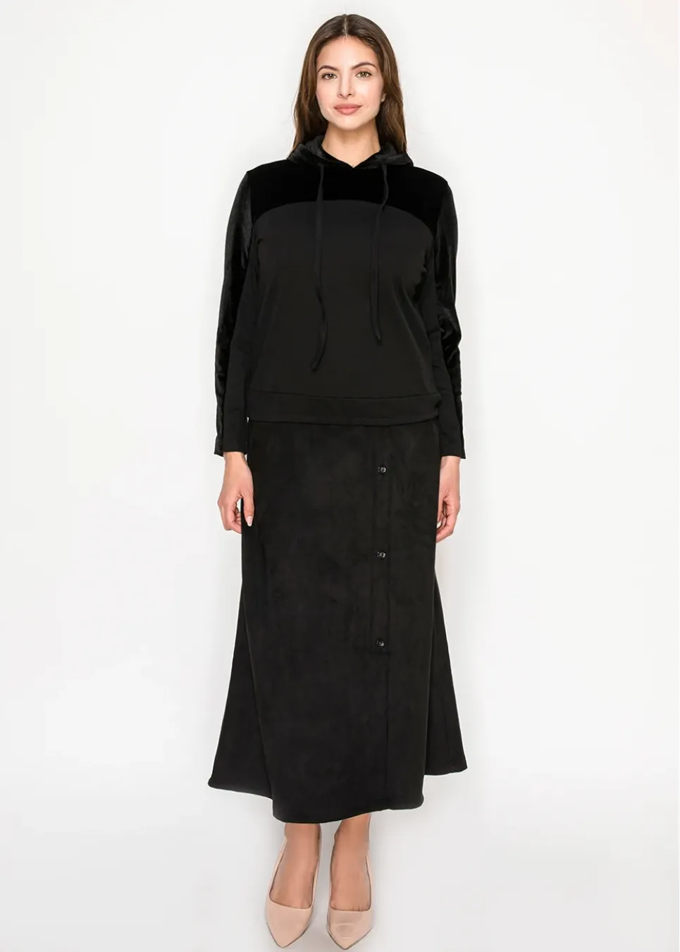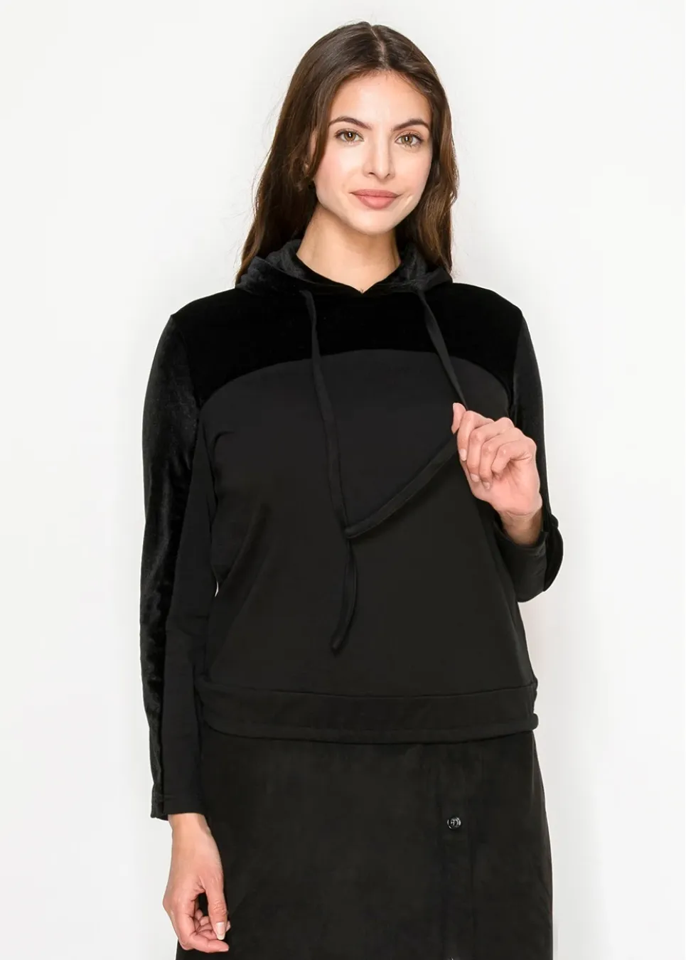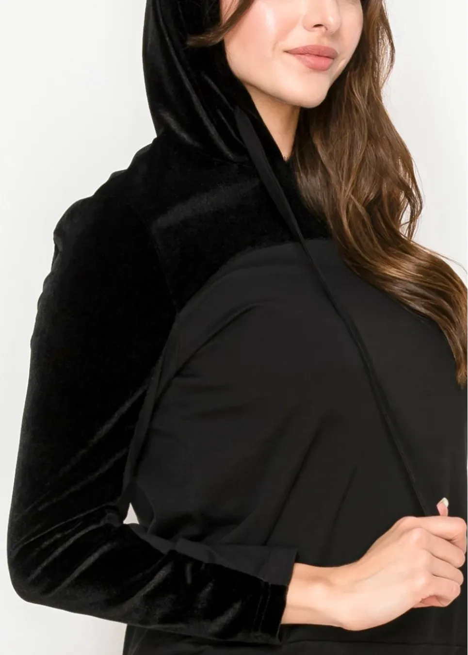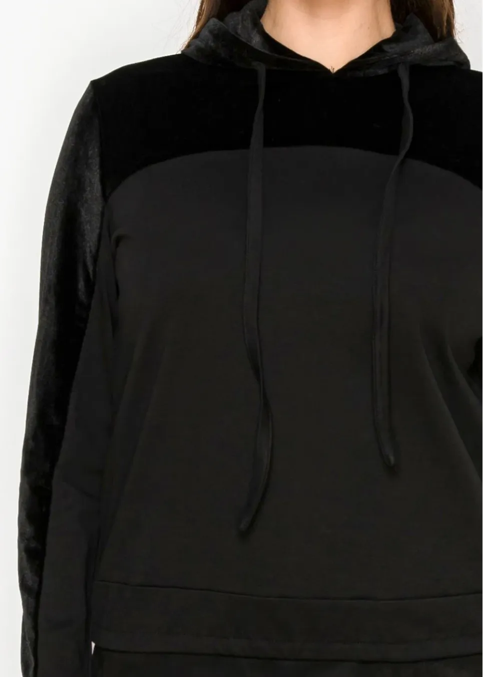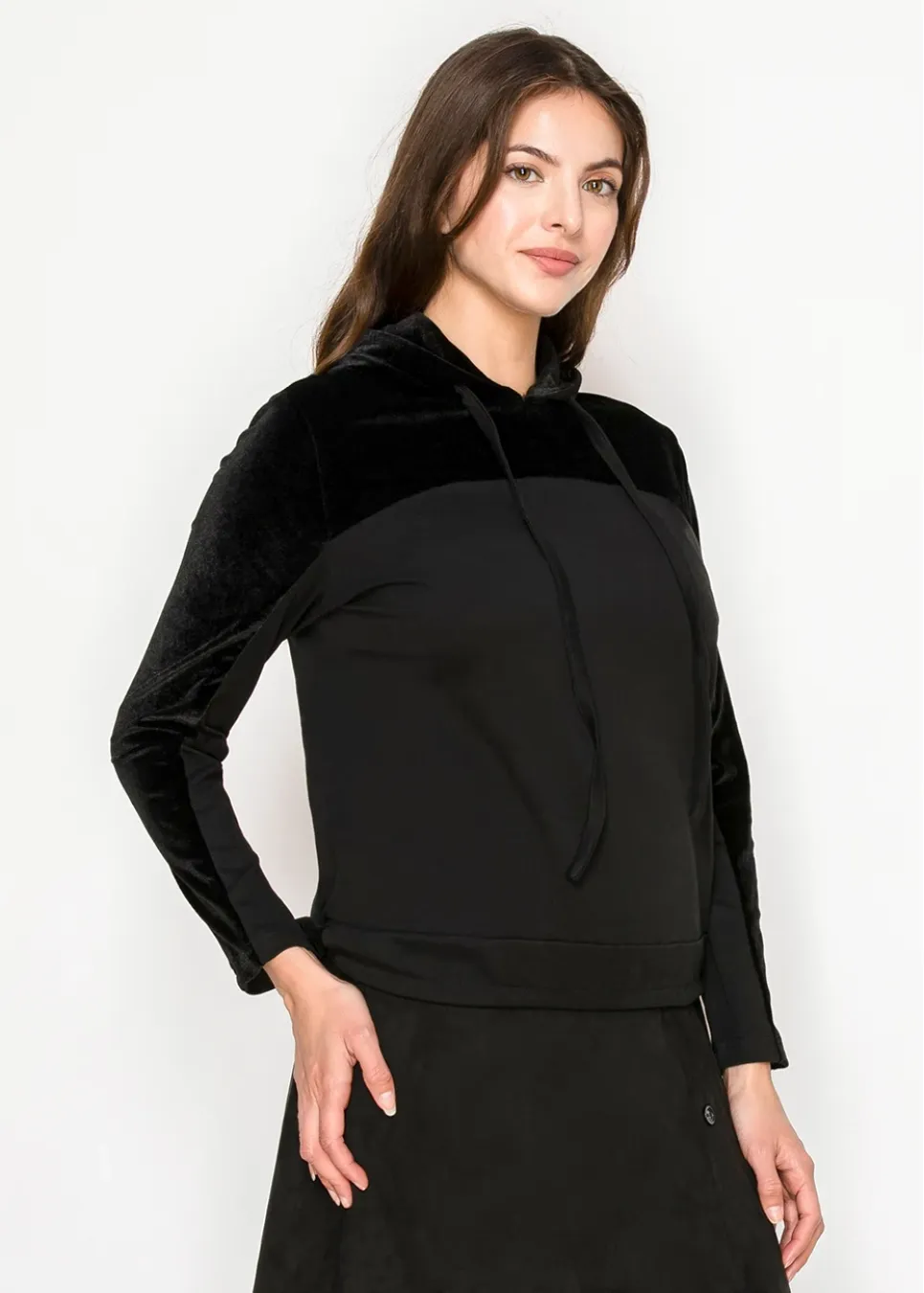 A modern hoodie with a refined touch — crafted in black with velvet-inspired accents. Perfect for effortless style that still feels polished.