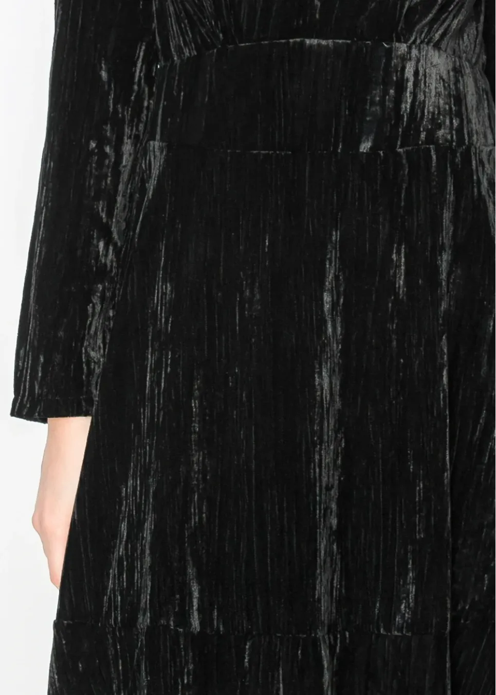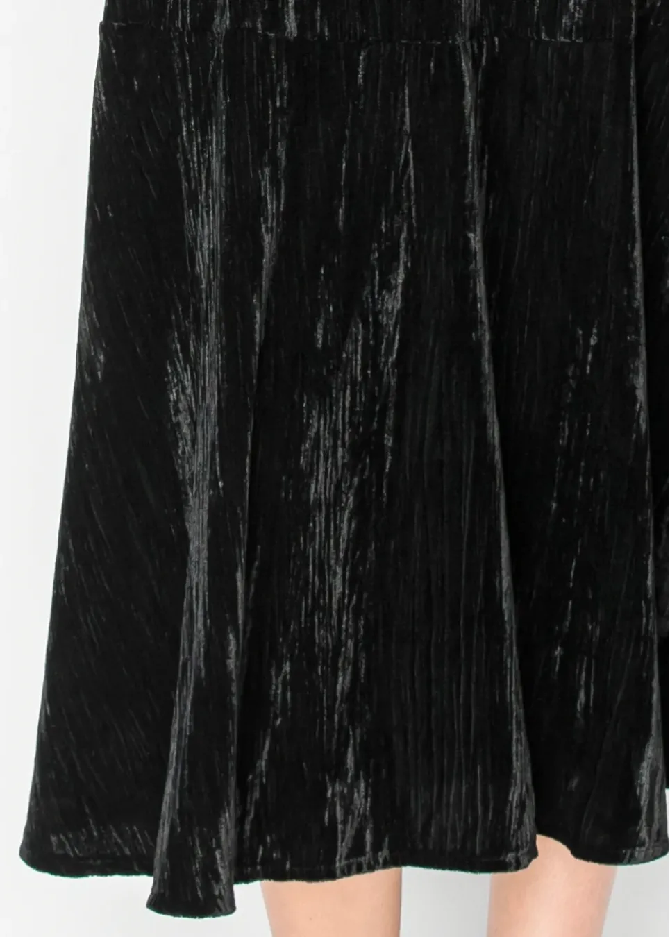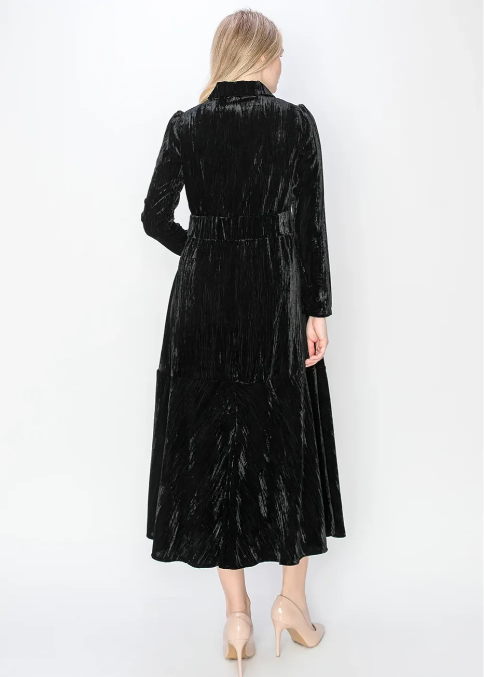 Luxe texture meets modern shape in this black crushed velvet midi. The collared neckline adds structure to the fluid silhouette.