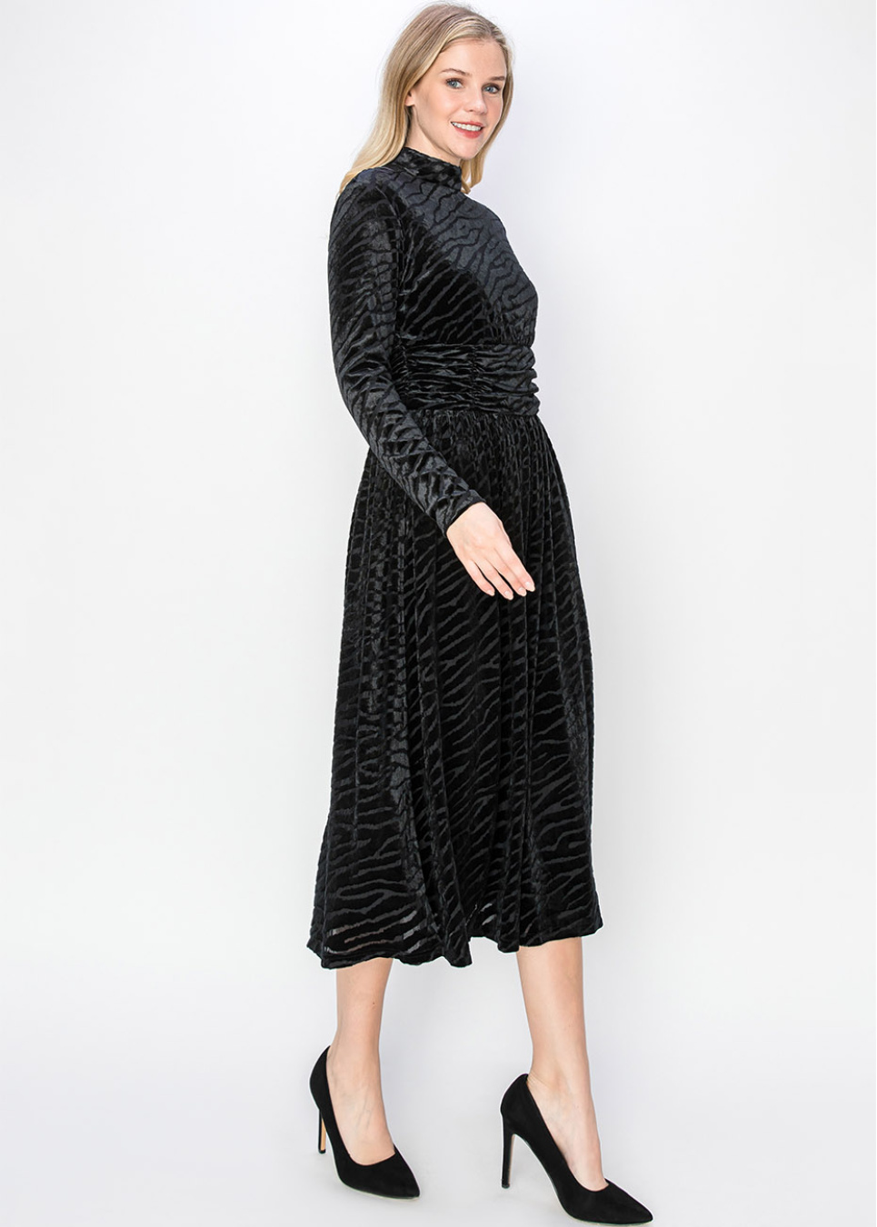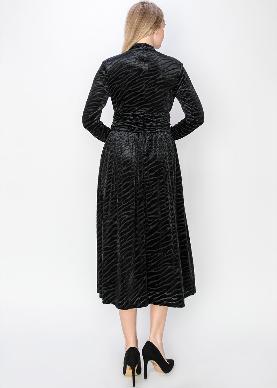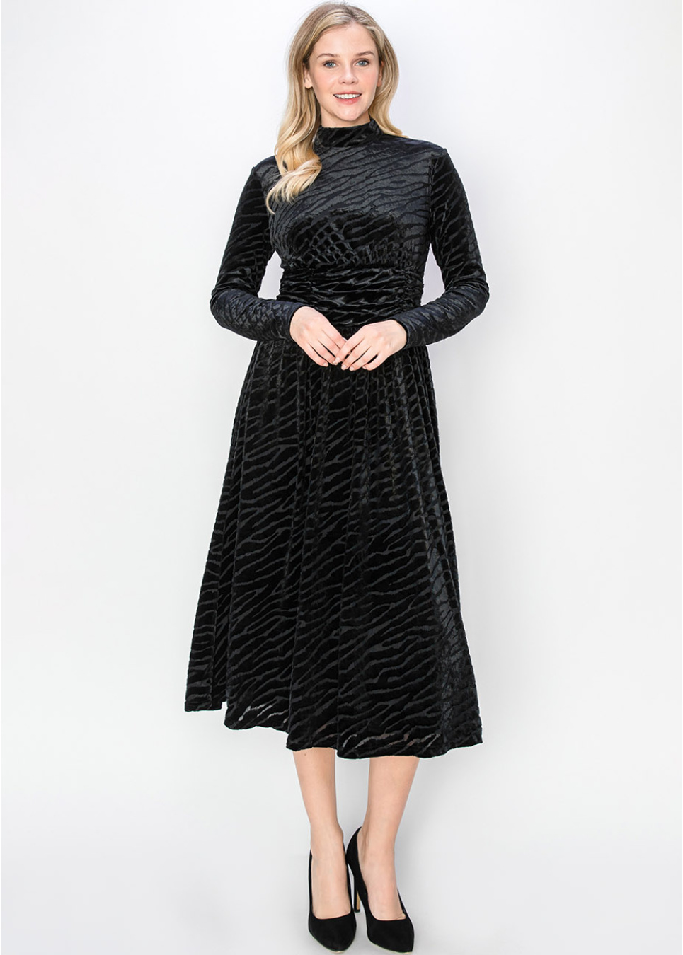 Crafted from a luxurious velvet fabric, this dress combines comfort and style effortlessly. The rich black hue is complemented by the intricate texture, giving it depth and elegance. The long sleeves and high neckline offer a modest silhouette, making it a refined choice for modest fashion lovers.