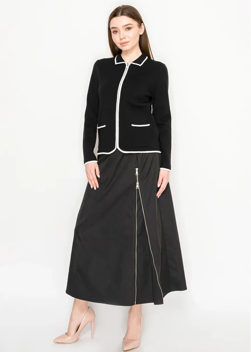 A sleek black cardigan with contrast white trim, a zip front, and patch pockets. Perfect for layering over casual or office looks.