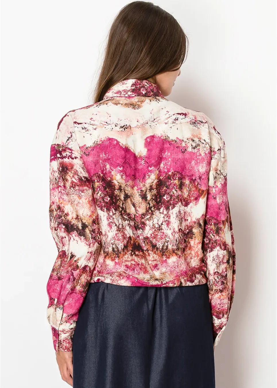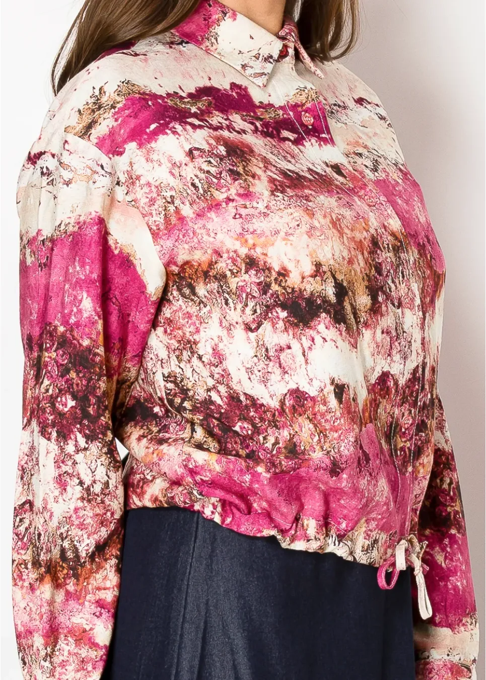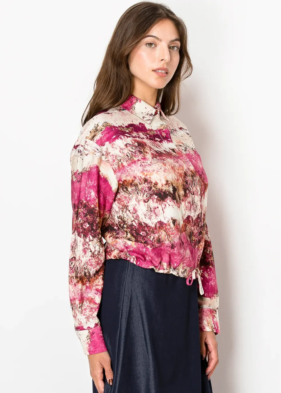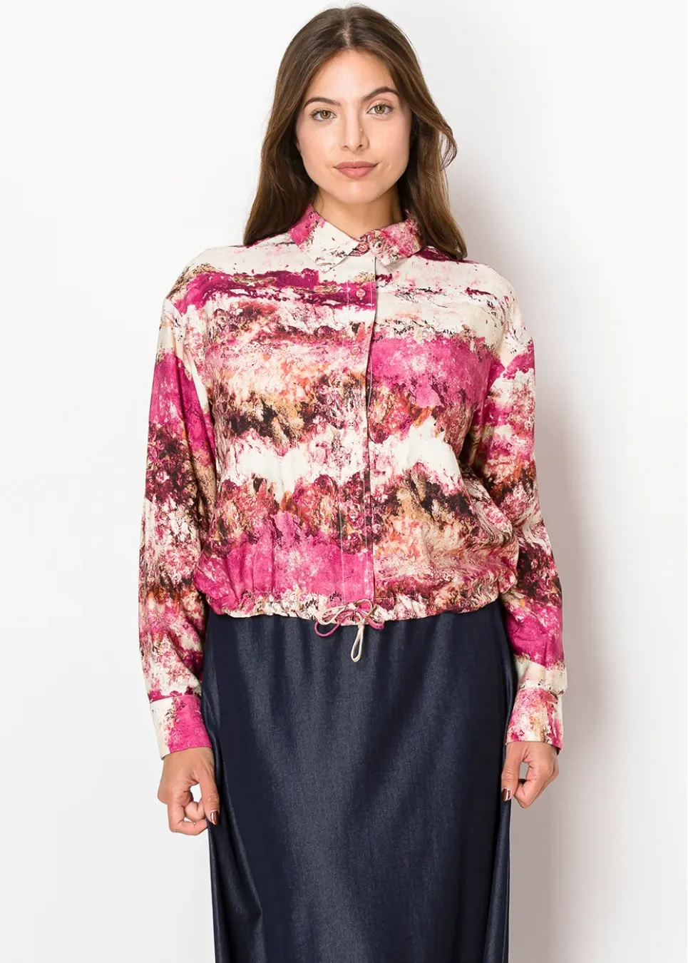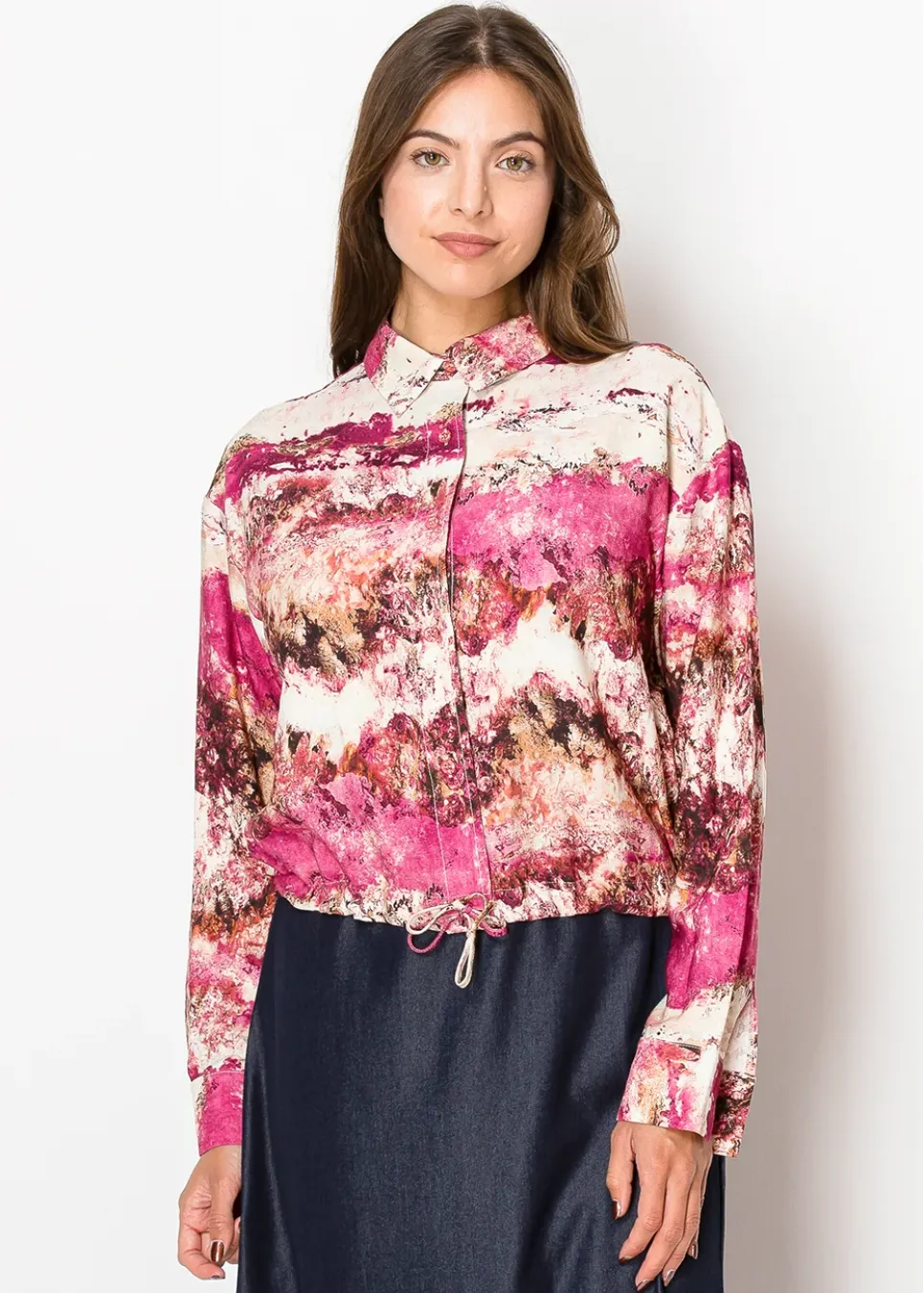 Inspired by desert sunsets, this shirt blends warm magenta and soft sandy hues in a relaxed, flowy design. The button-up front and adjustable hem make it a versatile option for layering or wearing on its own.