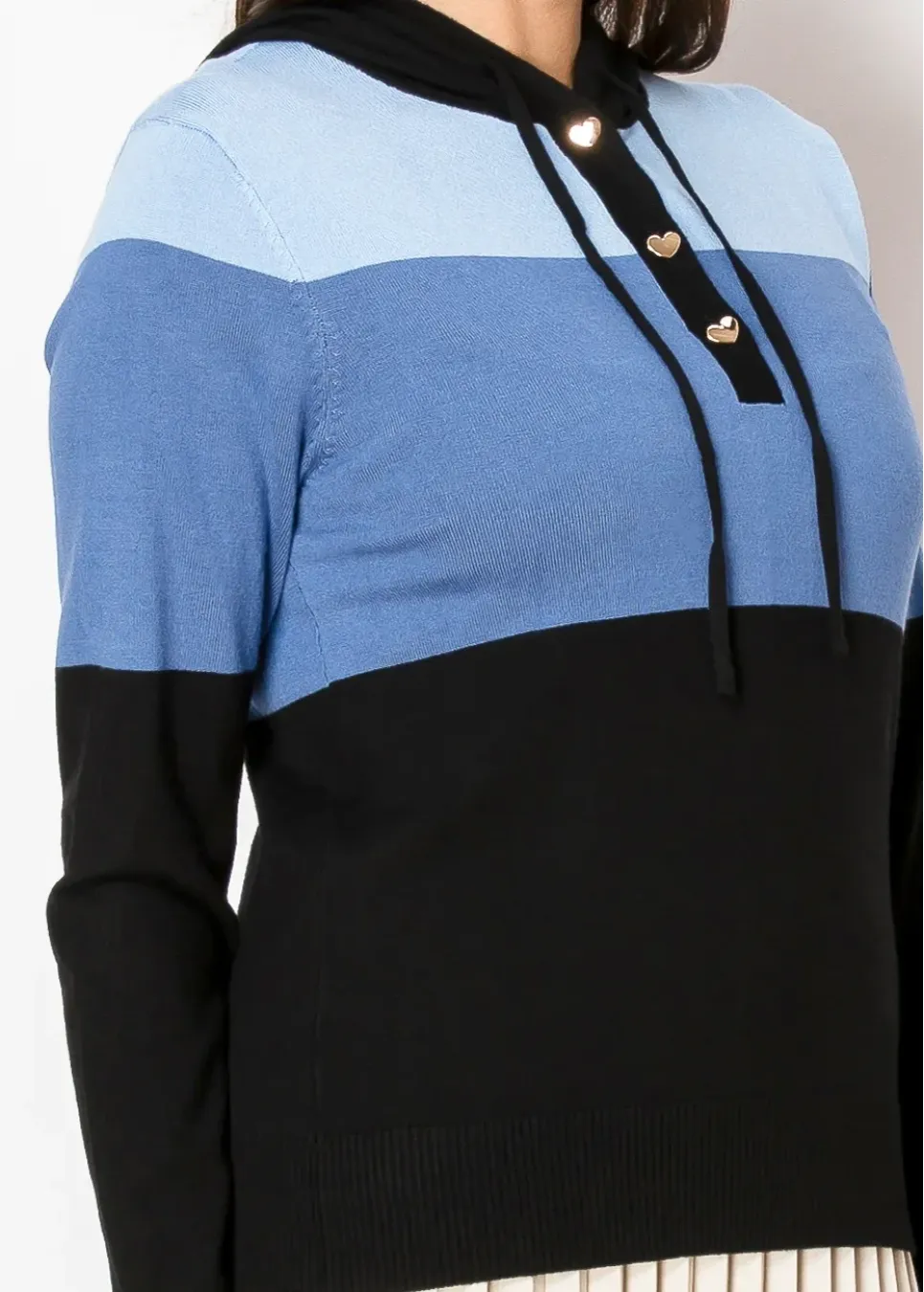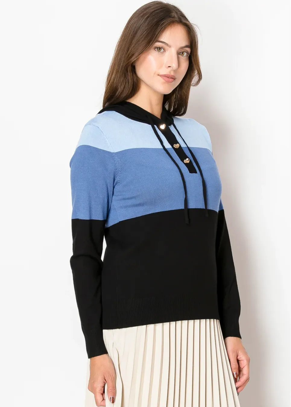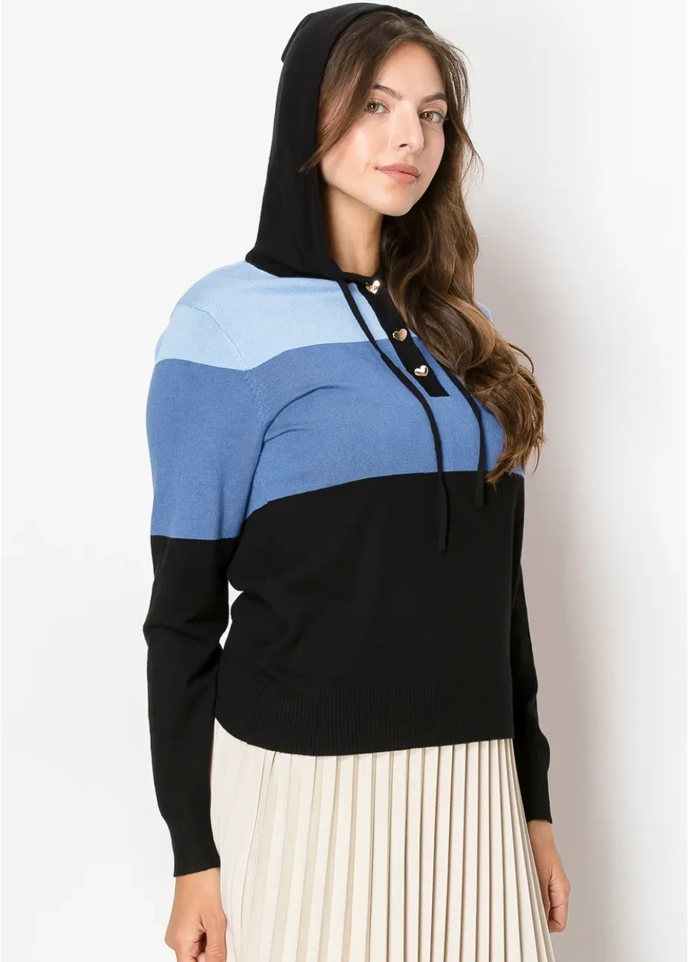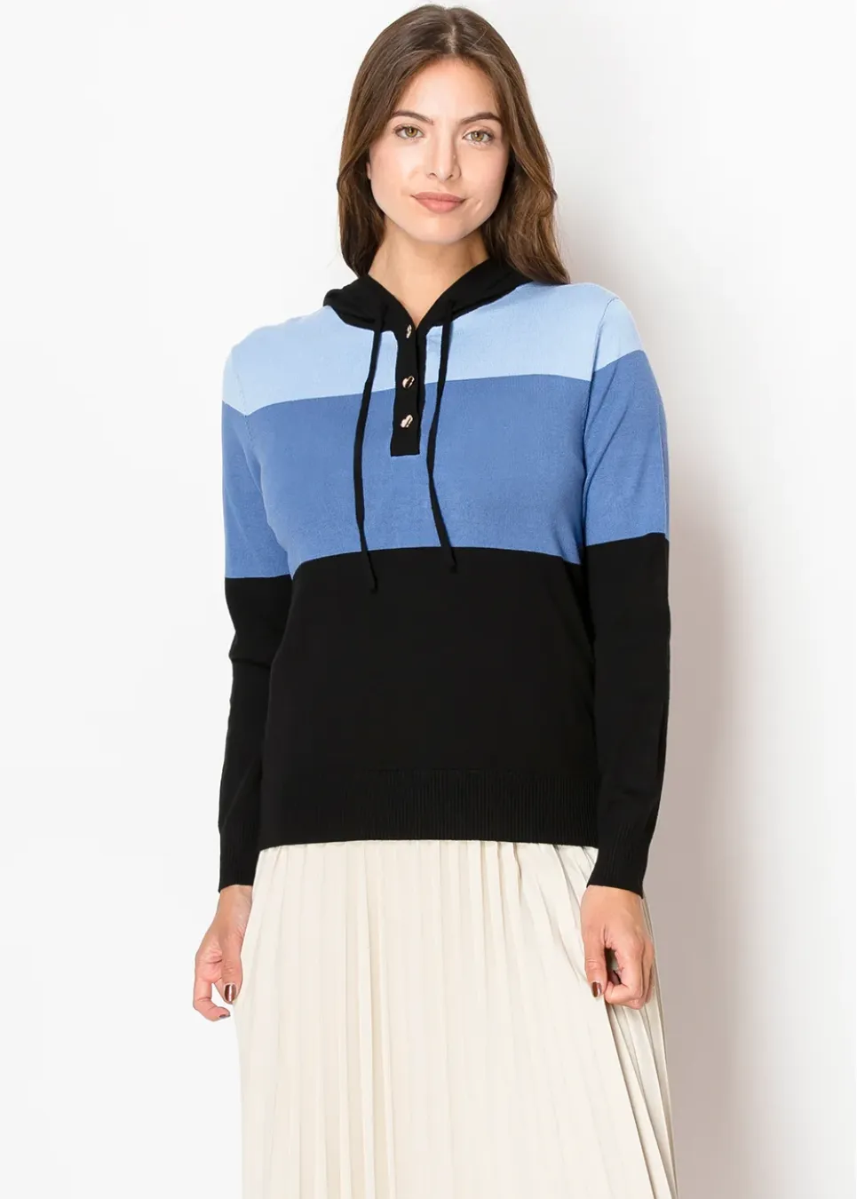 Stay cozy and stylish with this colorblock hoodie sweater. The mix of light blue, navy, and black creates a fresh yet understated look, while the soft knit keeps it comfortable. The hoodie adds a casual touch, perfect for relaxed days.