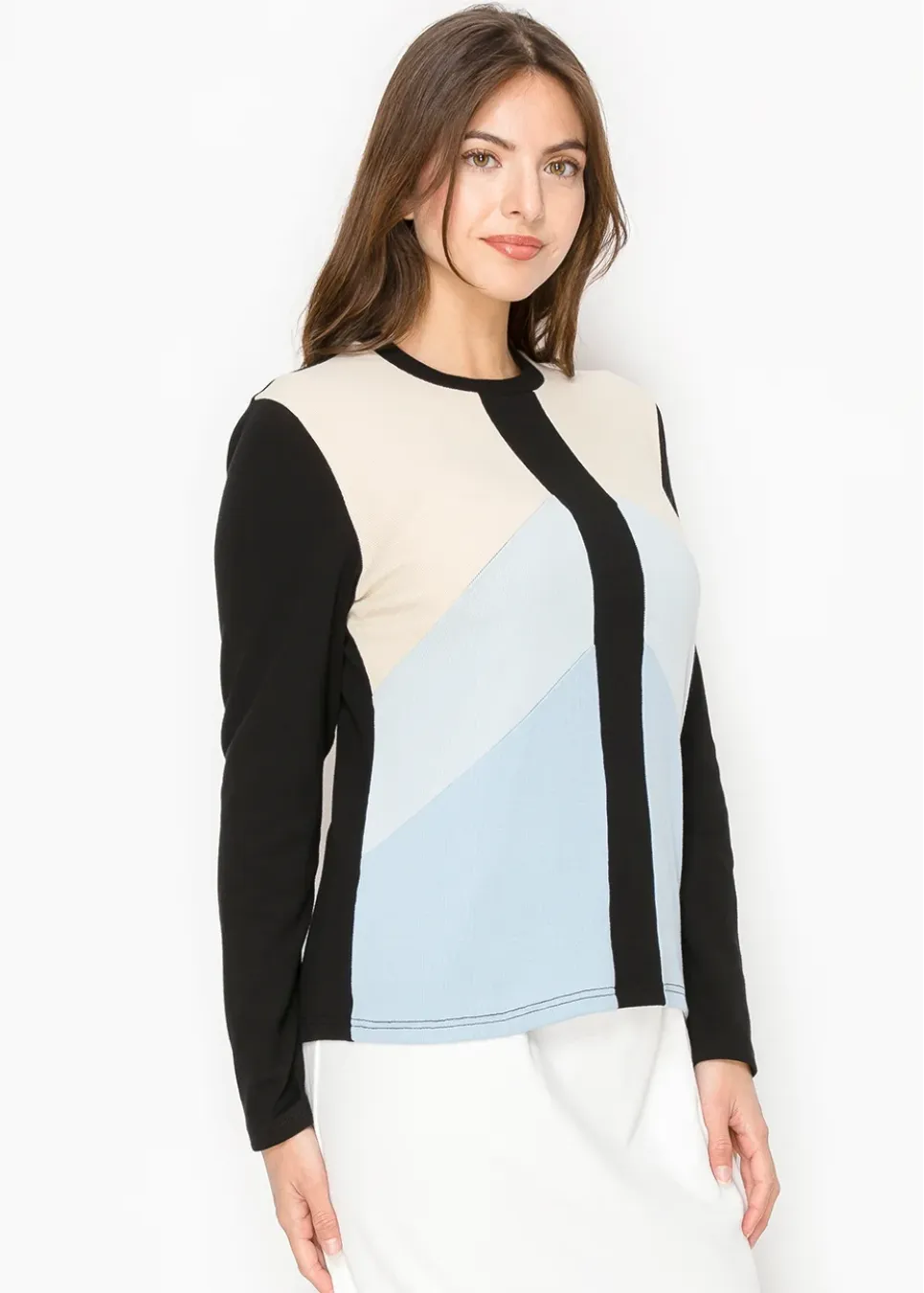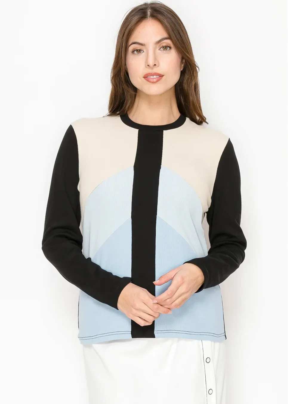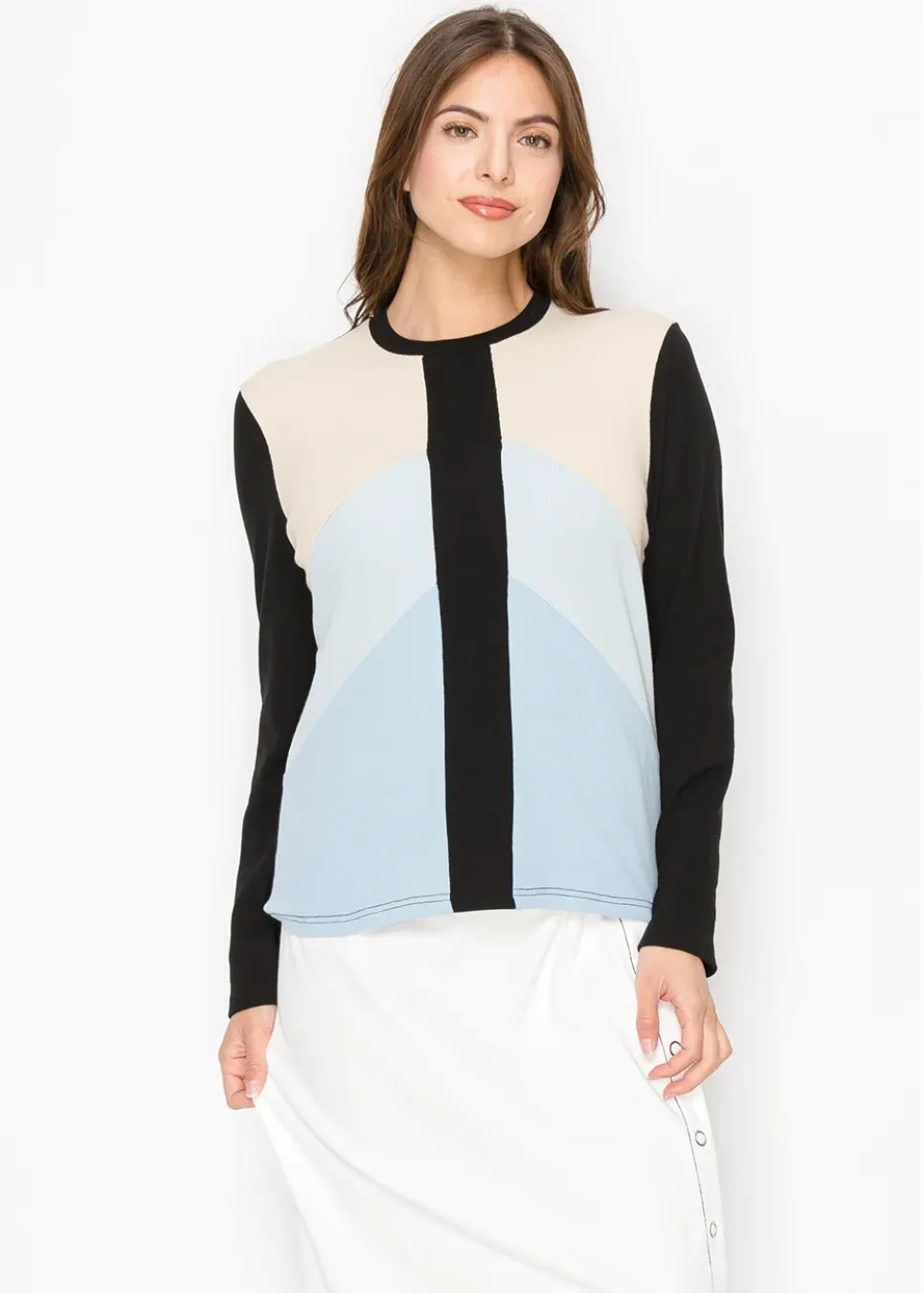 A modern twist on classic tones, this top features neutral beige and light blue contrasted with a bold black stripe. The clean, structured design offers a fresh yet timeless appeal for your everyday wardrobe.