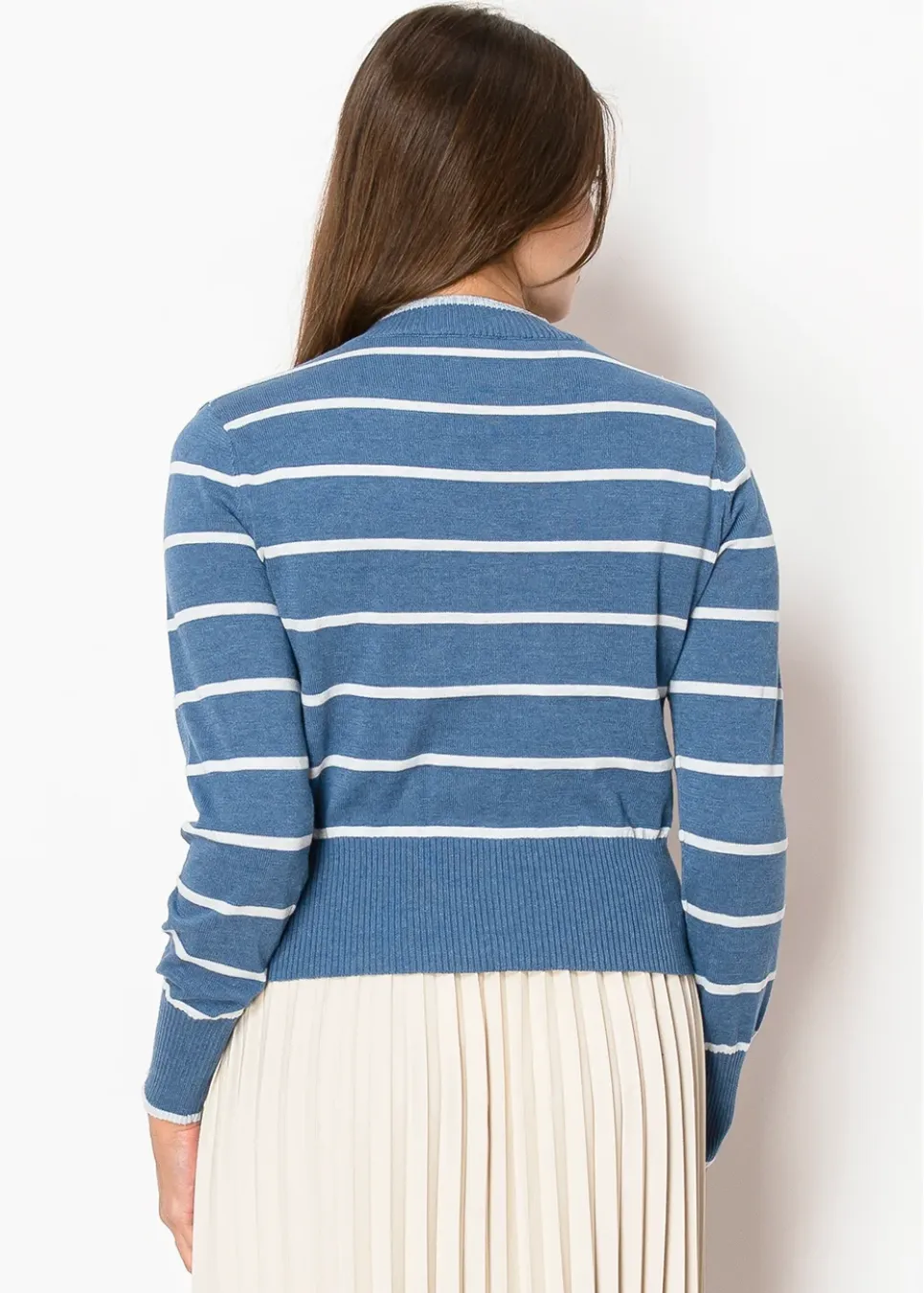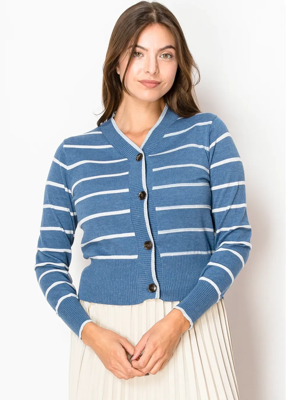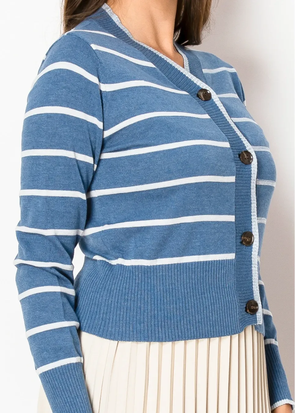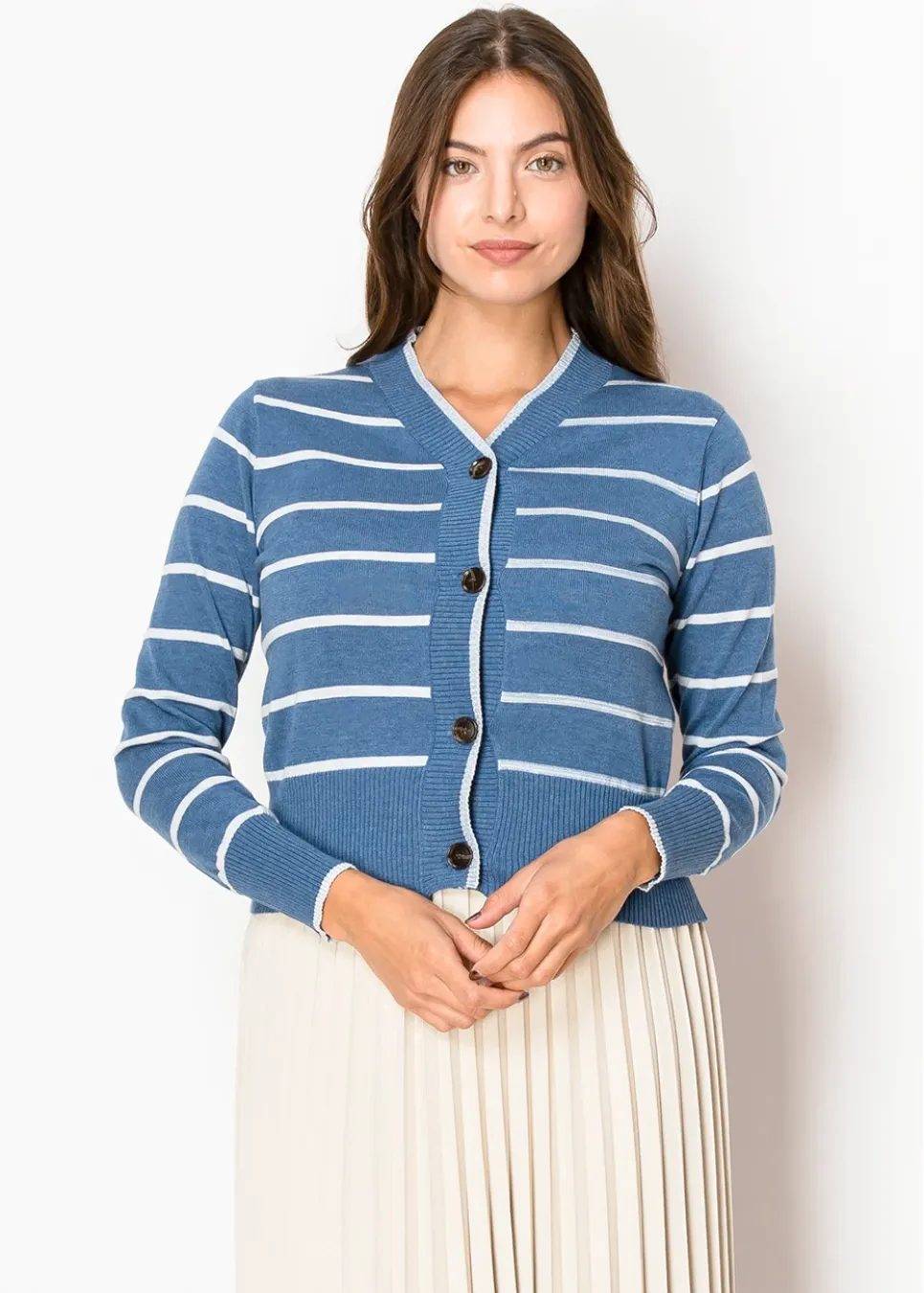 Light and airy, this sky-blue cardigan with crisp white stripes is the perfect balance of casual and refined. The button-front detail gives you styling versatility, while the ribbed knit keeps it feeling snug but not tight.