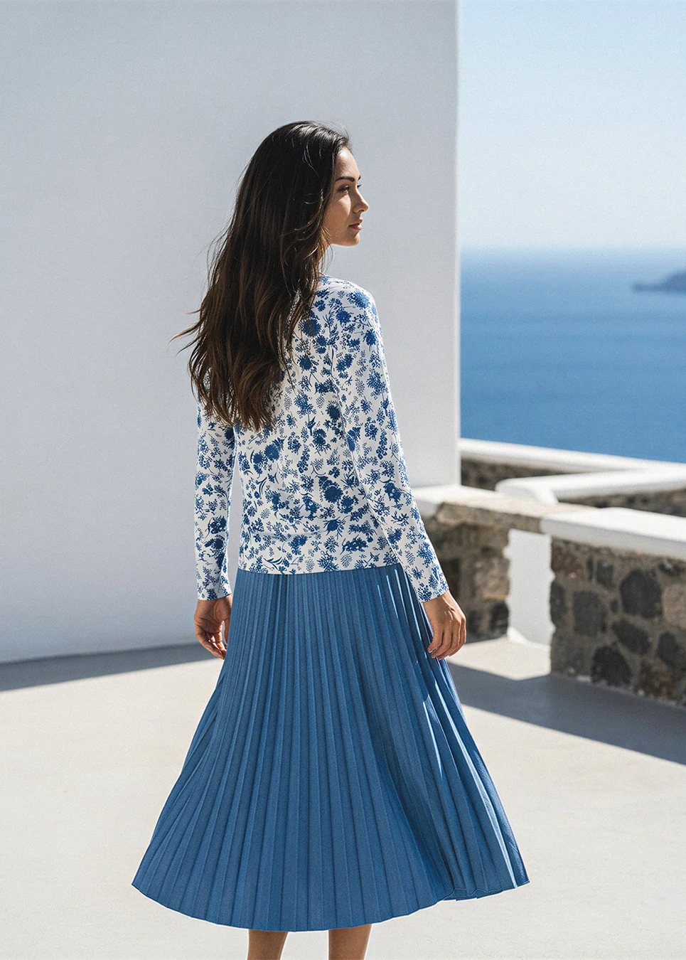 Blue Floral Top & Pleated Skirt Outfit