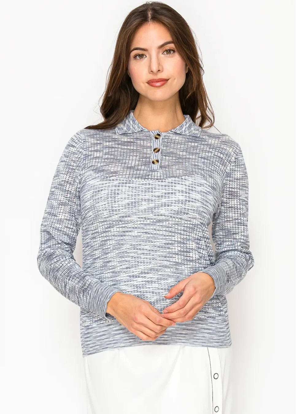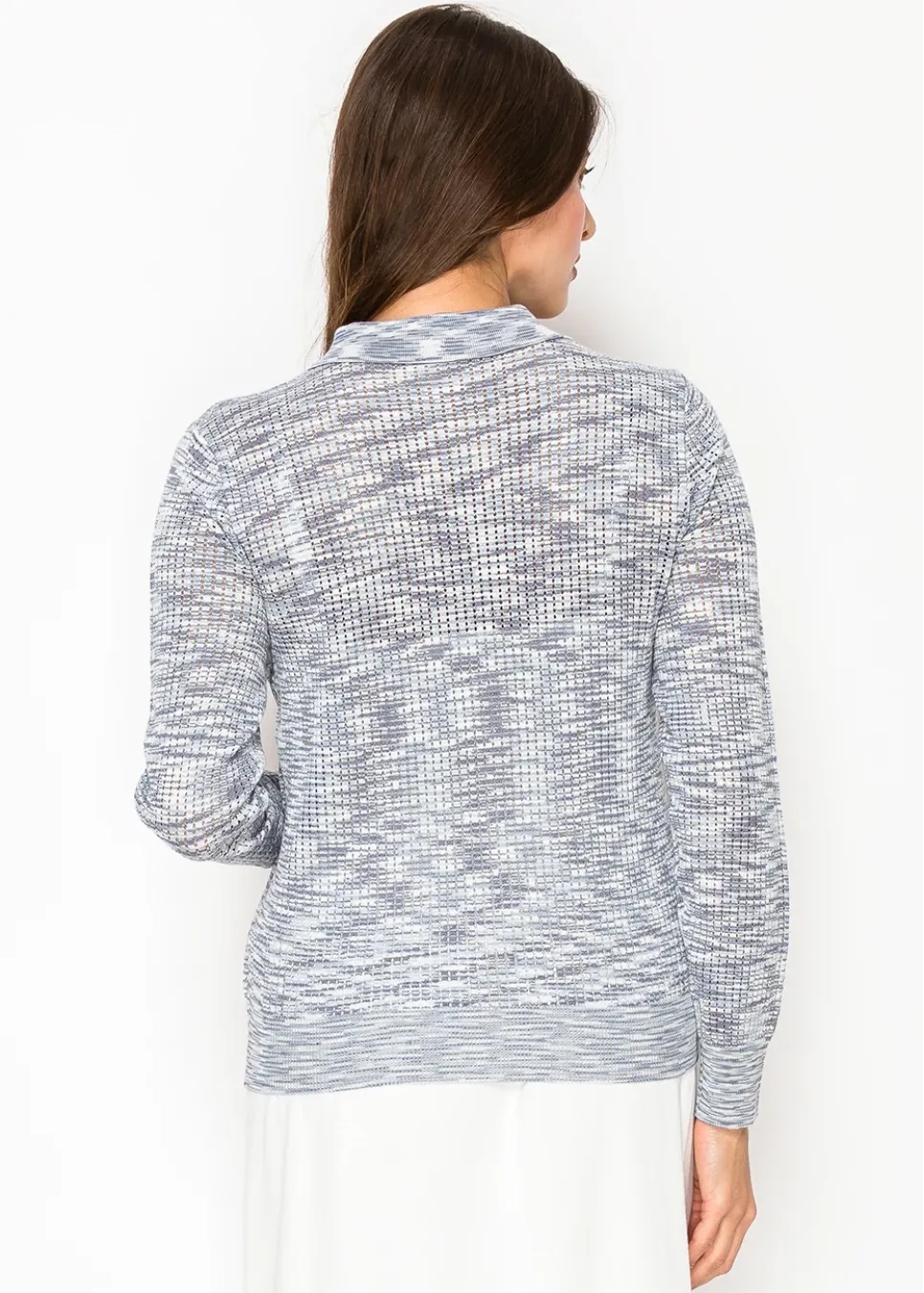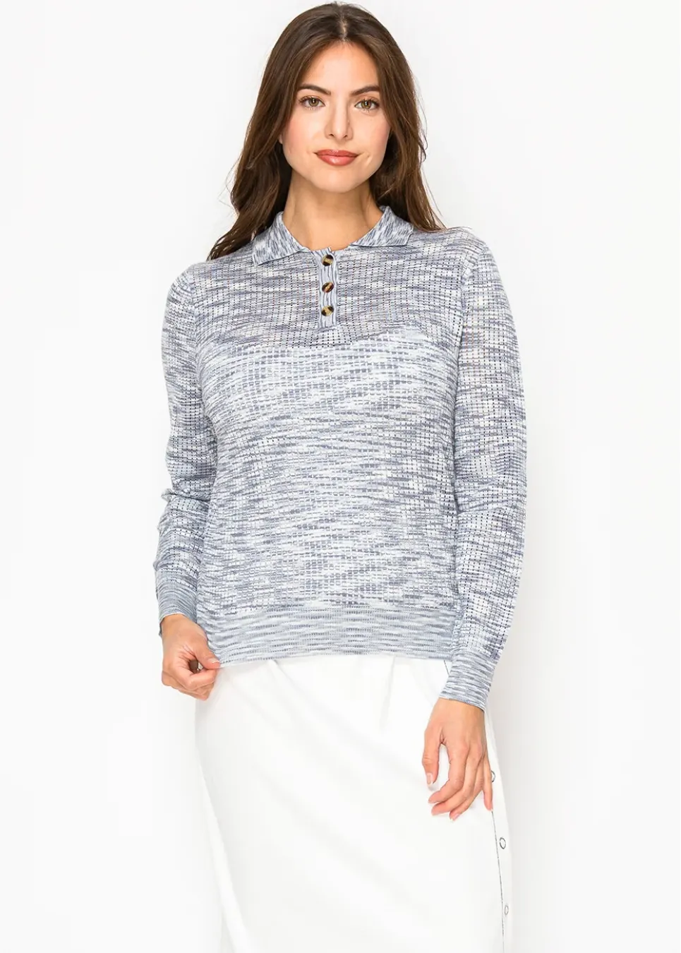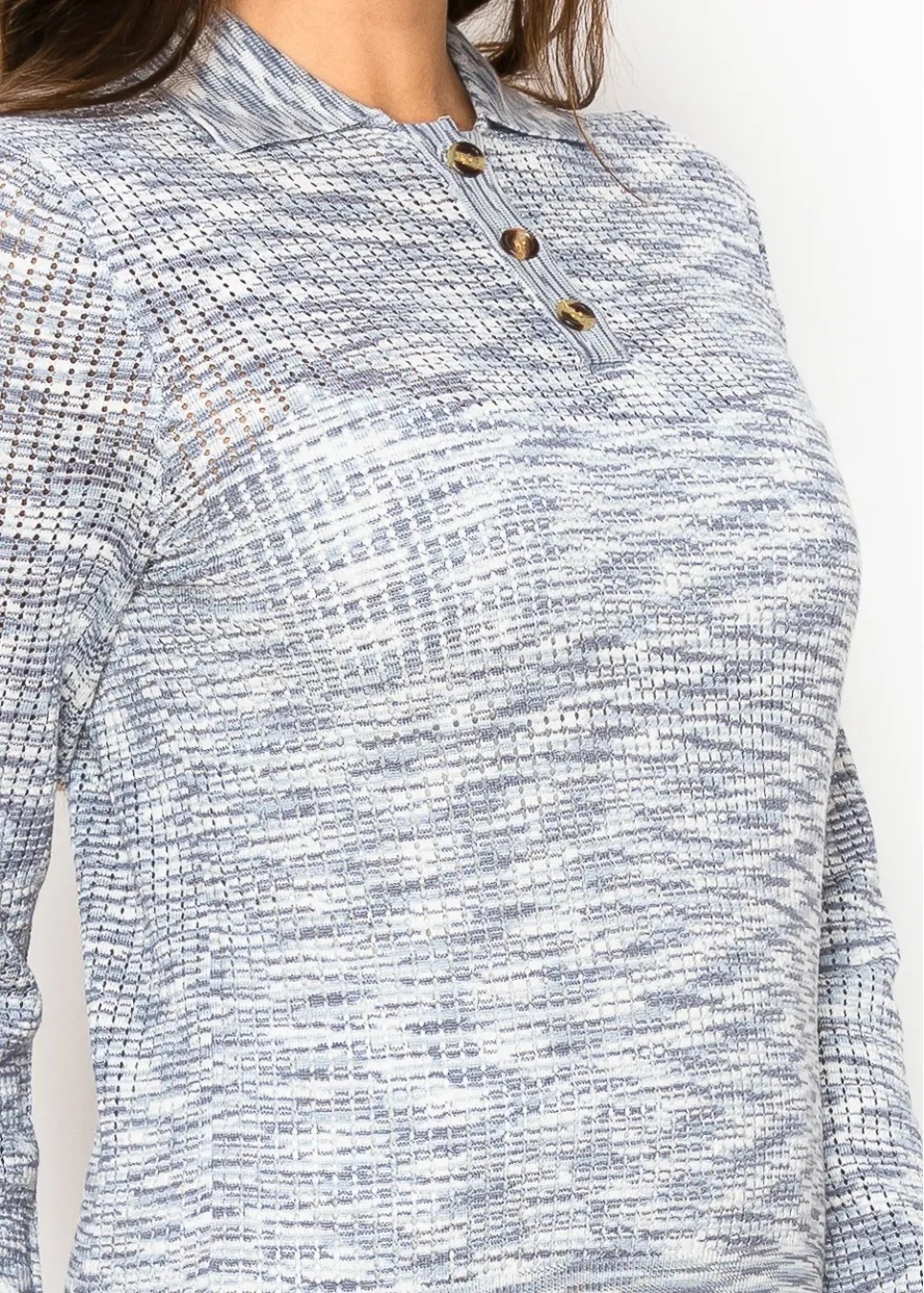 A lightweight knit with an understated texture, this sweater features a soft blue pattern and a classic buttoned collar. Perfect for adding a touch of elegance to a casual look.