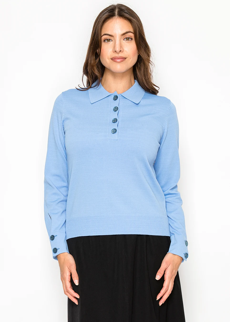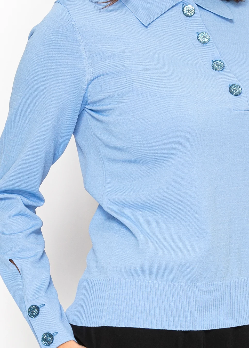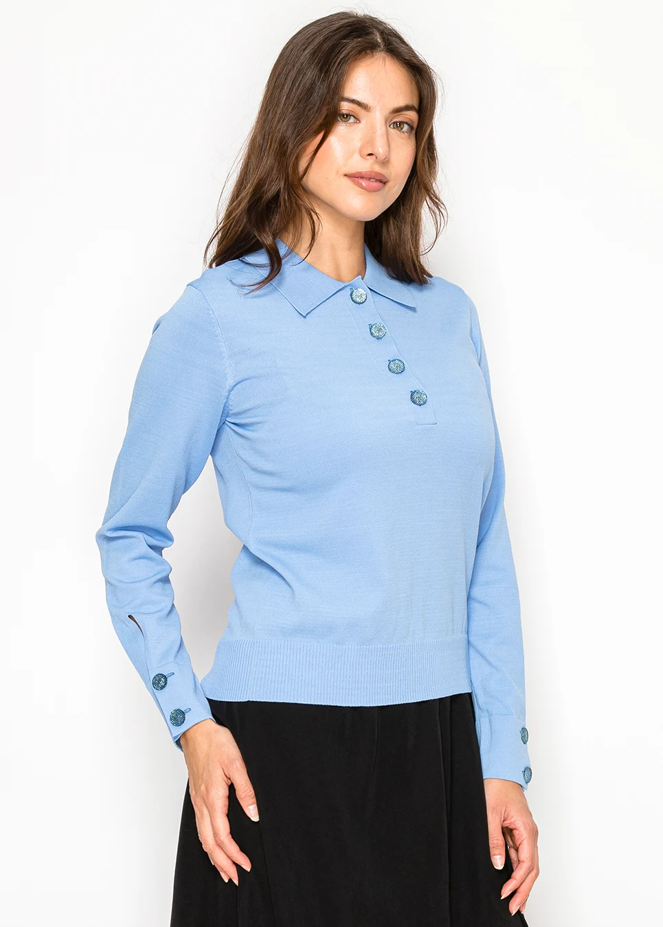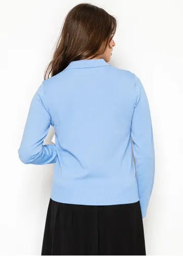 Blue Knit Top with Collar and Button Detail