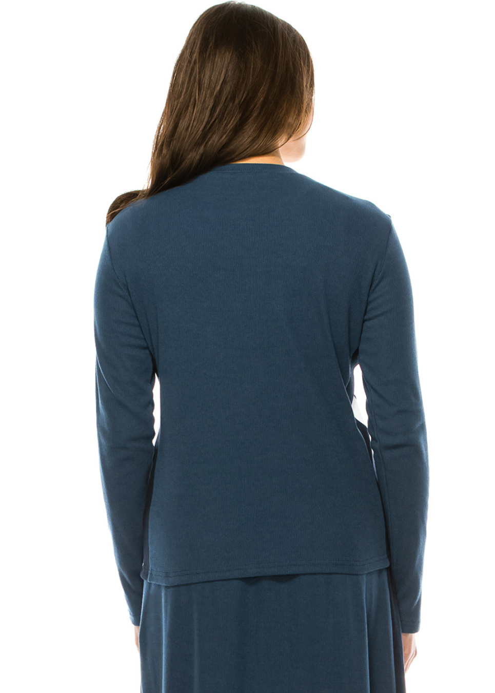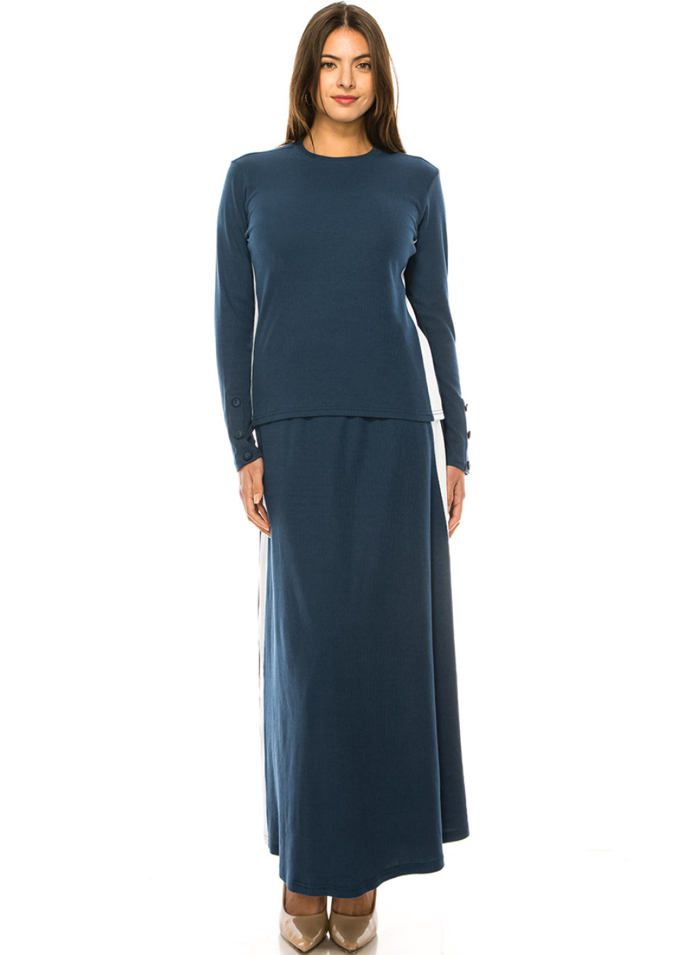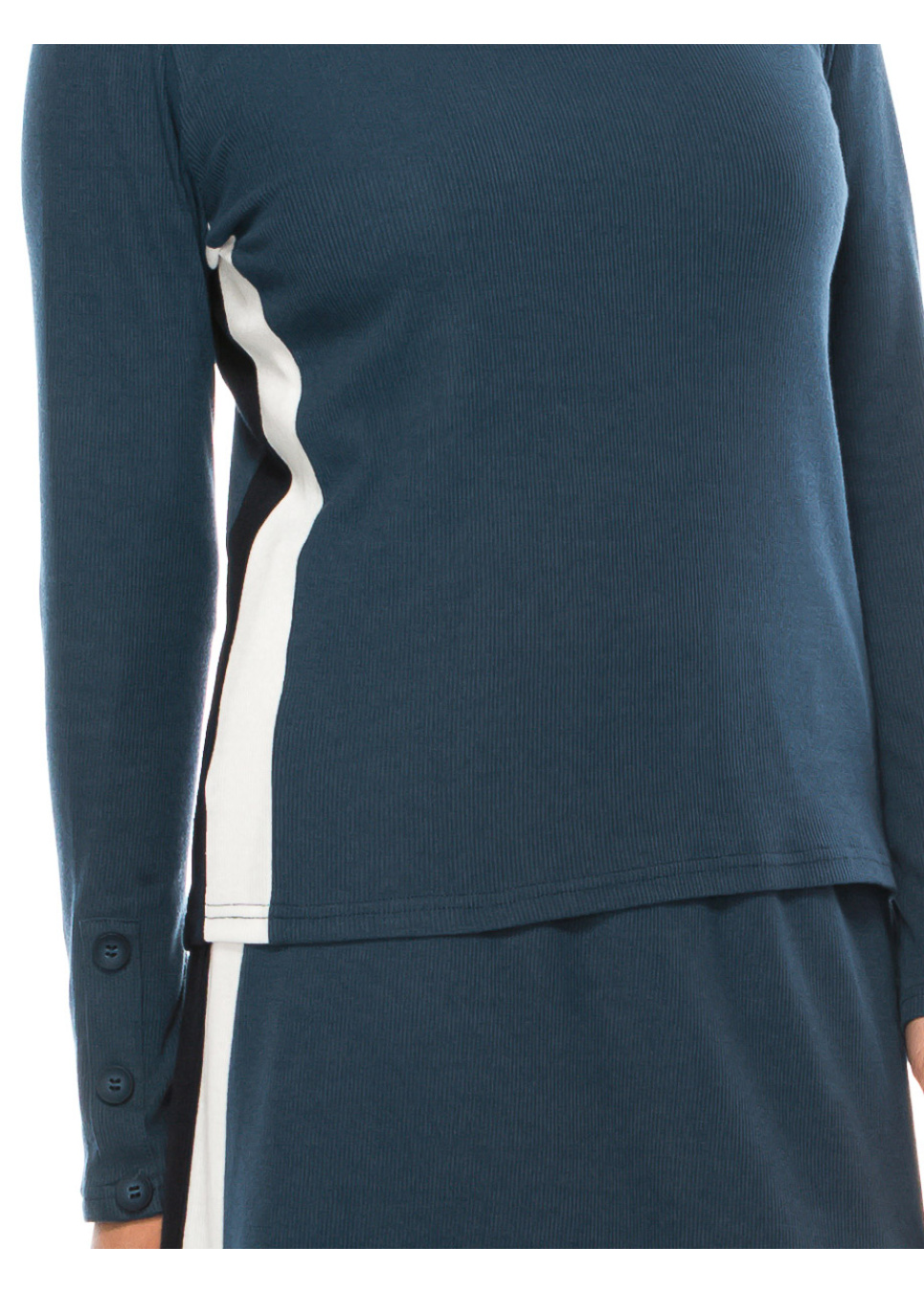 Discover the perfect addition to your modest clothing collection with this stunning blue long sleeve t-shirt. Featuring playful white and black stripes on the sides and decorative buttons on the sleeves, this top is perfect for those who love to combine style and modesty.