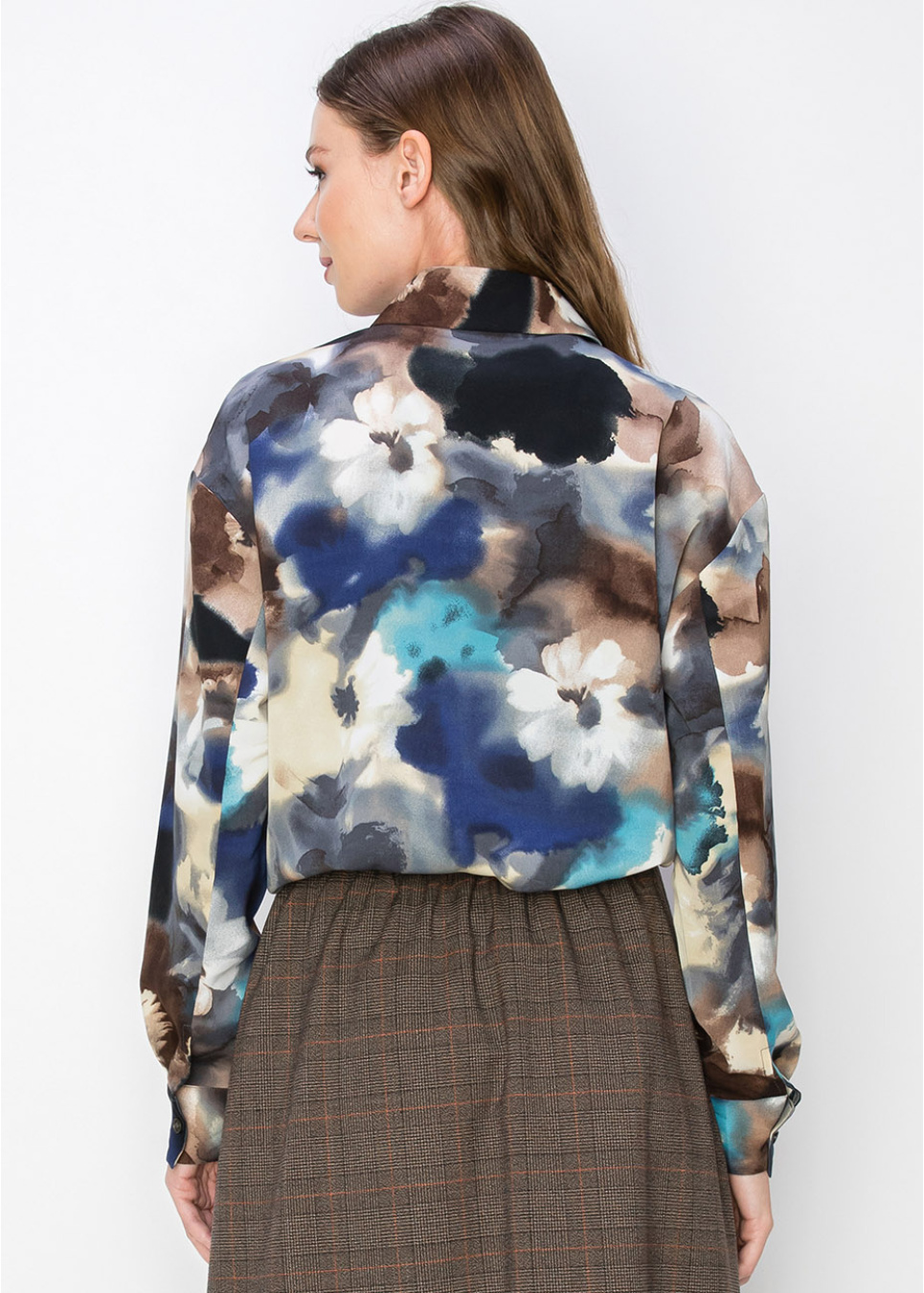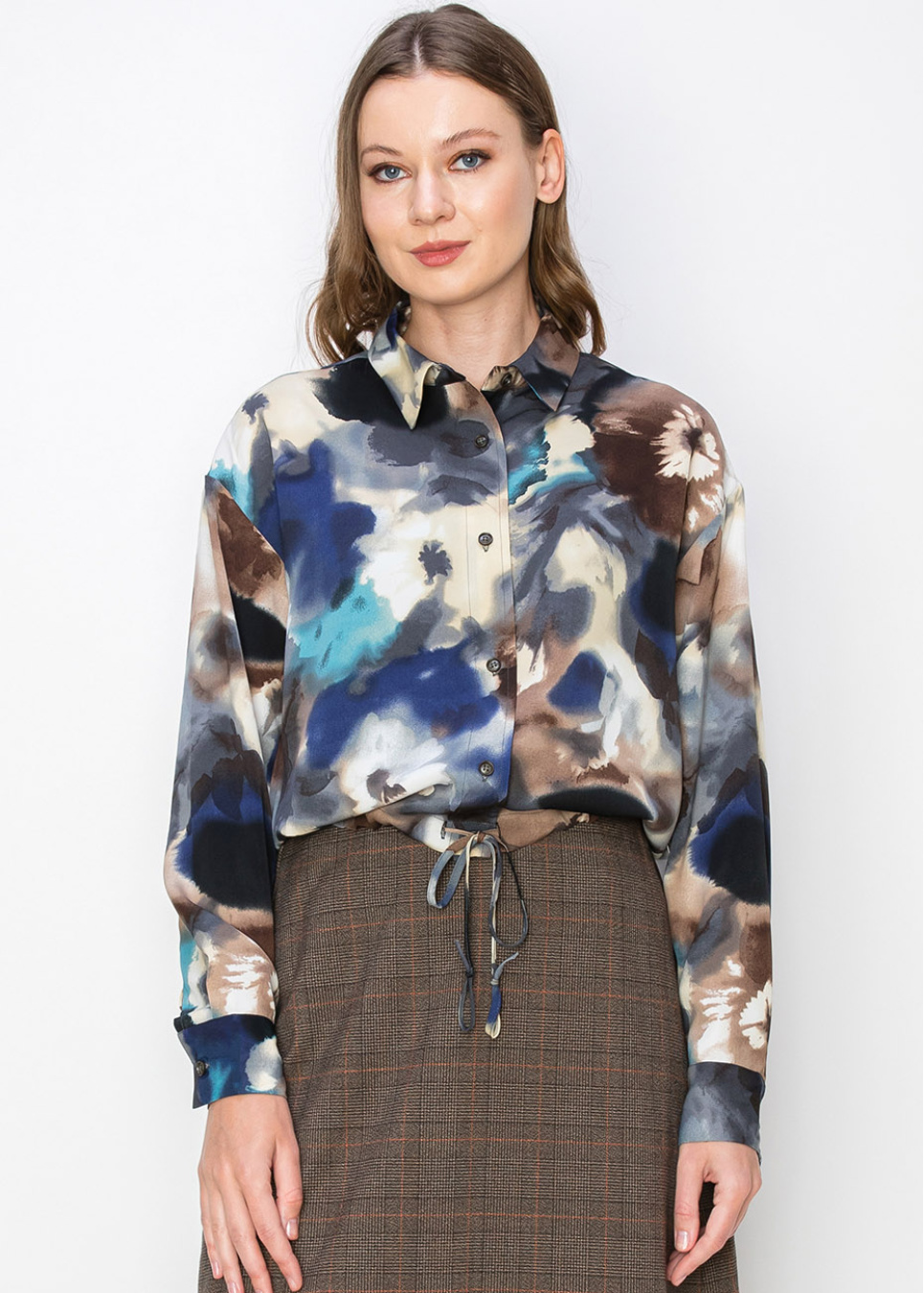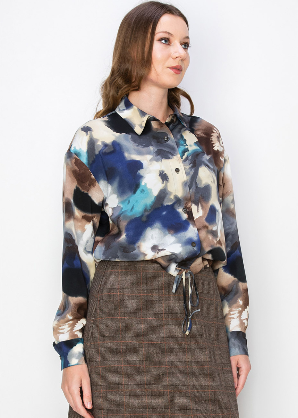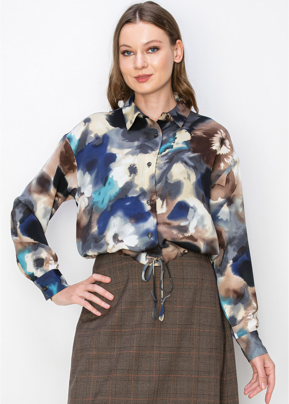 This blouse features a calming watercolor floral design in shades of blue, beige, and brown. The button-down front and drawstring waist offer a customizable fit, making it both stylish and comfortable. With long sleeves, it provides modest coverage, perfect for any occasion.