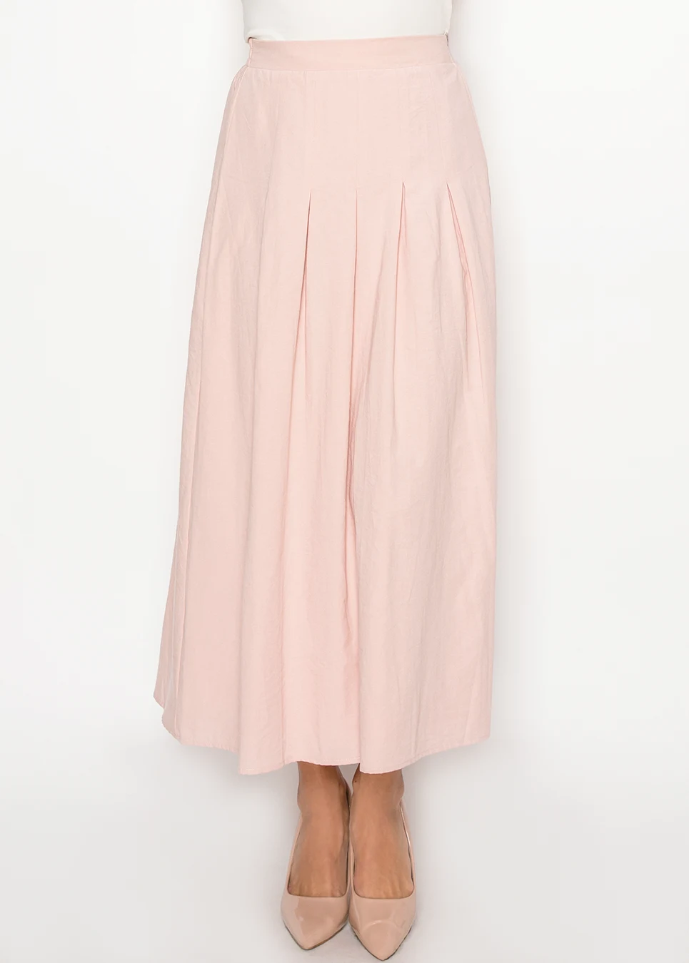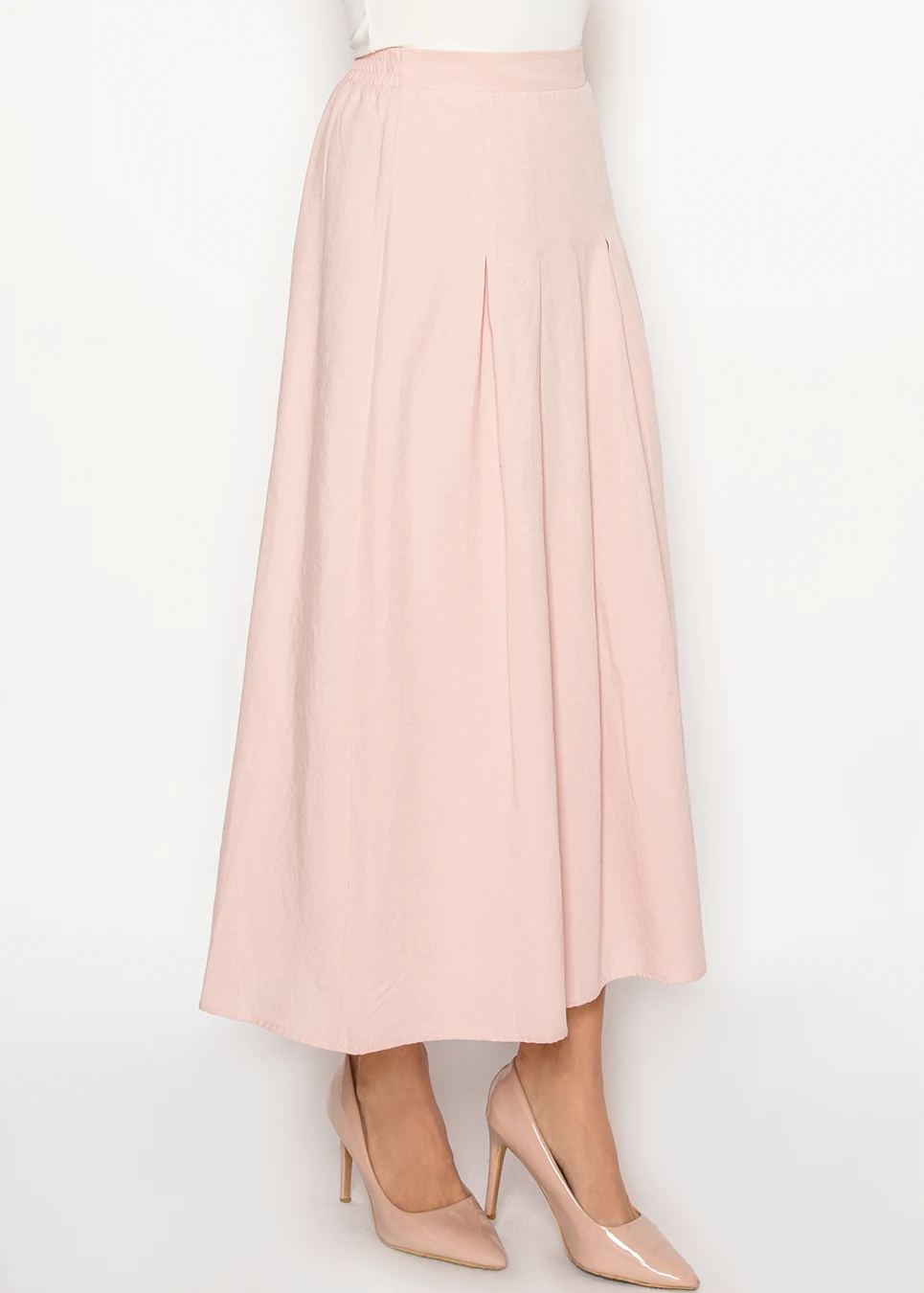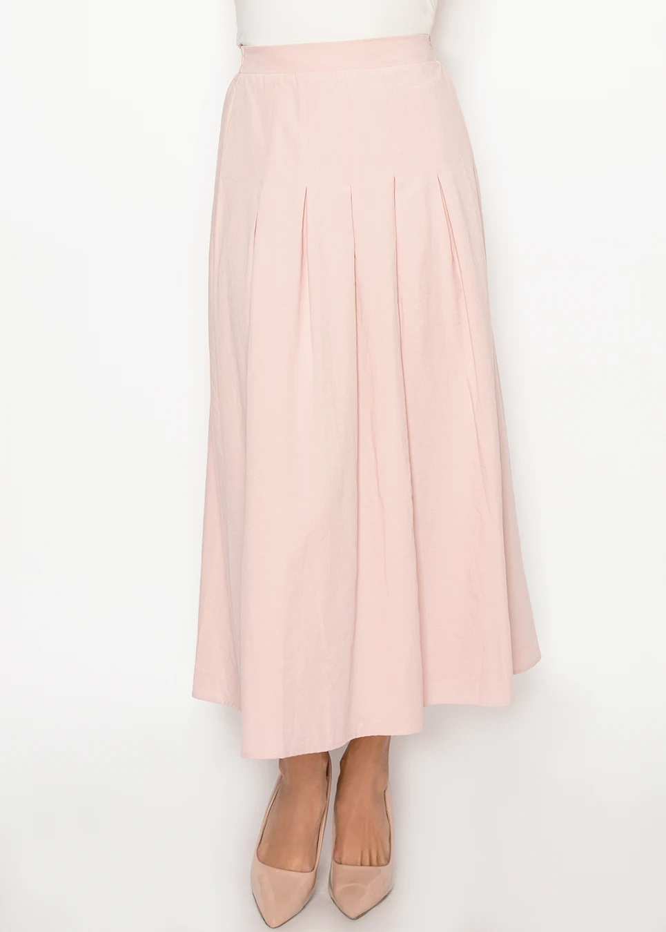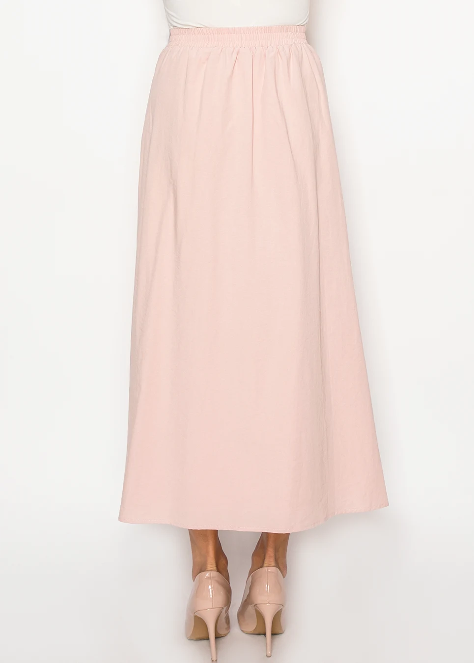Clean lines in the front, gentle fullness through the hem — this blush midi feels polished without trying too hard. It moves beautifully as you walk and pairs just as easily with a crisp blouse as it does with a lightweight knit.