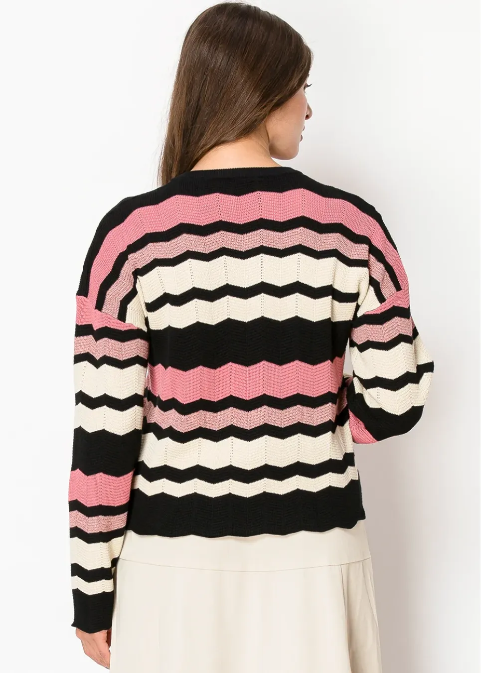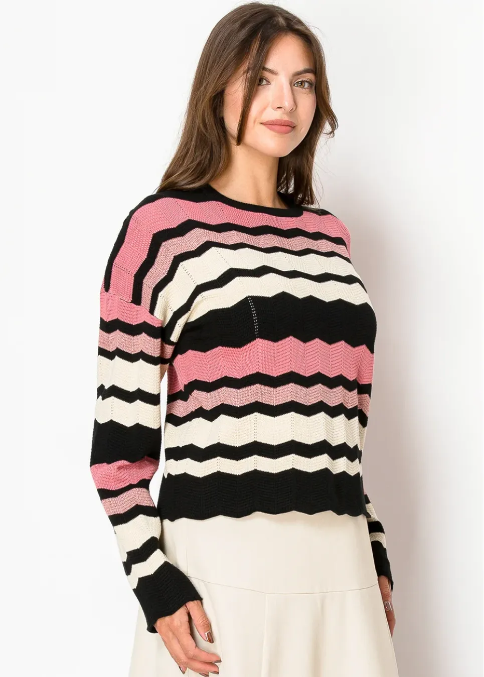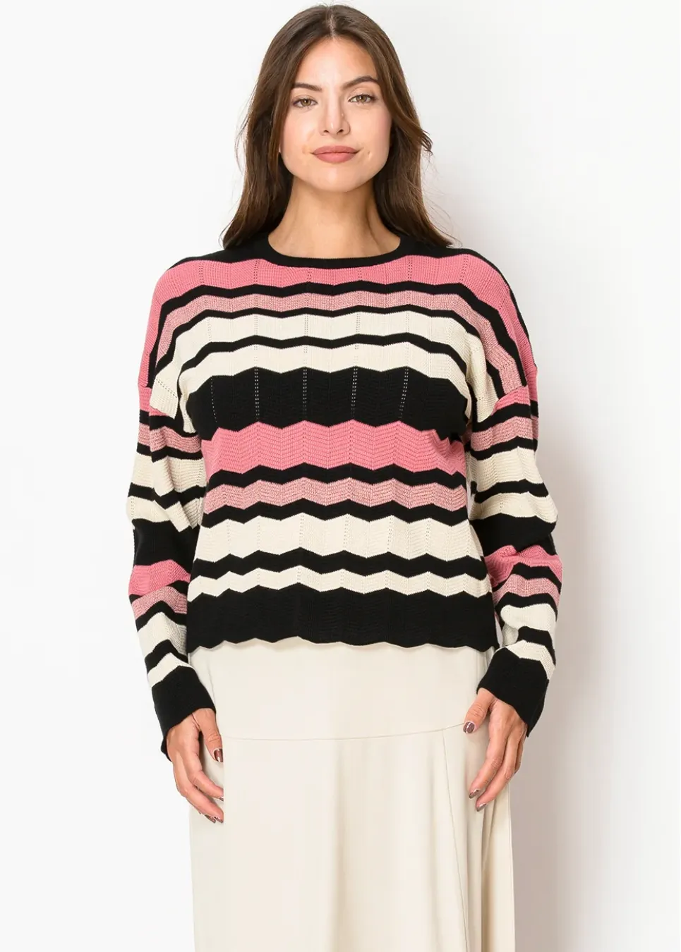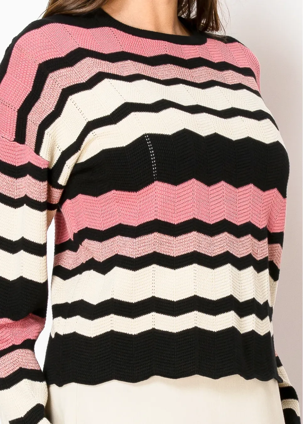 A fresh take on timeless chevrons, this sweater combines soft blush pink and creamy white with bold black stripes. The scalloped hem and textured details bring just the right amount of charm, perfect for adding personality to a simple outfit.