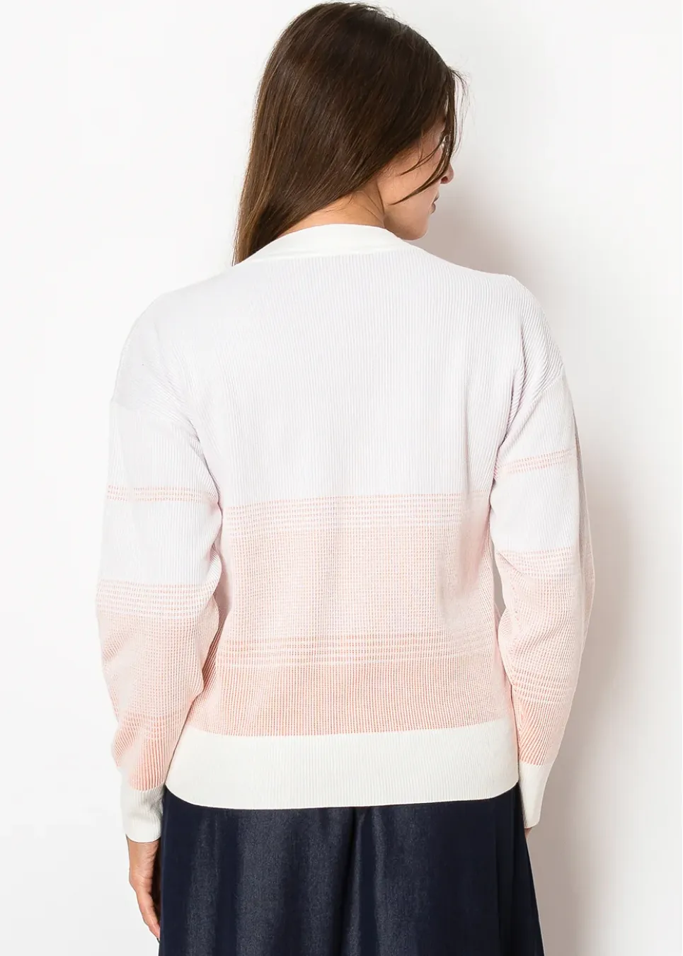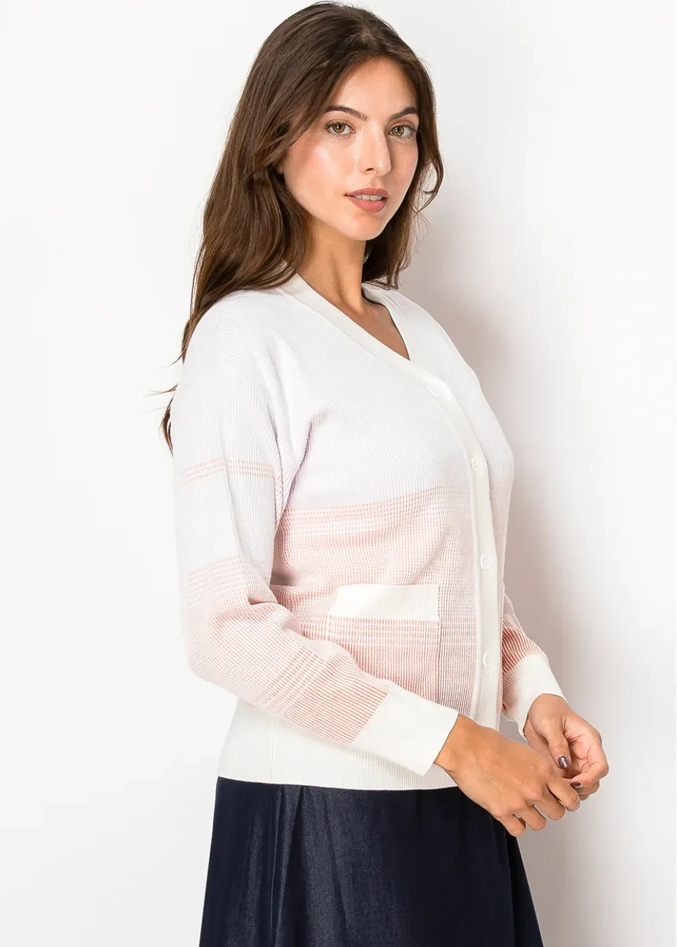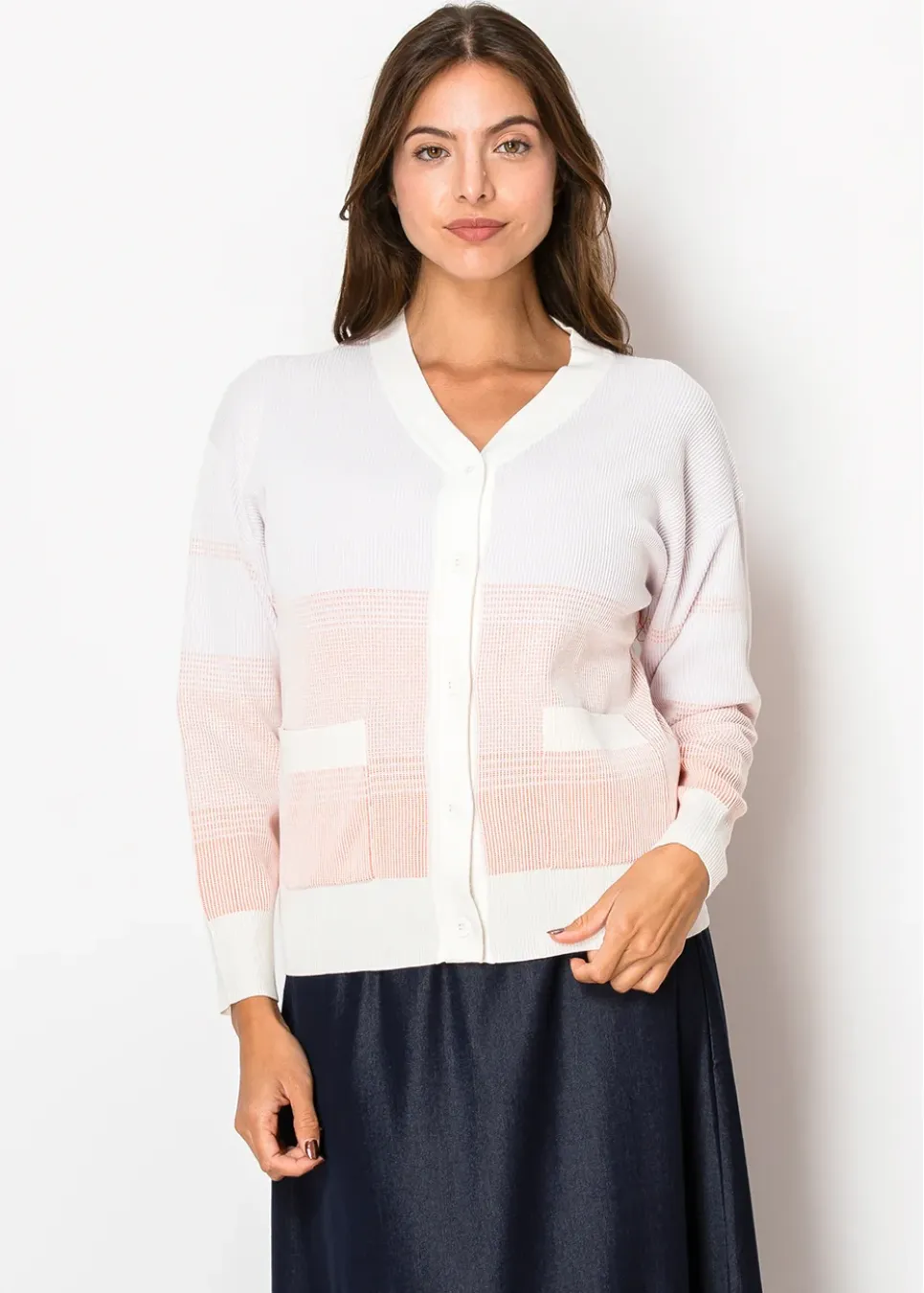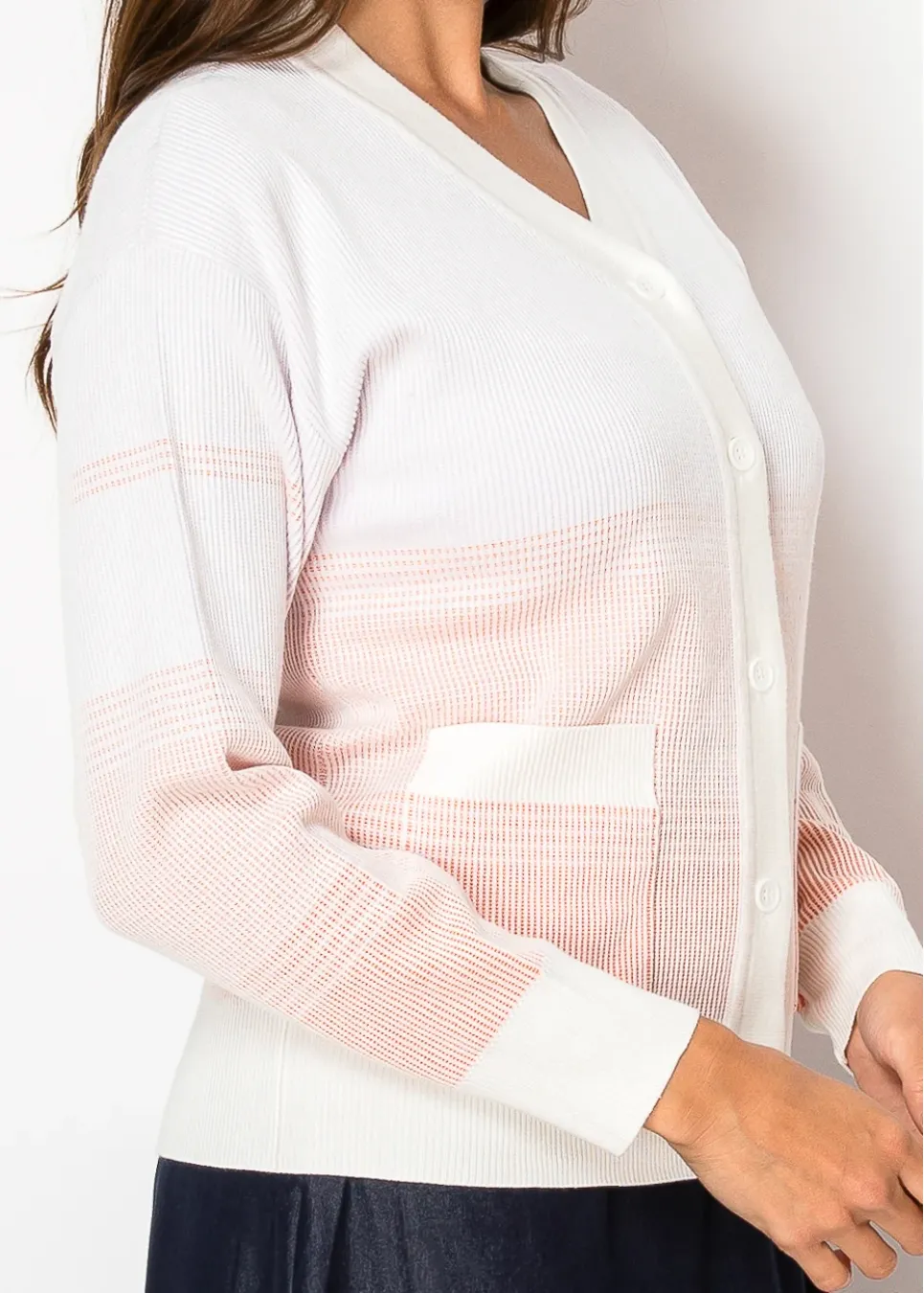 A perfect balance of classic and modern. The gentle peach fade adds a little something special without being too much, and the lightweight knit makes it an easy choice for layering. Finished with buttons and pockets for that everyday, practical feel.