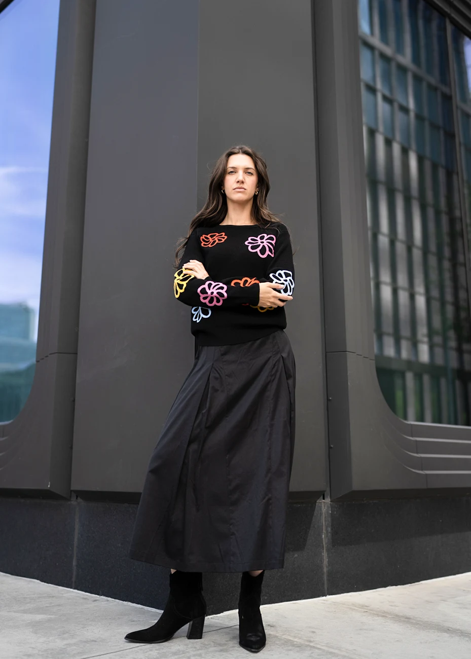 A colorful celebration of modern femininity — playful blooms on sleek black knit meet a swishy skirt for a confident, creative finish.
