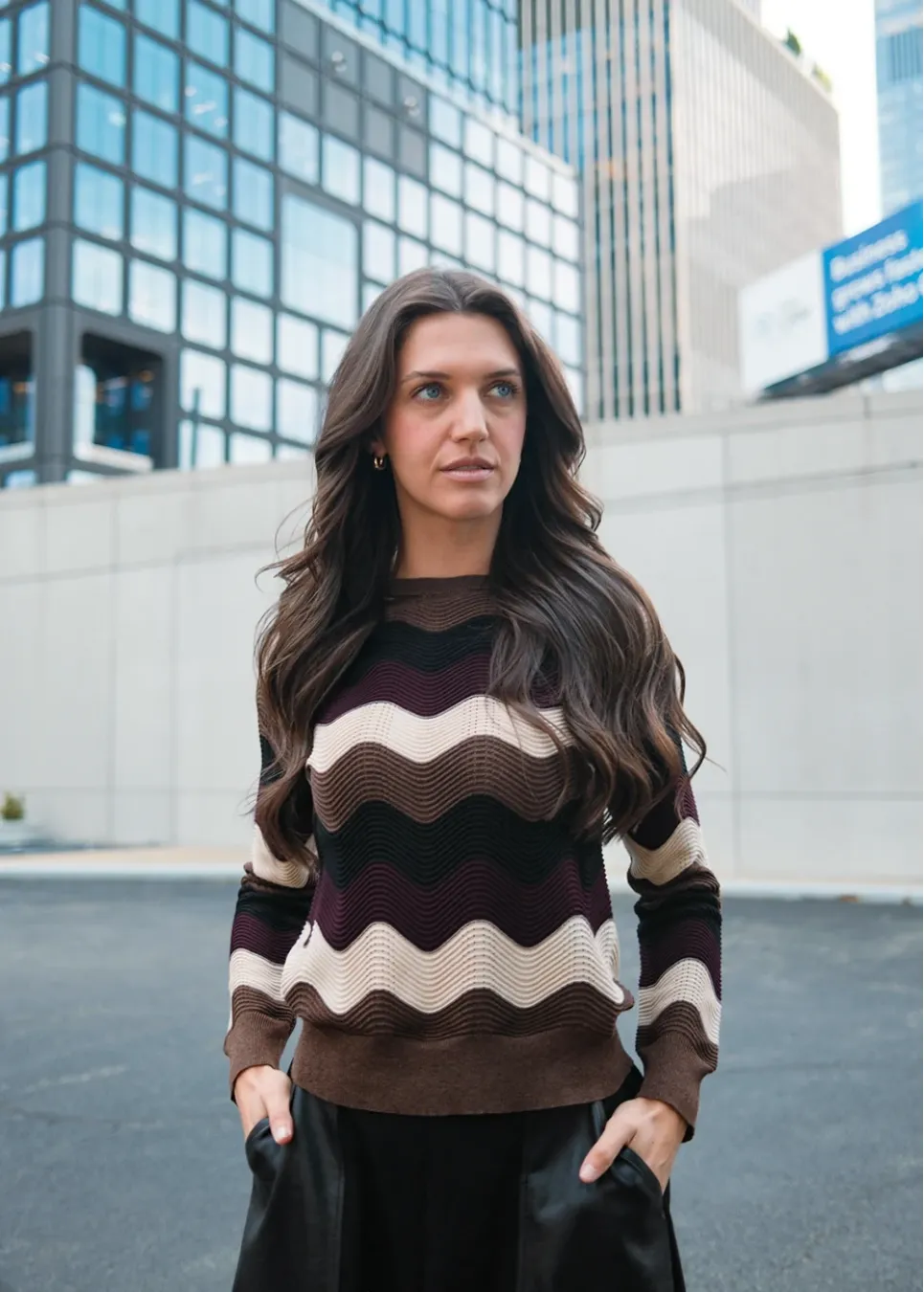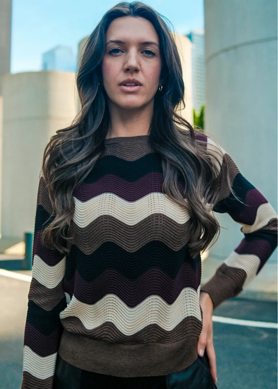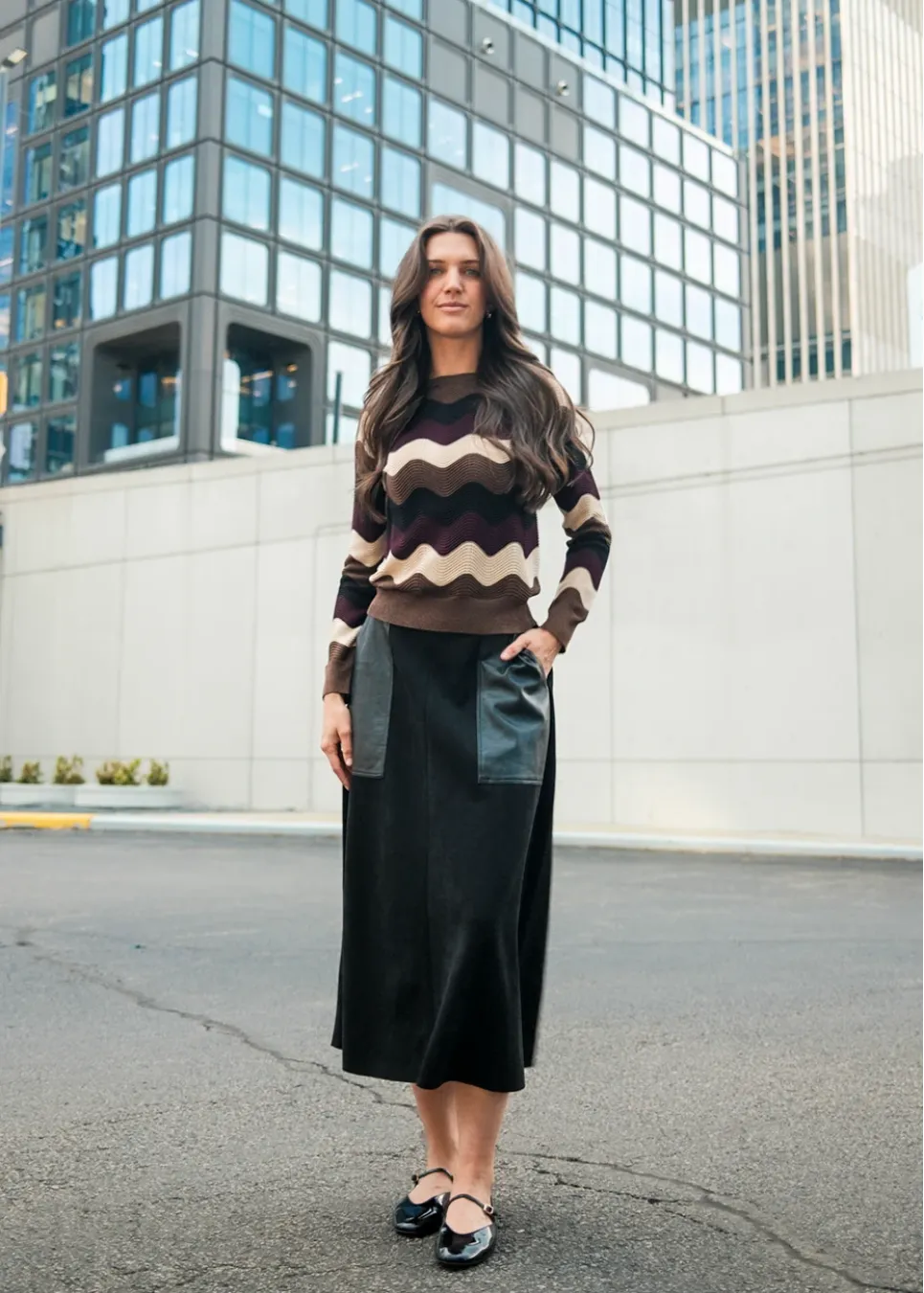 This sweater feels like fall in knit form — warm stripes, soft stretch, and just enough texture. It’s the piece you’ll want for coffee runs and cozy nights in.