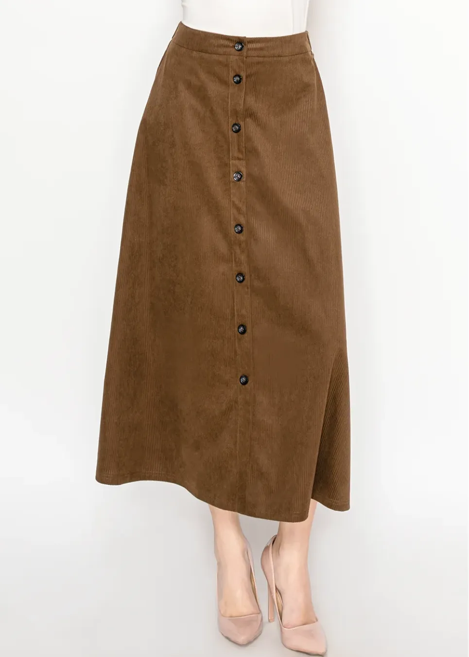 Brown Corduroy Button-Front Midi Skirt