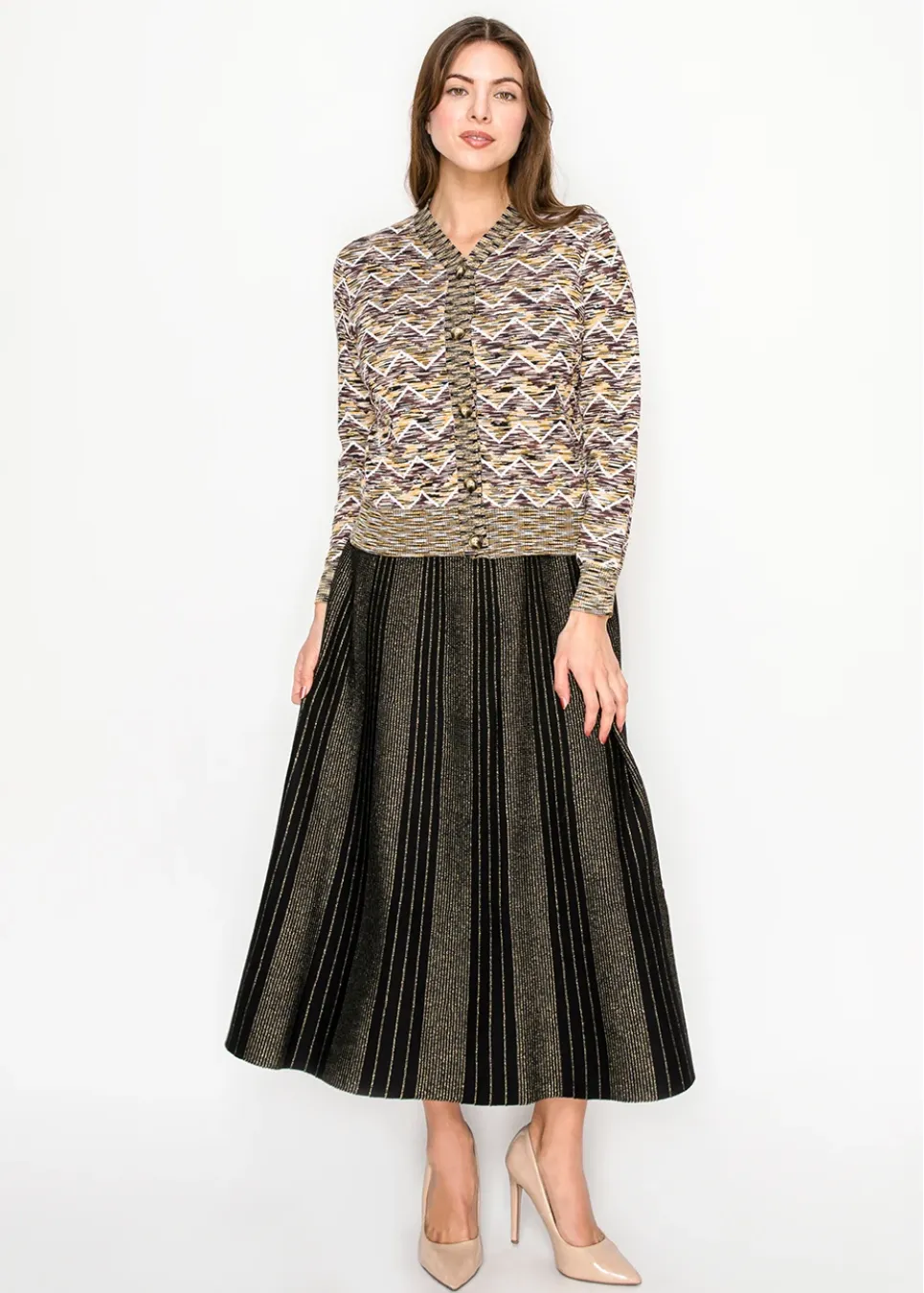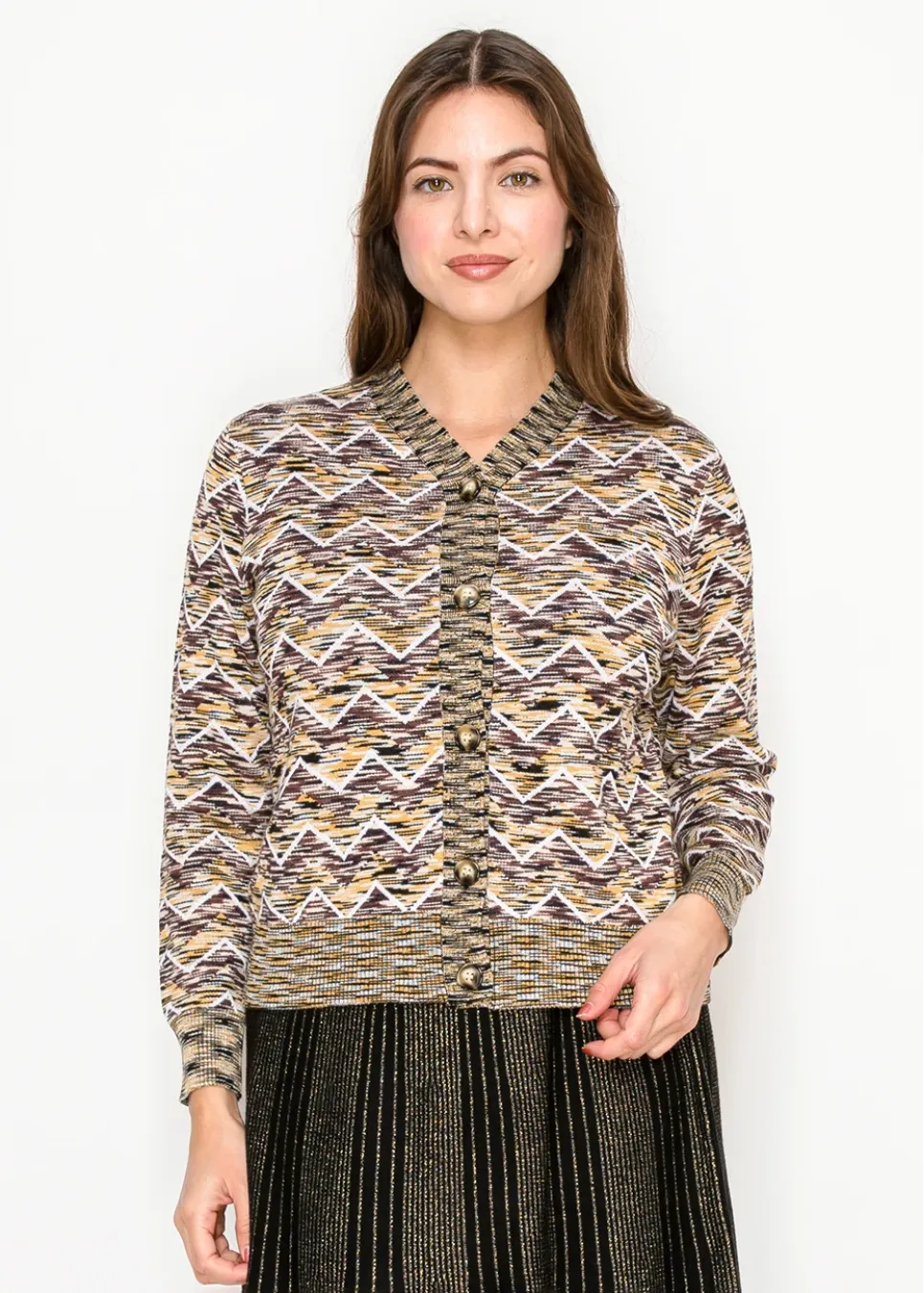 A geometric design in earthy tones gives this cardigan a modern, textured edge. The bold chevron knit keeps it fresh and eye-catching.