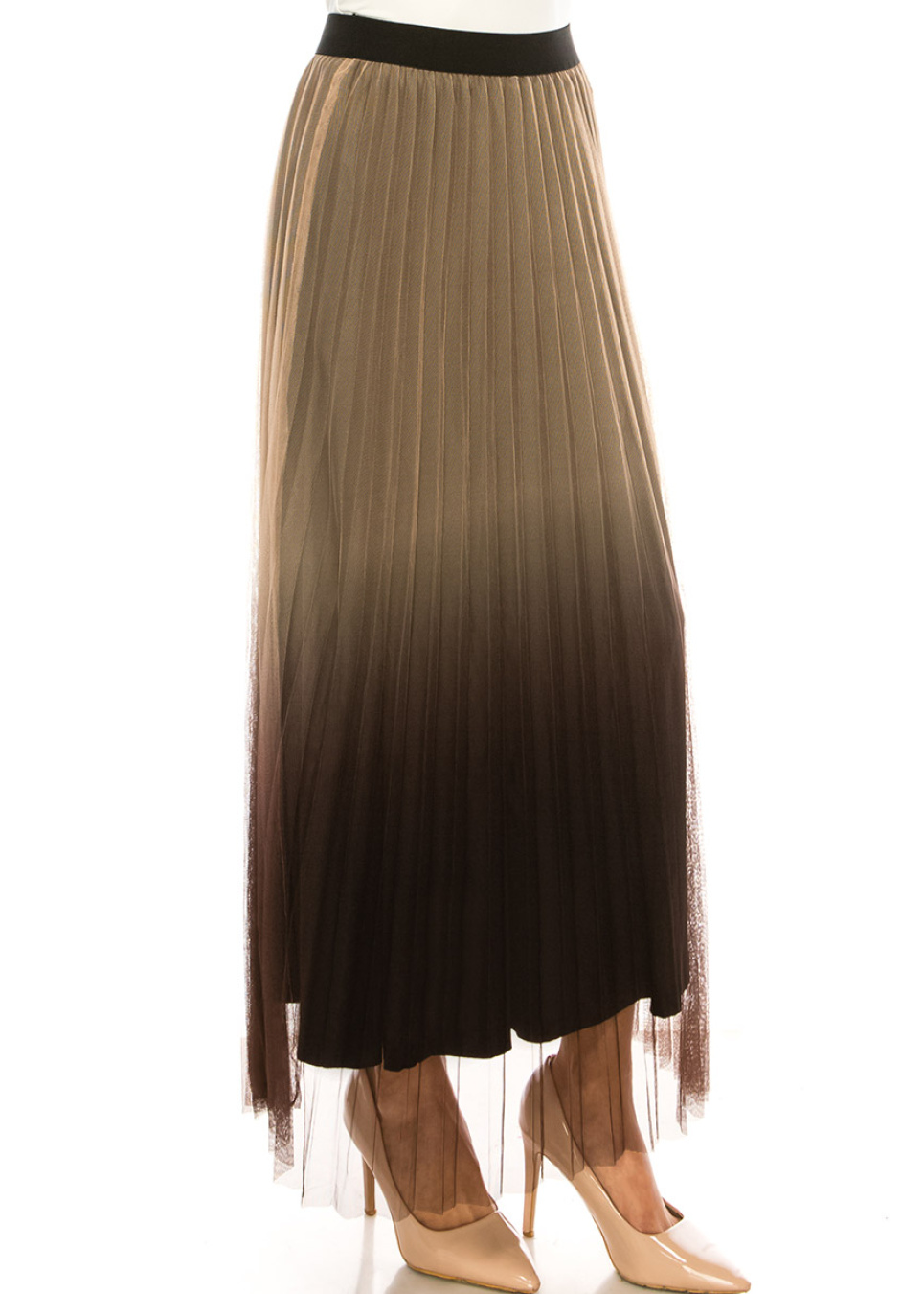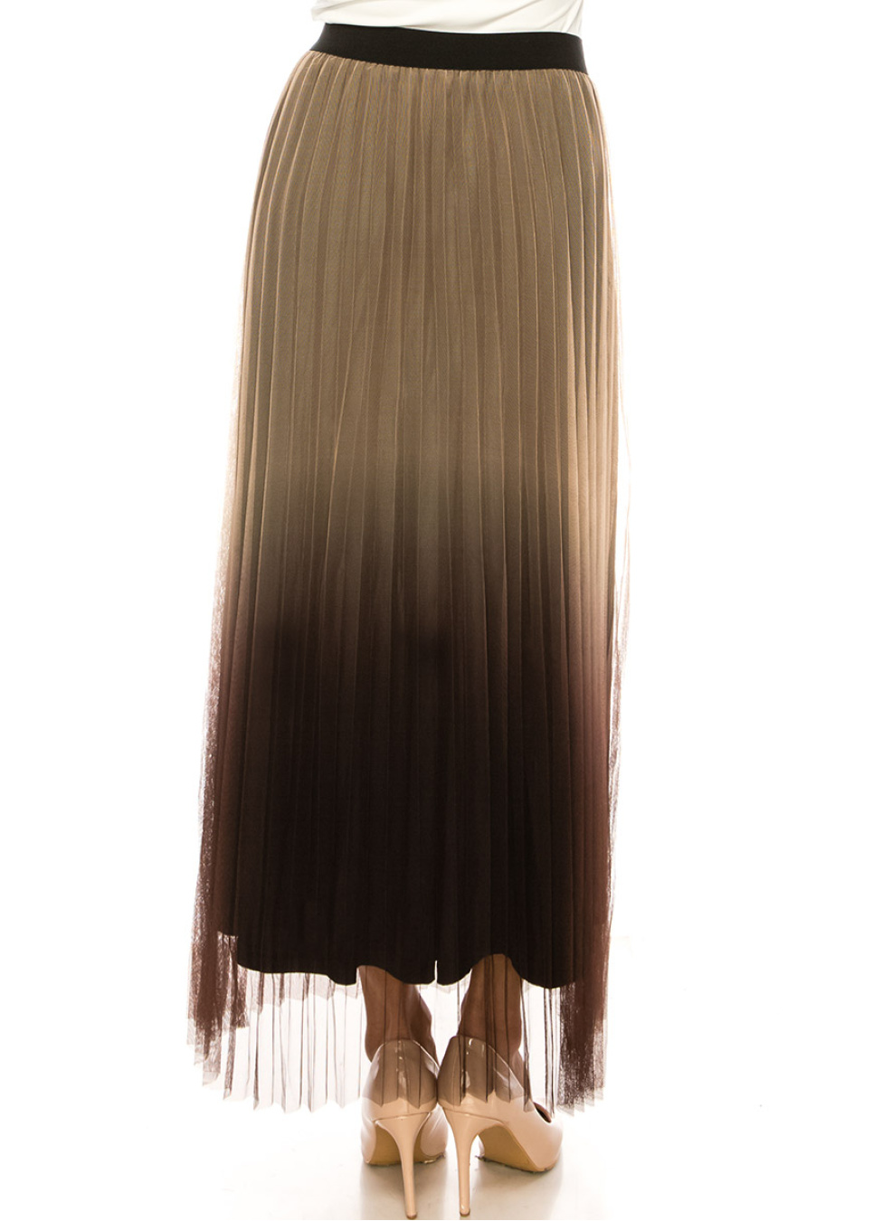 Experience the charm and elegance of this brown pleated midi skirt with a tulle overlay. The combination of the pleats and tulle creates a stunning visual texture that is sure to make a statement. Perfect for any occasion, the modest midi length ensures appropriate coverage. This versatile piece can be paired with a variety of tops, making it a must-have addition to your modest wardrobe.