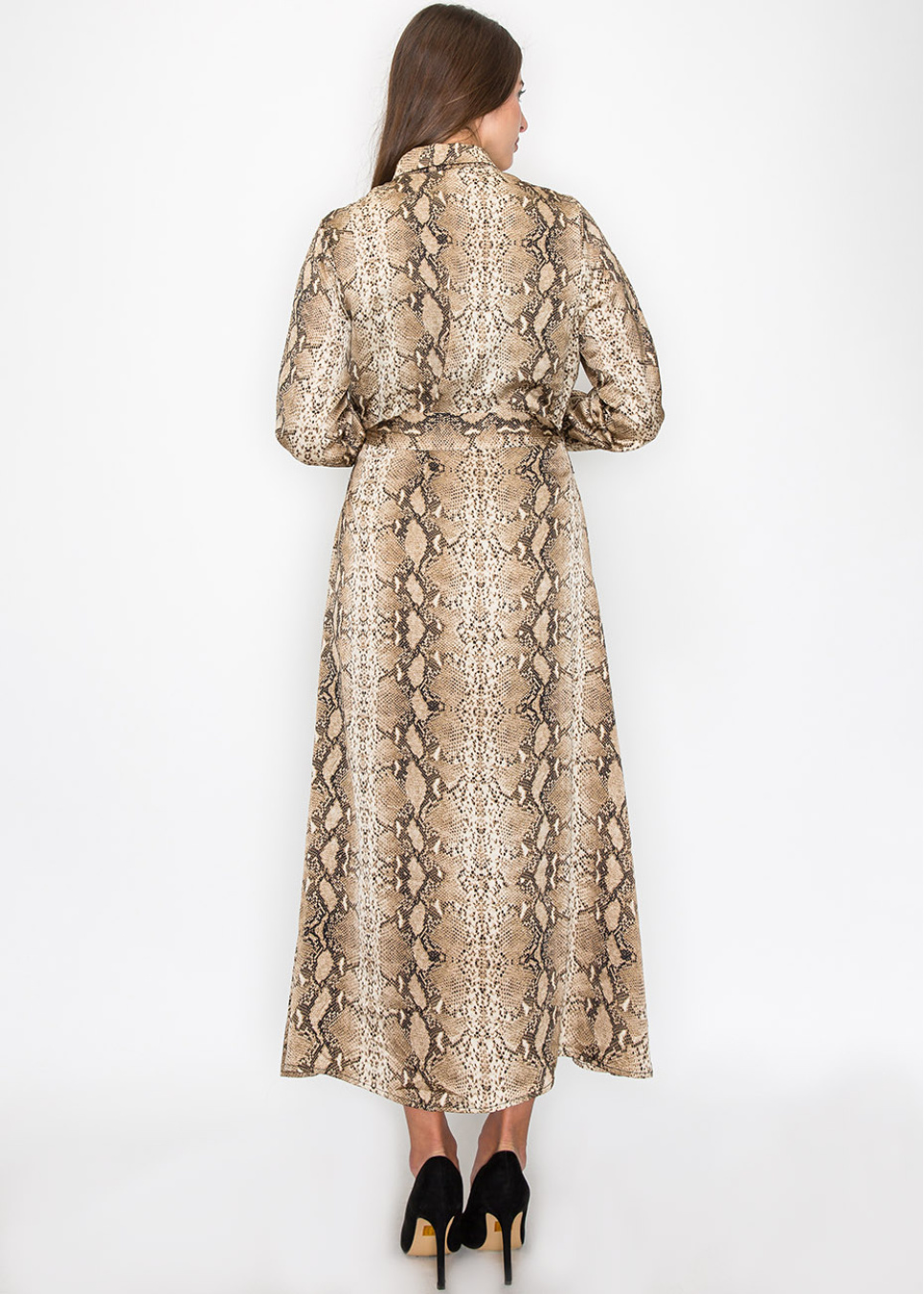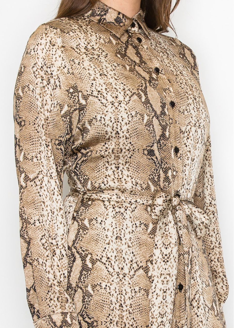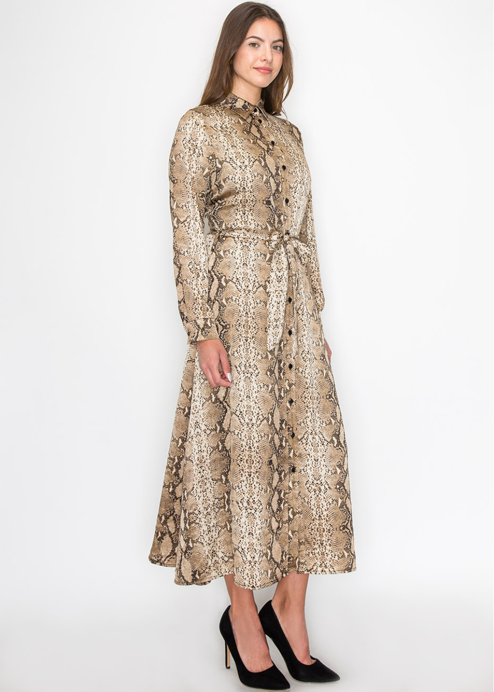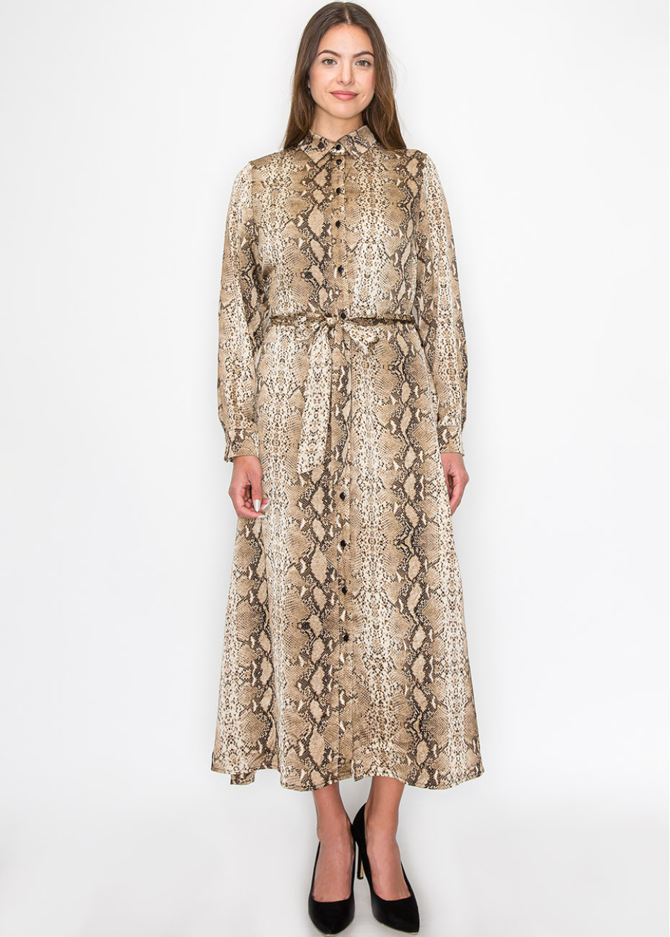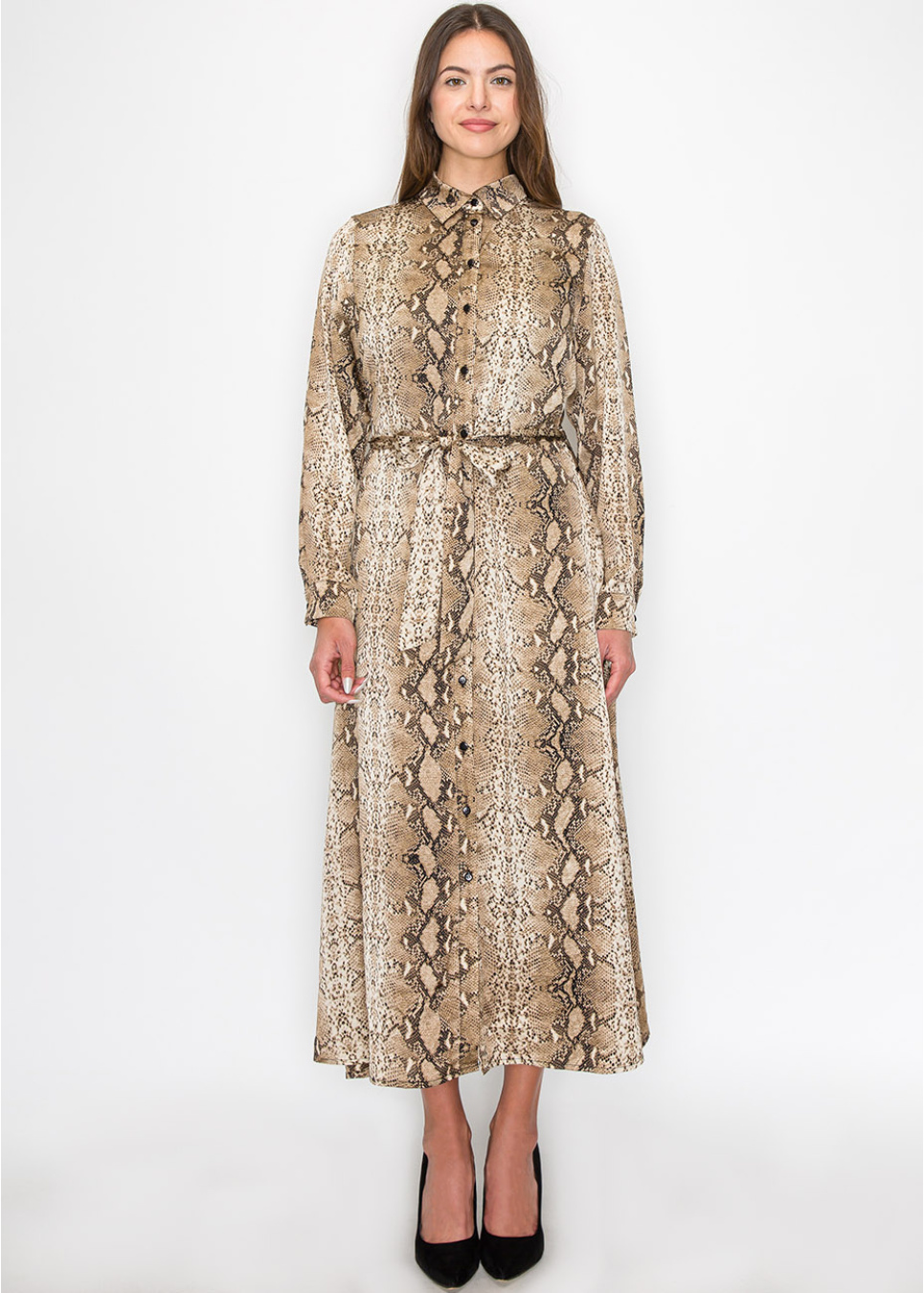 Designed with a striking snake-print pattern, this dress adds a unique flair to your collection. The belted waist creates a flattering shape, while the button-up front offers versatility. The lightweight fabric and modest cut make it an easy choice for daily wear or special occasions, without compromising on comfort or modesty.