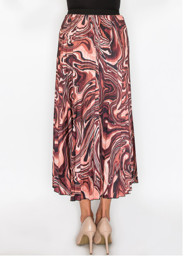Bold and artistic, this pleated skirt features a striking abstract swirl pattern in rich shades of burgundy and pink. The lightweight fabric and flowing pleats give it a graceful movement, perfect for adding a touch of personality to any outfit.