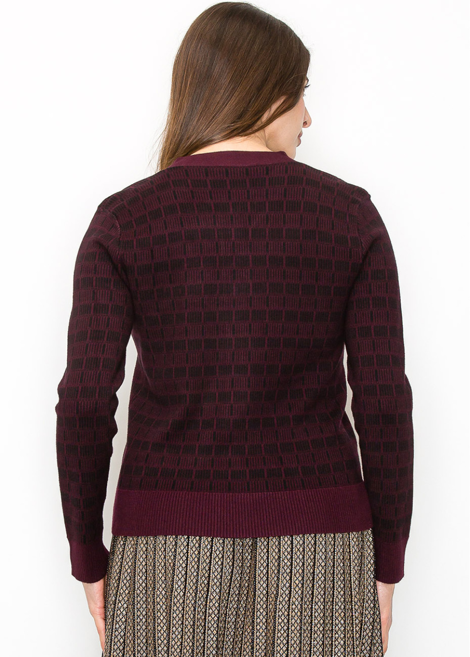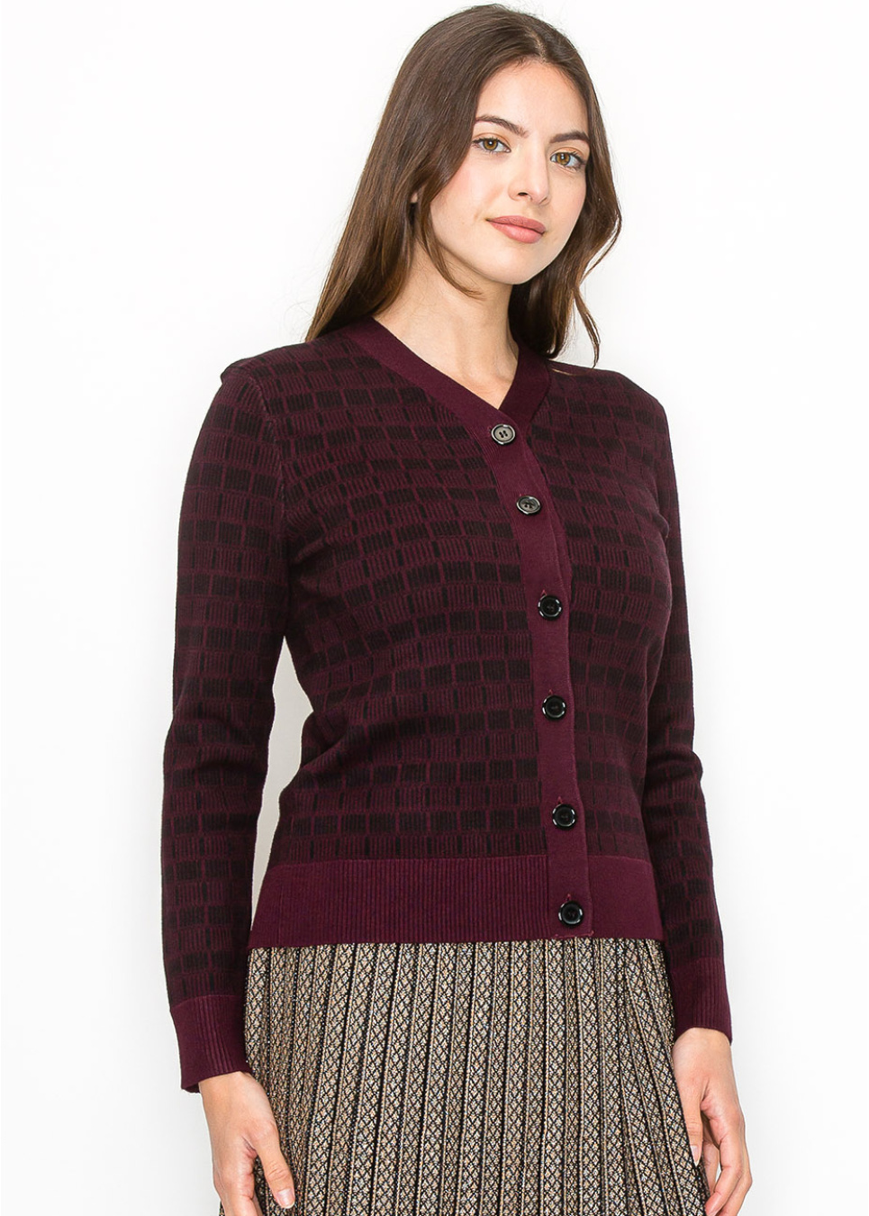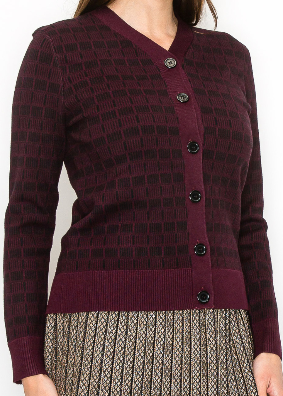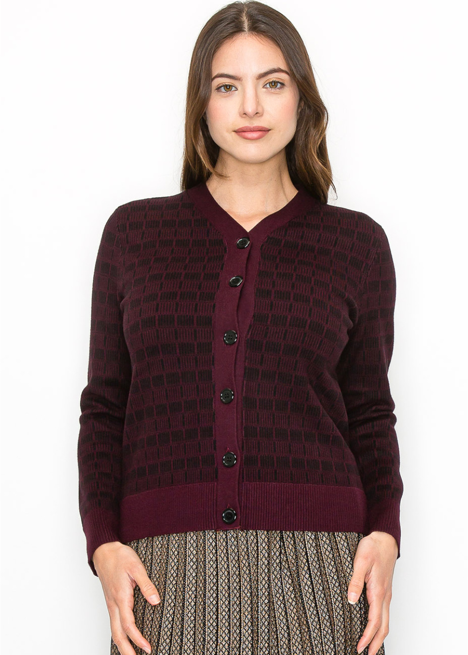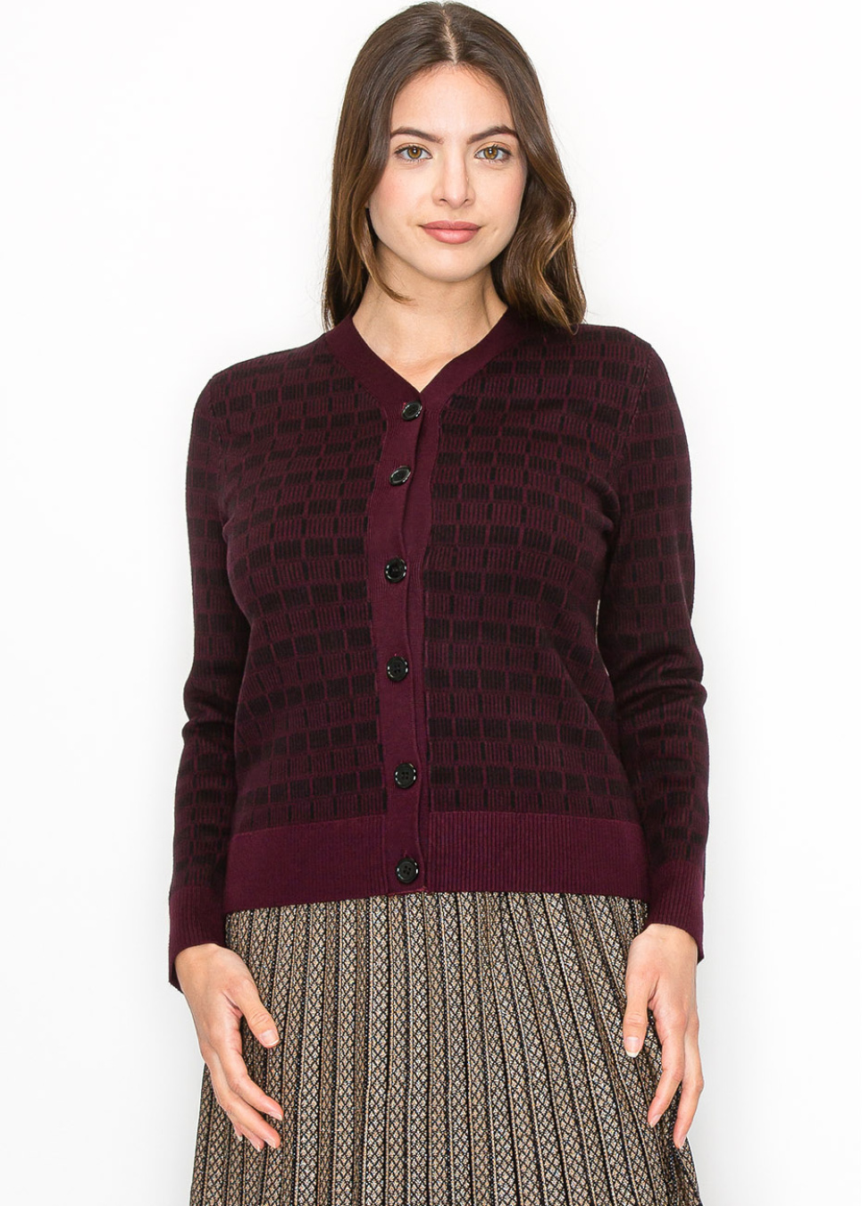 This beautiful burgundy cardigan showcases a subtle black checkered pattern that adds depth and texture. With a button-front design and long sleeves, it’s modest and versatile, ideal for layering on cooler days. The ribbed hem and cuffs give it a refined finish, making it perfect for casual or dressy occasions.