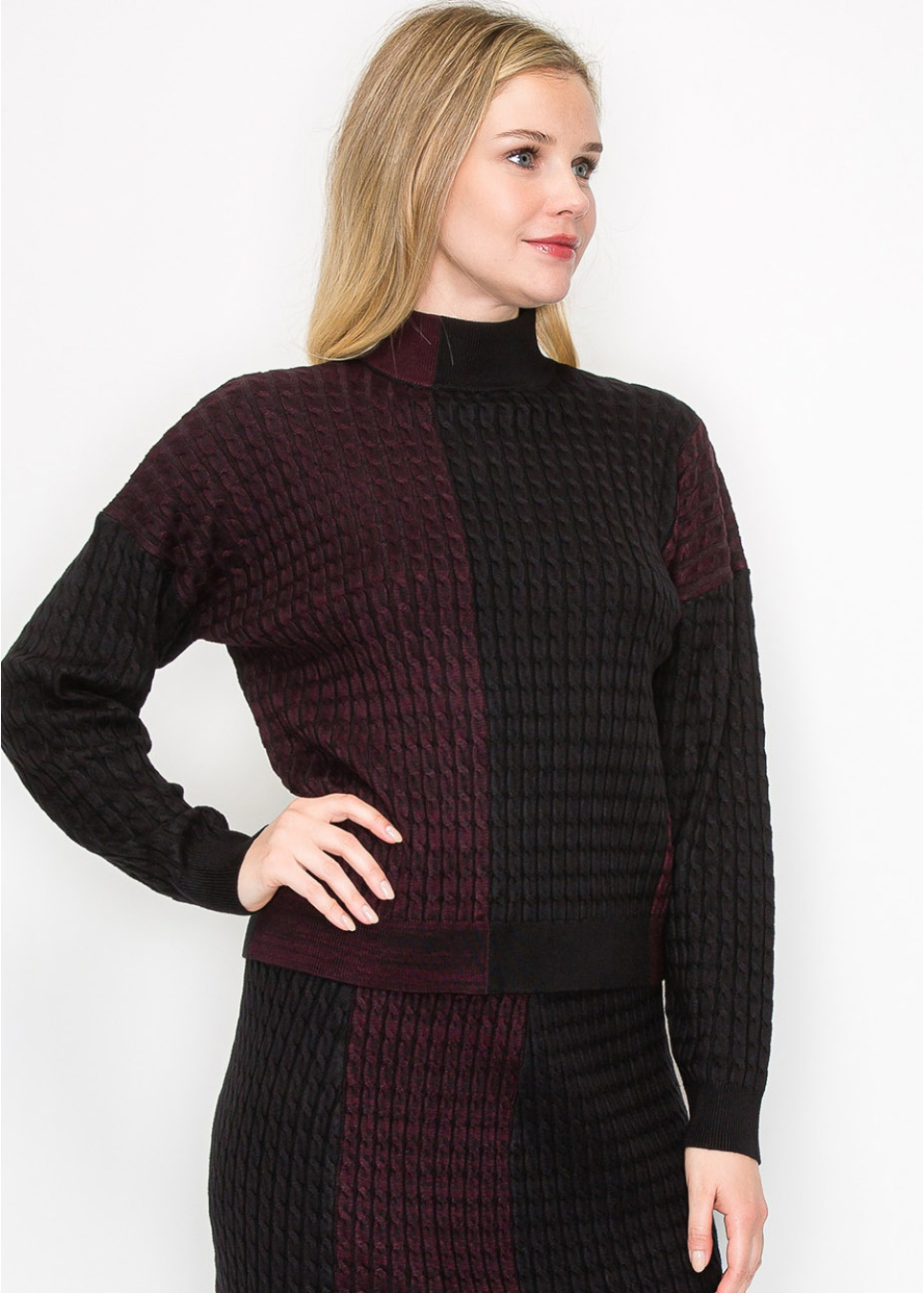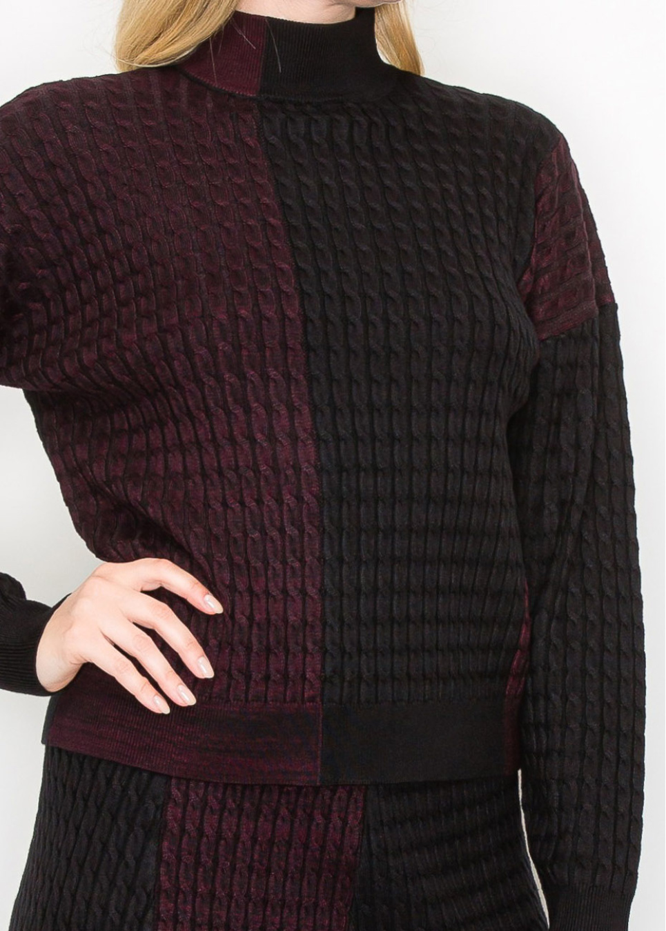 This striking turtleneck sweater features a bold colorblock design with rich burgundy and deep black hues. The cable knit fabric is soft and cozy, providing warmth while maintaining a sophisticated look.