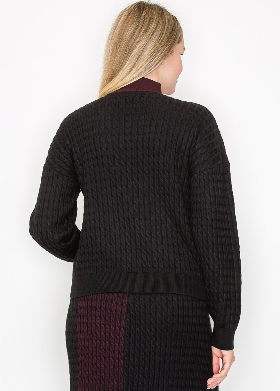 Burgundy and Black Colorblock Cable Knit Sweater