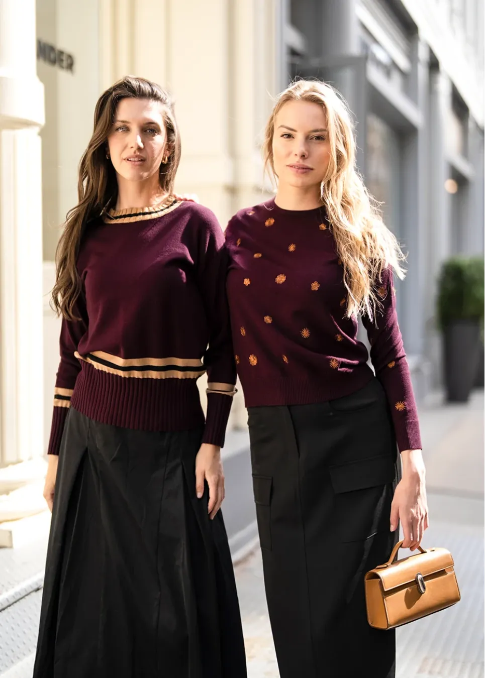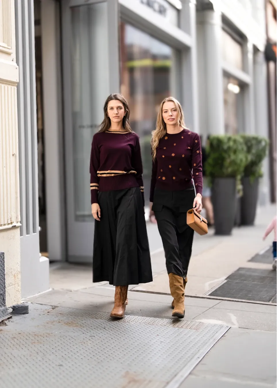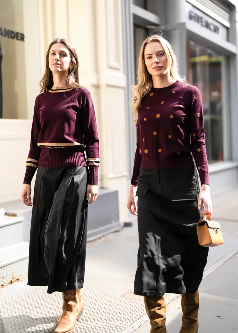 Deep wine tones and utility-inspired details meet in this refined outfit. The embroidered sweater adds a feminine touch to the clean-lined skirt for a look that works from day to night.