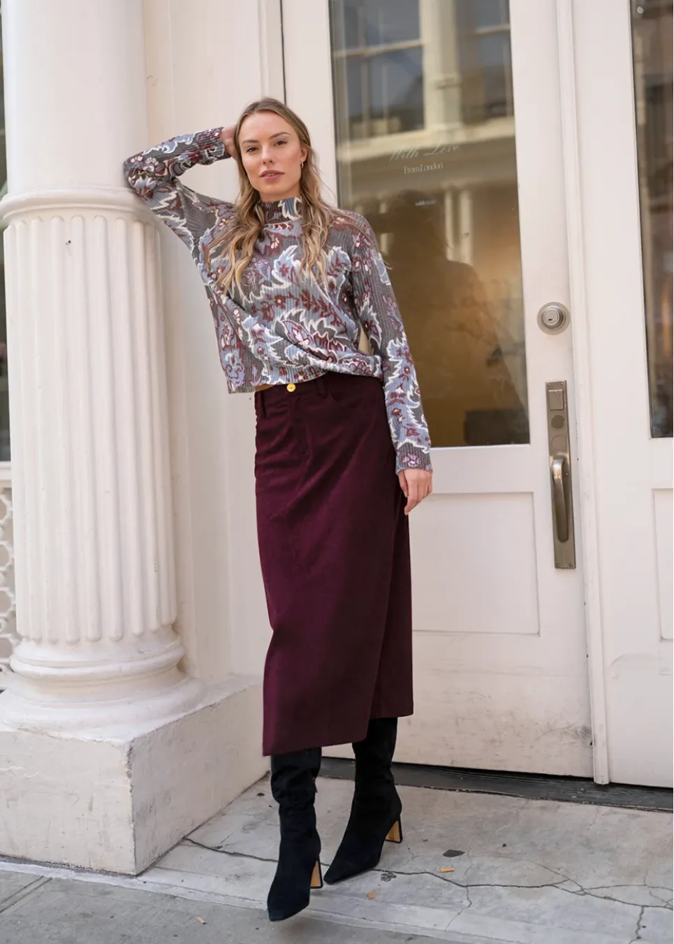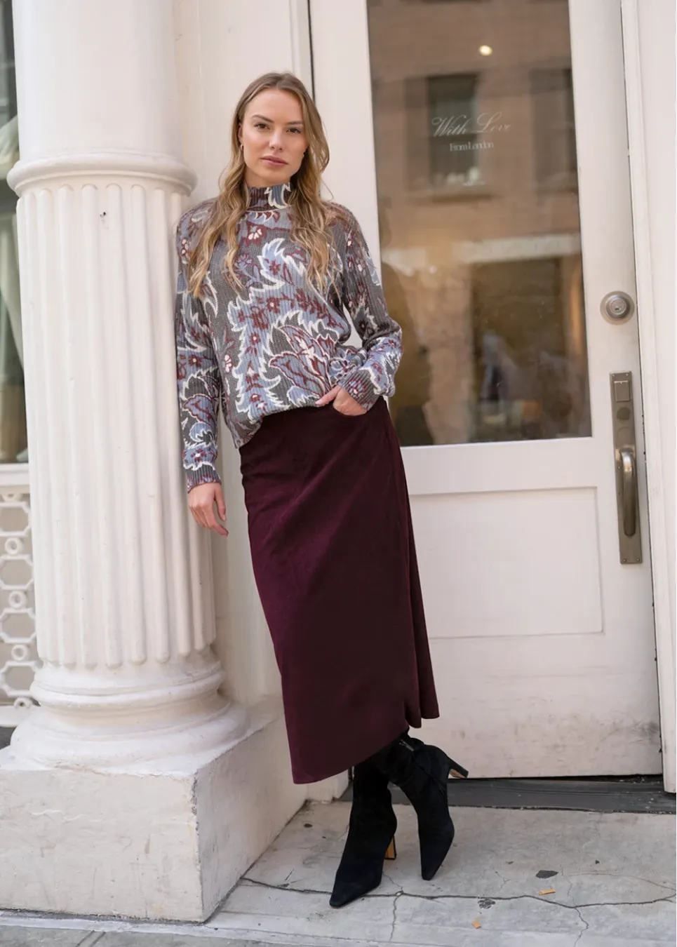 This sweater feels like a piece of art, paired with a wine-colored skirt you’ll reach for on repeat. A look that’s as cozy as it is eye-catching.