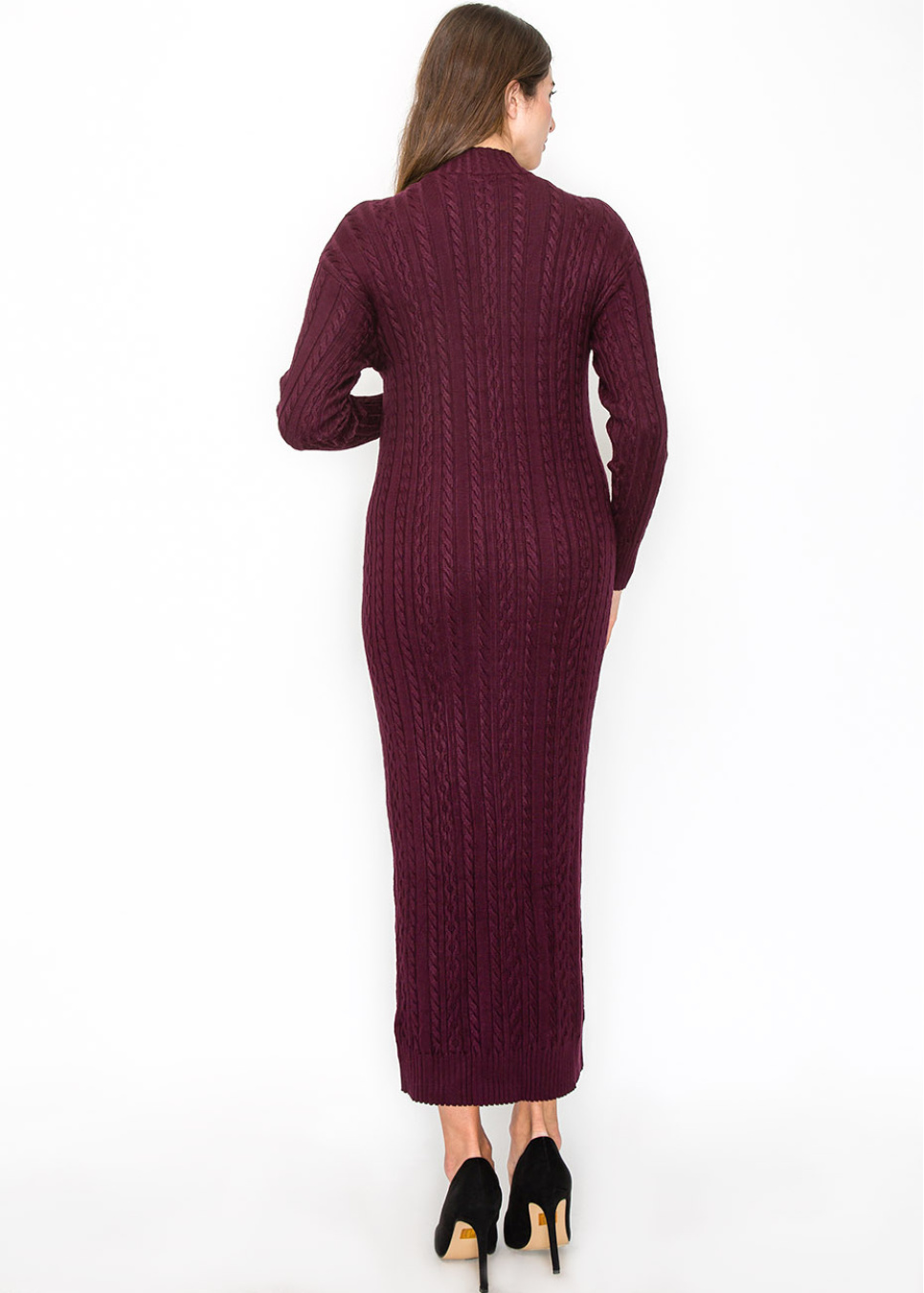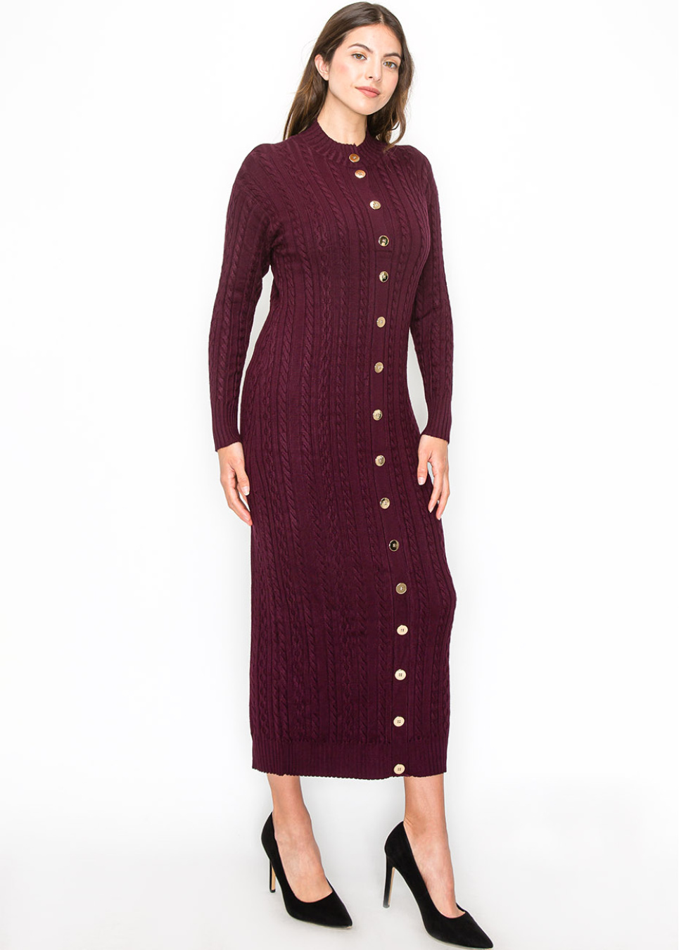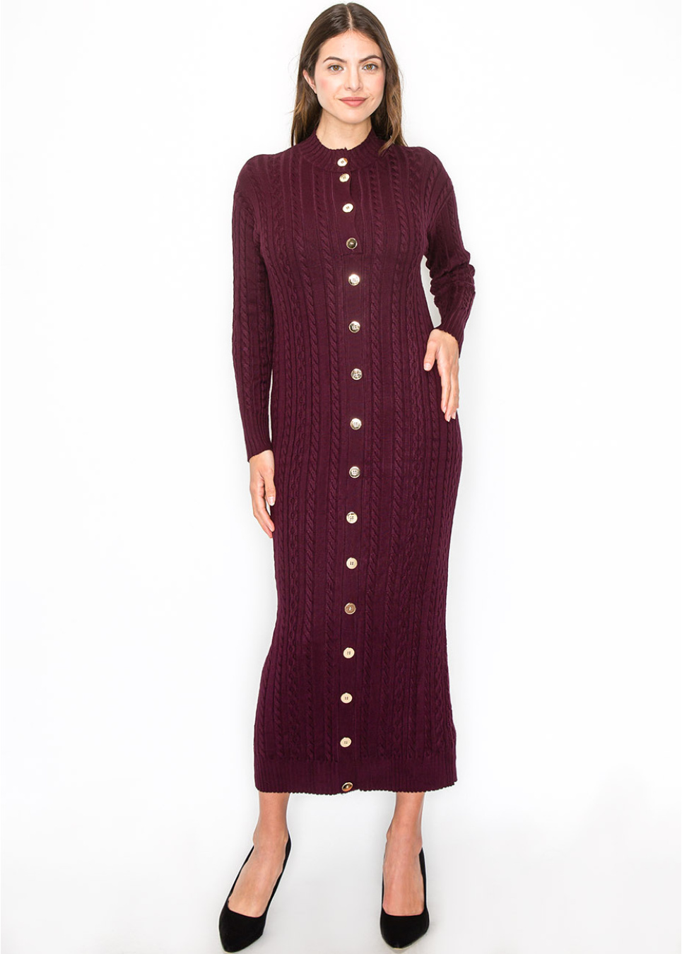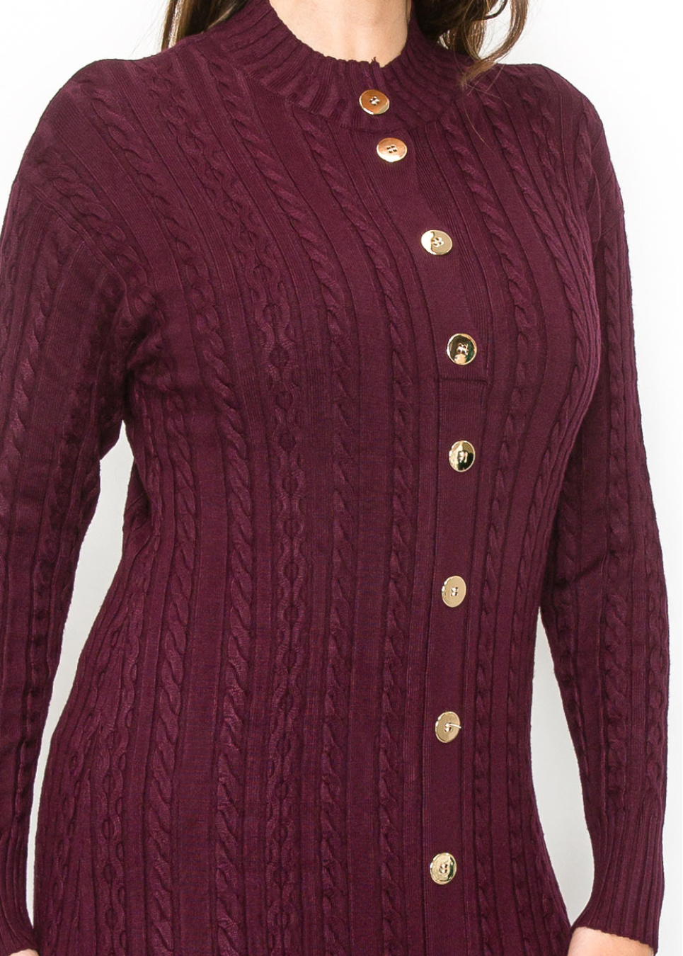 A gorgeous plum color gives this knit dress a vibrant, polished feel. The cable-knit texture and gold buttons lend sophistication, while the longline design ensures a flattering, modest fit. This dress transitions easily from day to night, making it a must-have addition to your fall wardrobe.
