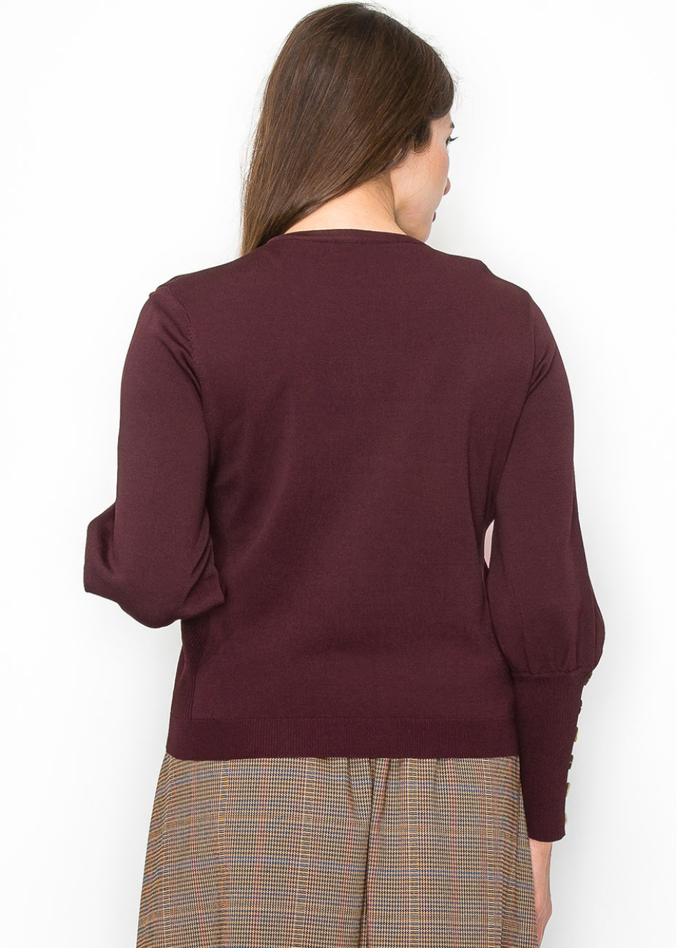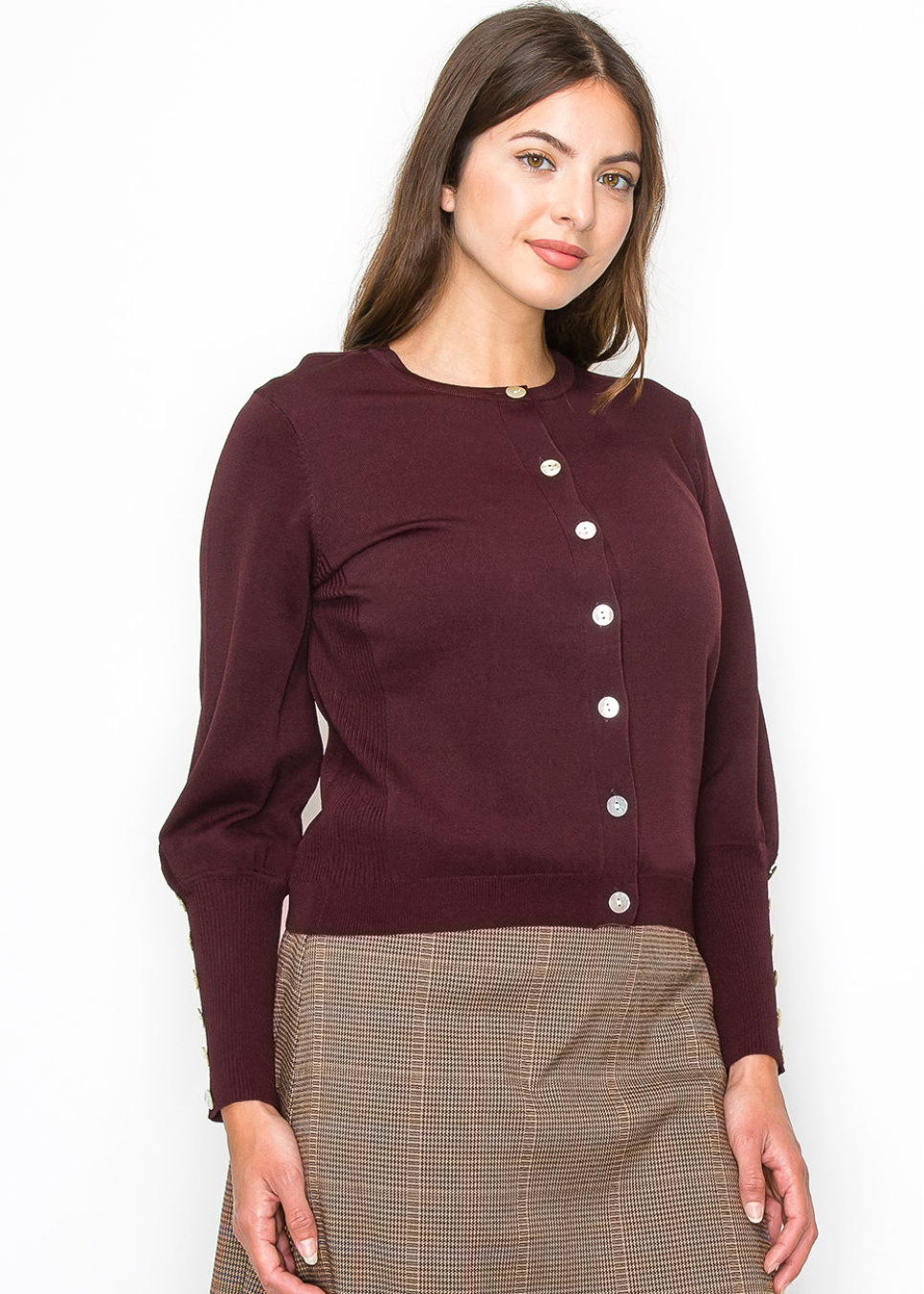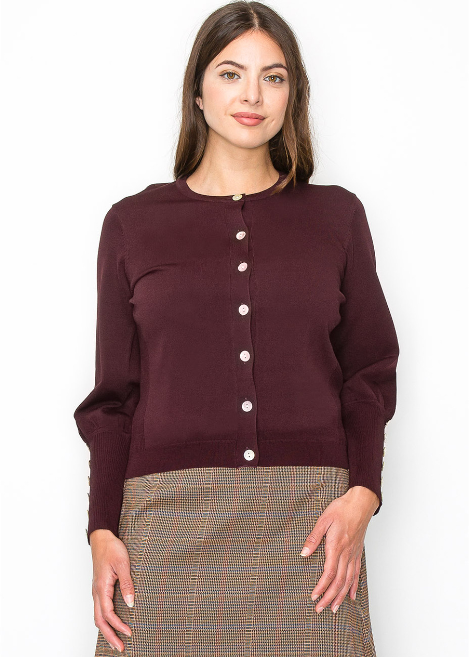 Subtle yet striking, this burgundy knit cardigan is adorned with statement buttons down the sleeves, adding a touch of flair to an otherwise classic design. The soft knit and comfortable fit make it ideal for layering, while the button details offer a refined, sophisticated style.