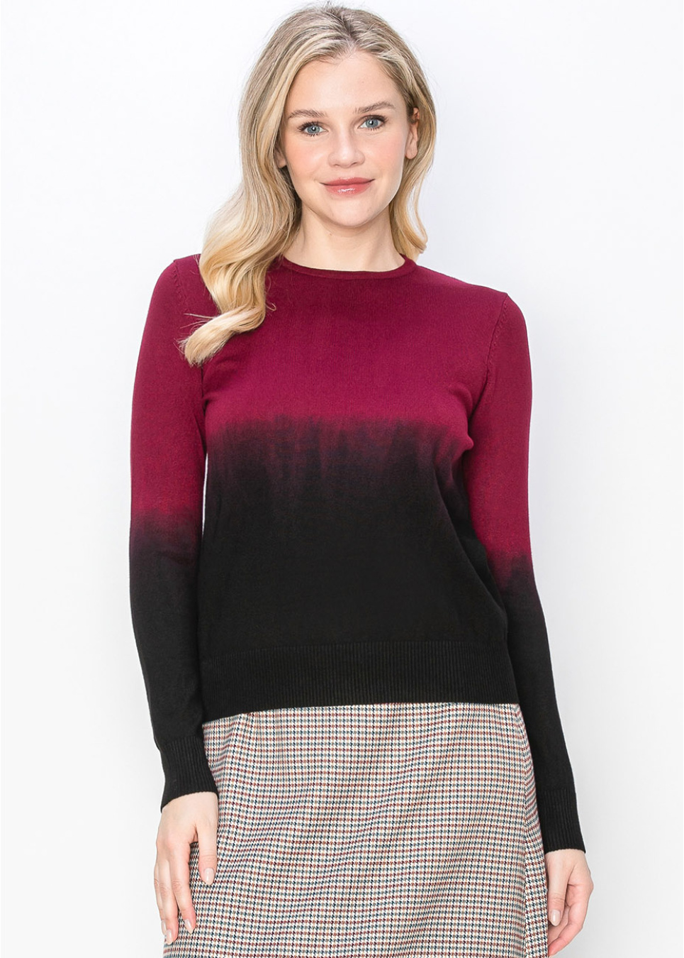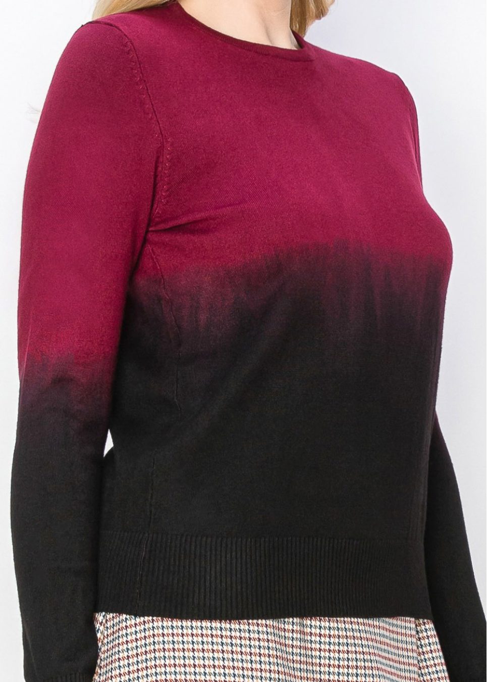 Featuring a beautiful gradient from burgundy to black, this sweater offers a unique look that’s both eye-catching and modest. The ribbed cuffs and hem keep it comfortable, while the long sleeves provide warmth. It’s a versatile piece that can be dressed up or down.