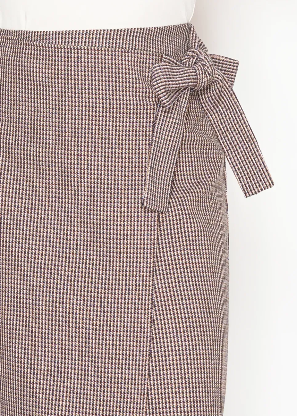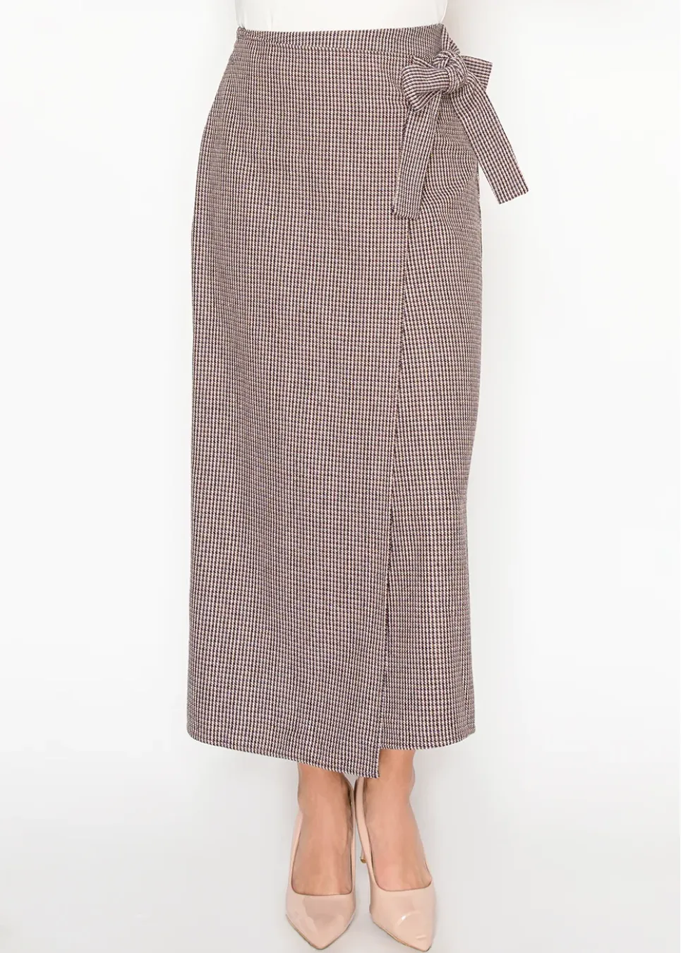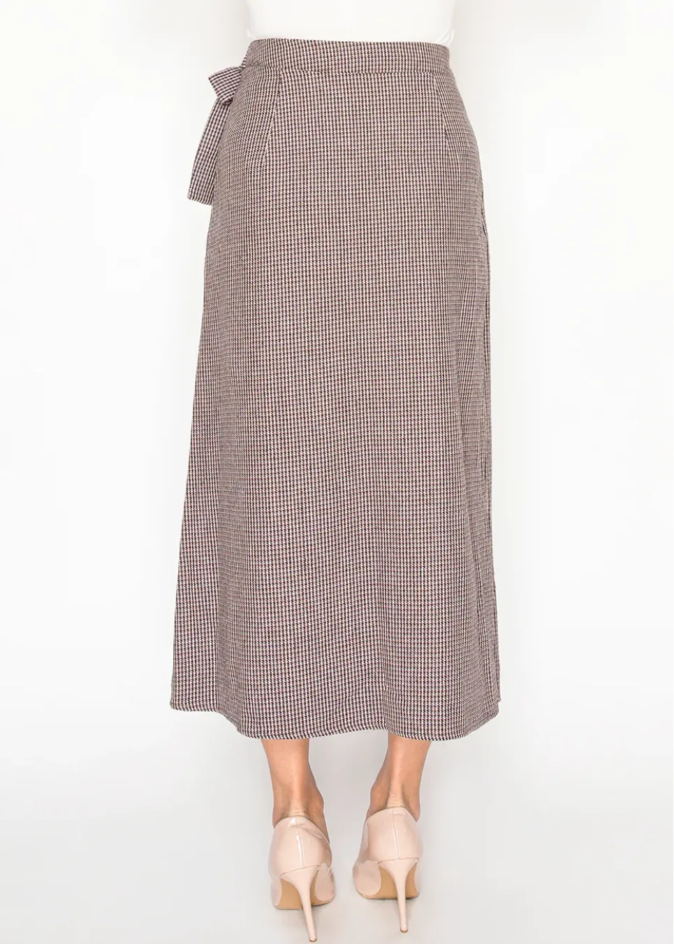 A chic wrap midi skirt in a burgundy houndstooth pattern, finished with a side bow tie. Versatile for work or weekends, it pairs effortlessly with blouses or knits.