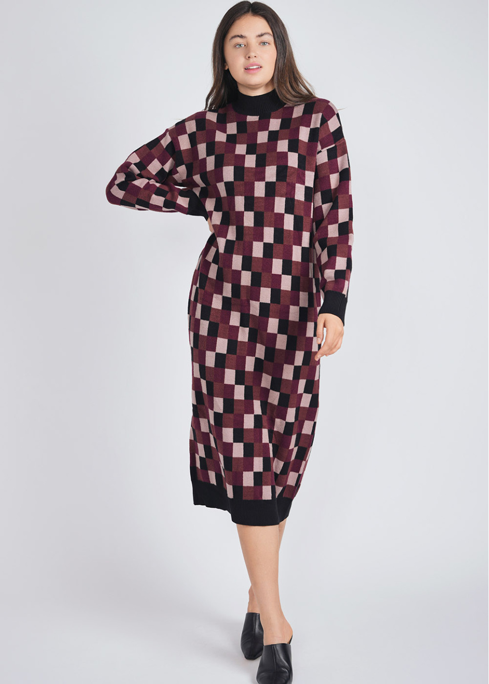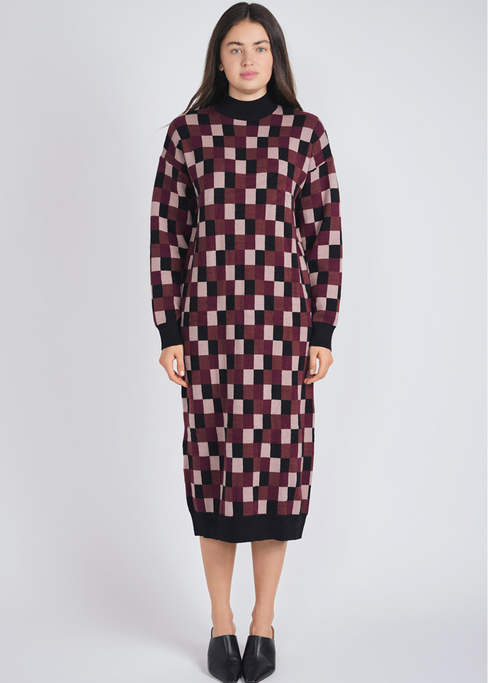 Burgundy Knit Dream: Dress with Classic Check Pattern